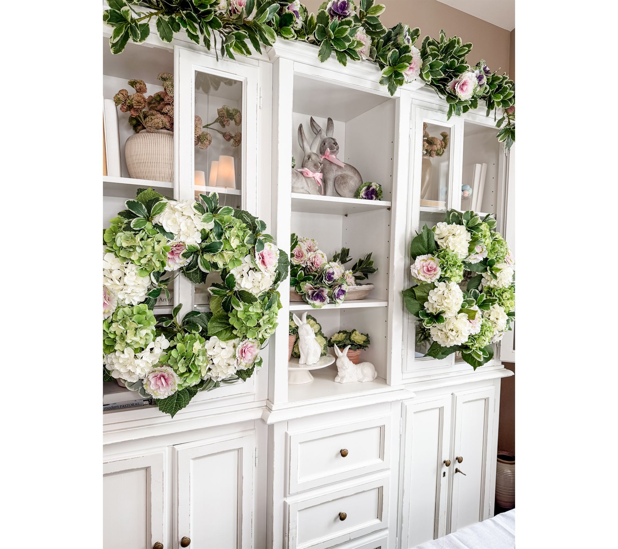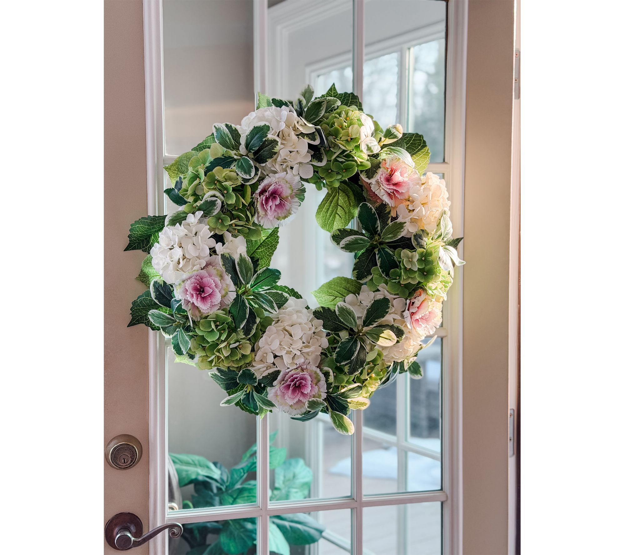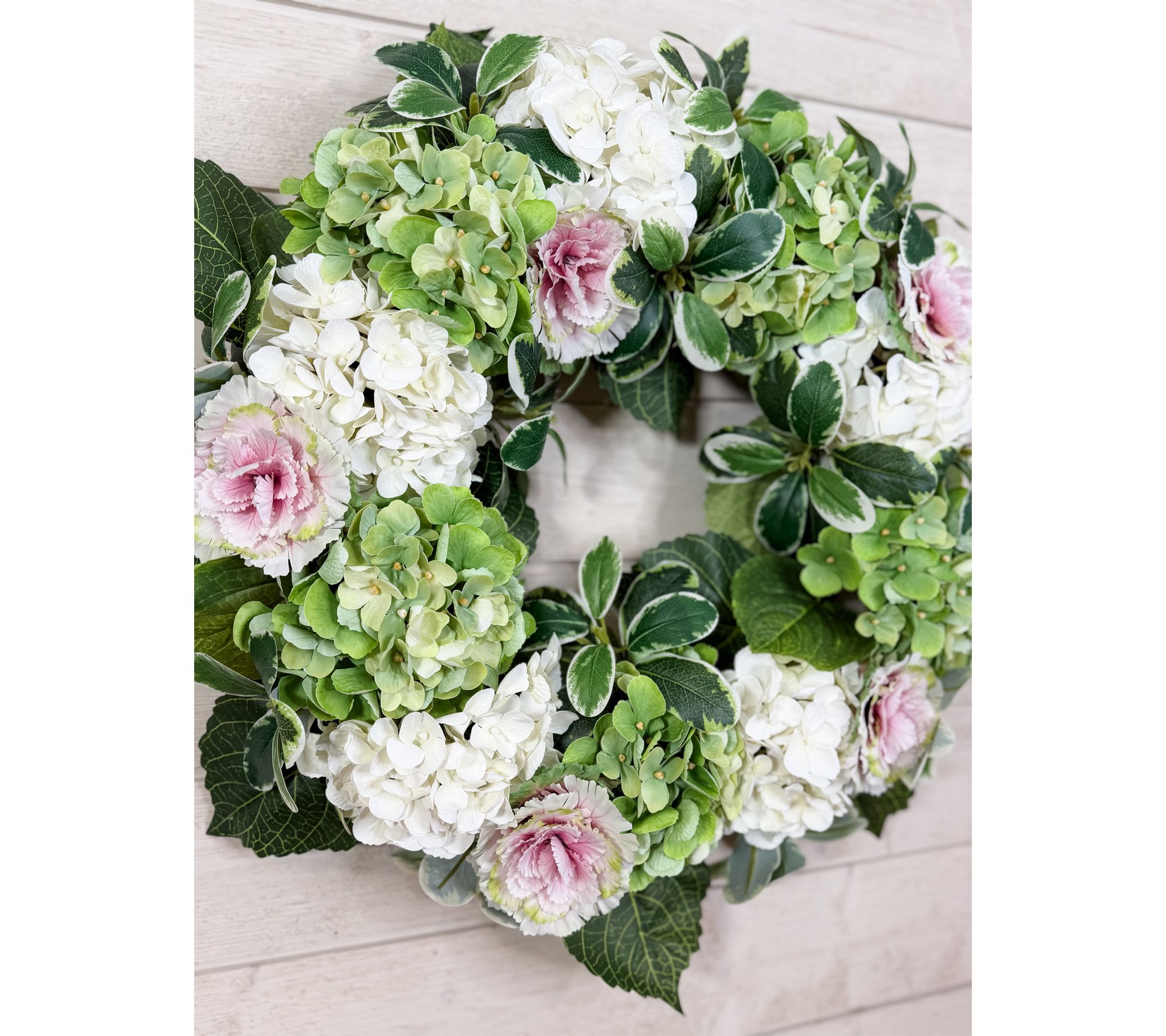Real Touch hydrangea wreath with mini cabbages and variegated pittosporum greens
