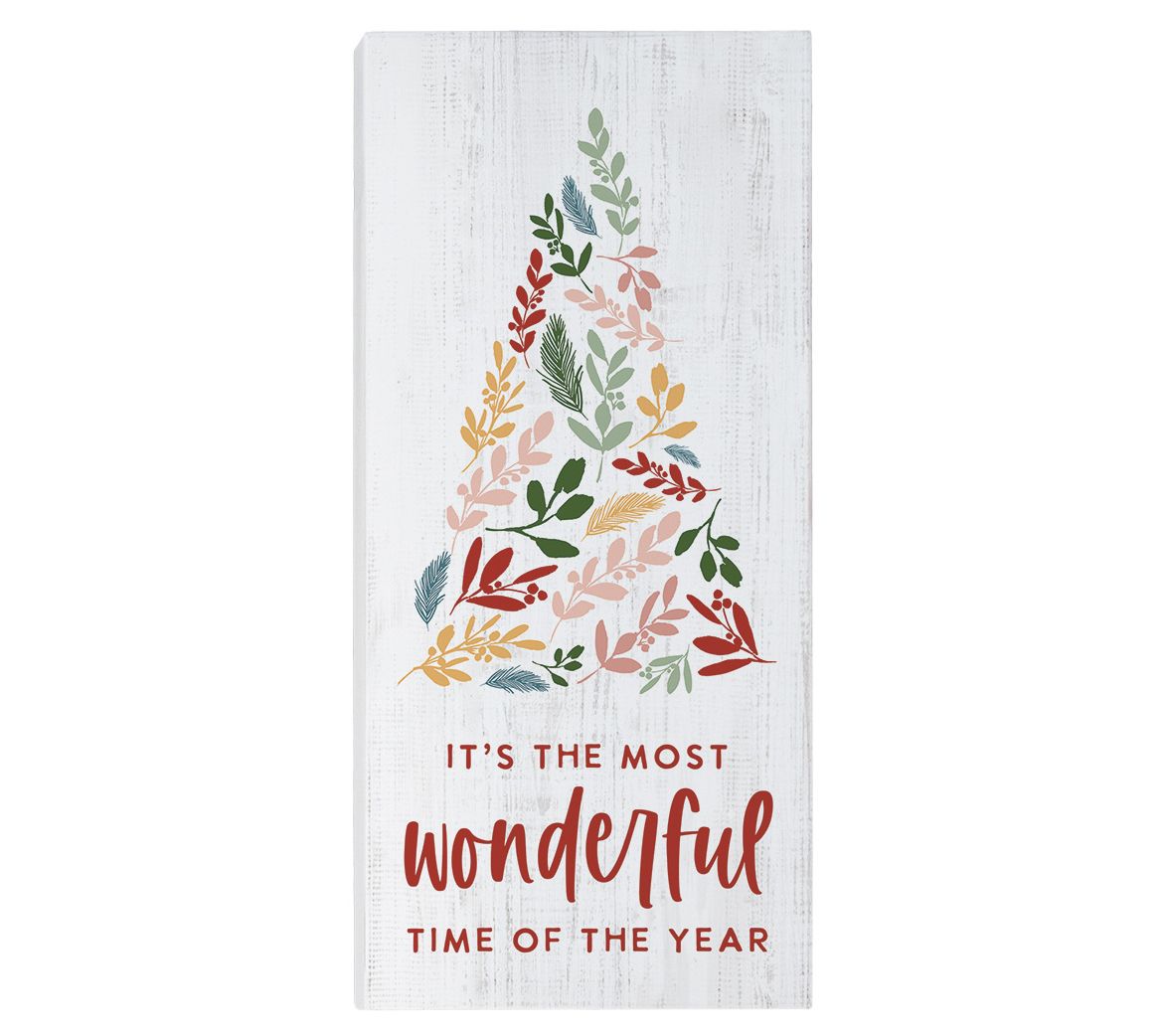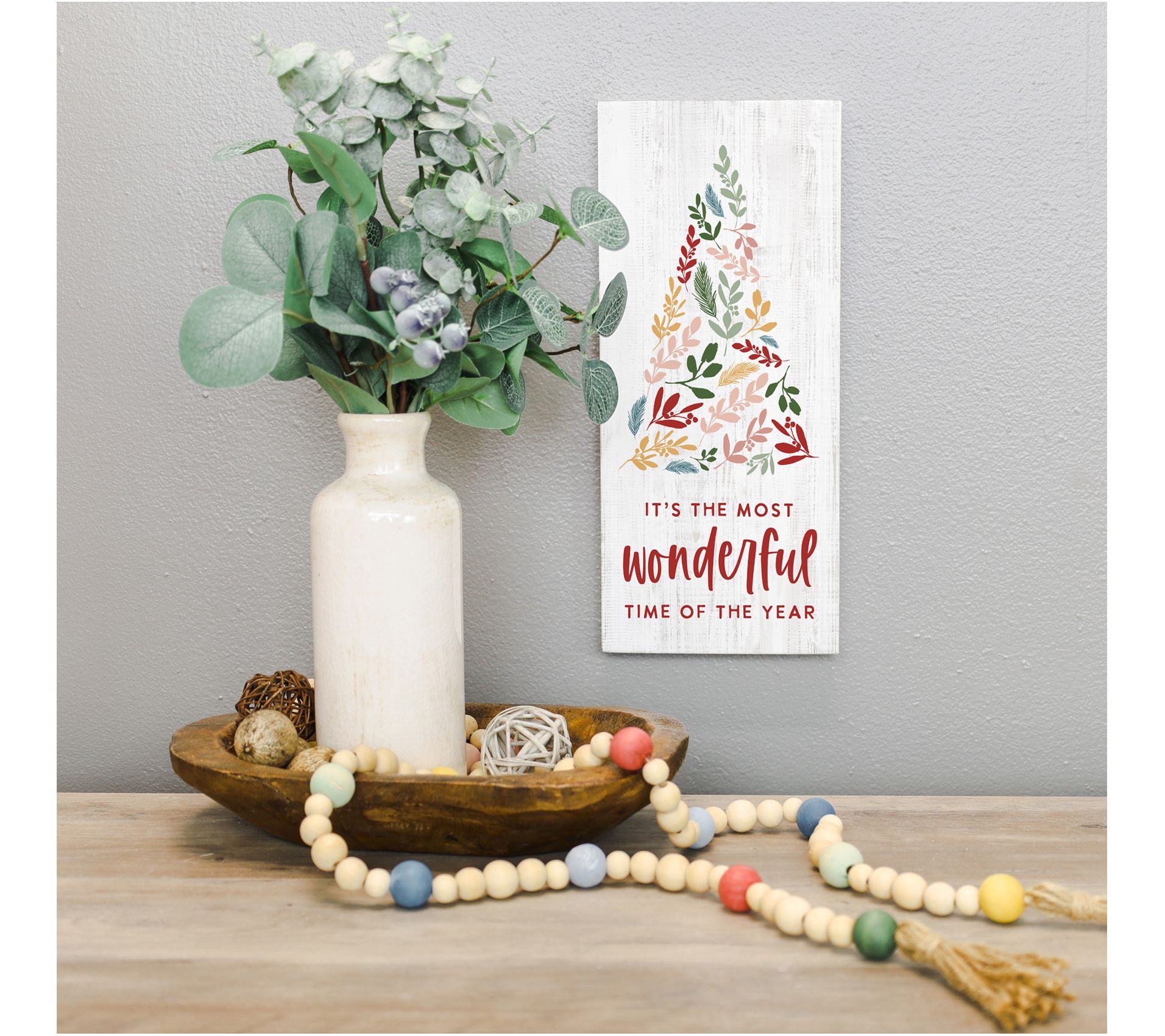 Celebrate the most wonderful time of the year with the Sincere Surroundings Wonderful Colorful Tree Inspire Board, featuring a holiday tree created from tree and leaf stems in vibrant hues on a whitewashed board. With a heartwarming message printed below in red ink, this solid wood piece can be displayed on a wall or rested on a table or shelf to add a festive touch to your home. From Sincere Surroundings.