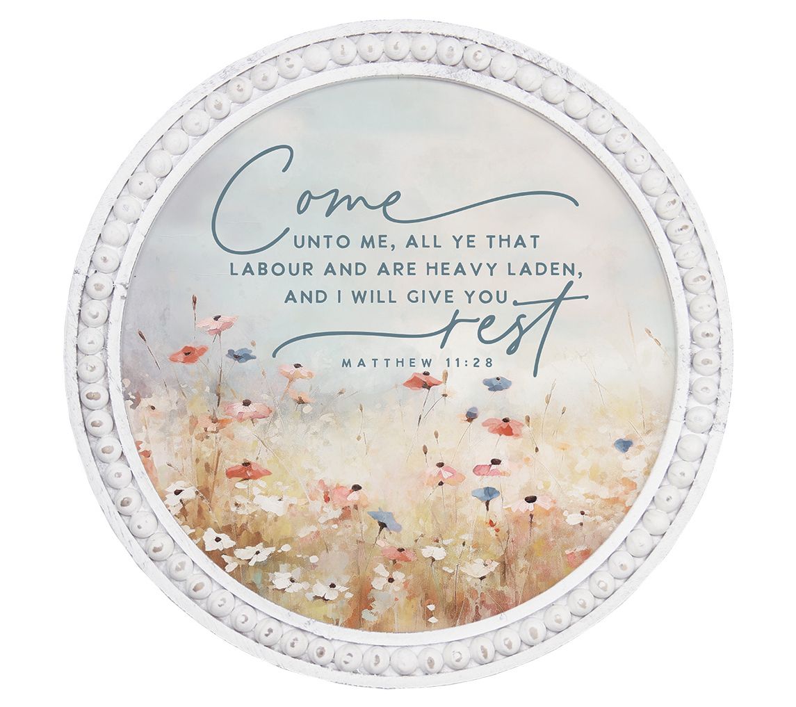Refresh your dcor with this inspiring beaded art, featuring the heartfelt words of Matthew 11:28. Perfect for adding a touch of warmth and encouragement to any room, this piece is great for wall hanging with its convenient keyhole on the back. From Sincere Surroundings.