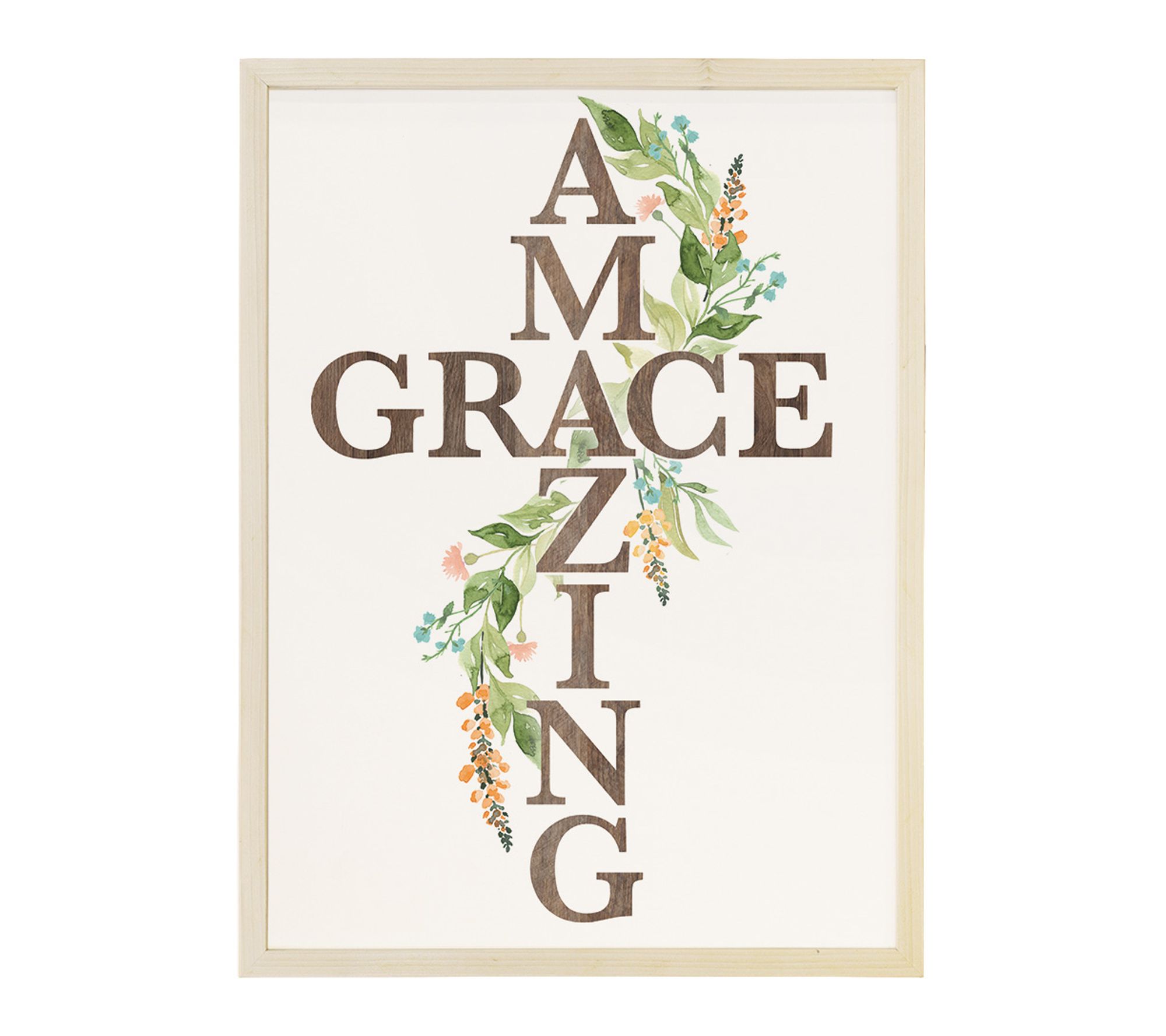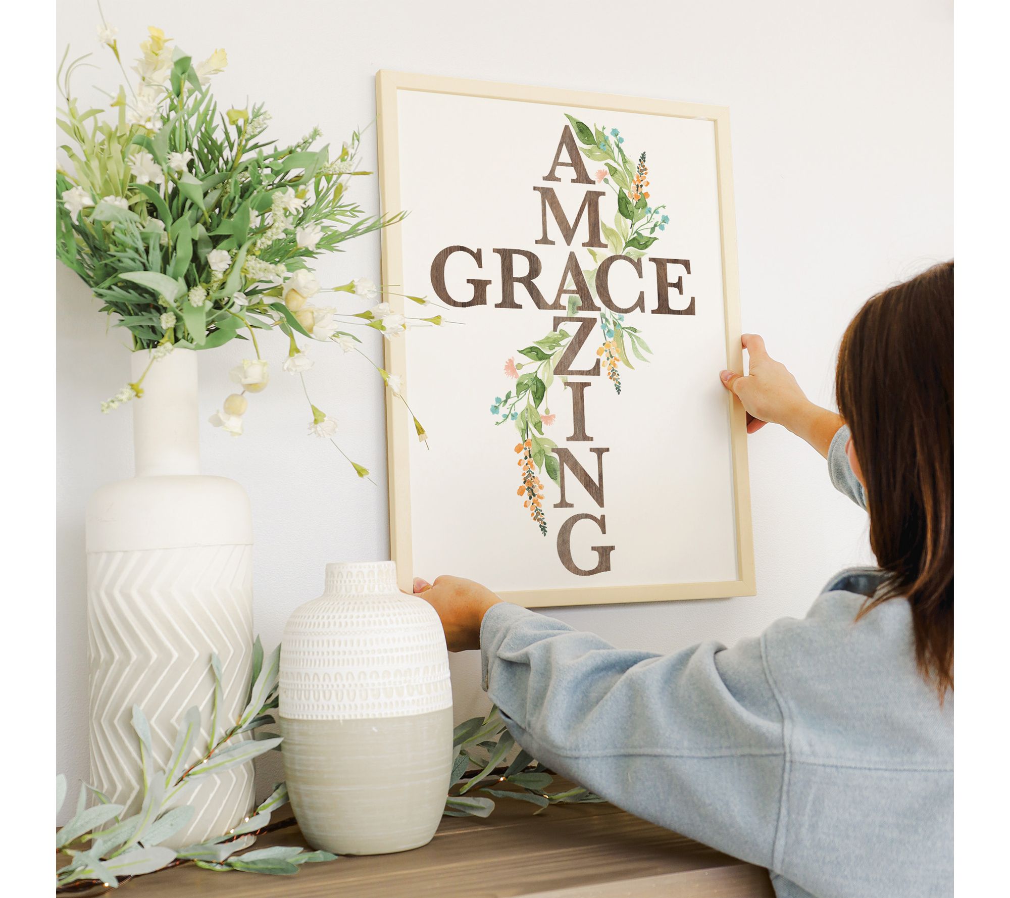 Let the inspiring message of "Amazing Grace" bring a sense of peace and gratitude to your living space with this elegant wall hanging. Featuring a cross-shaped design and crafted with a high-quality pine frame, it fits beautifully above a mantel or as a serene accent on any tabletop. From Sincere Surroundings.