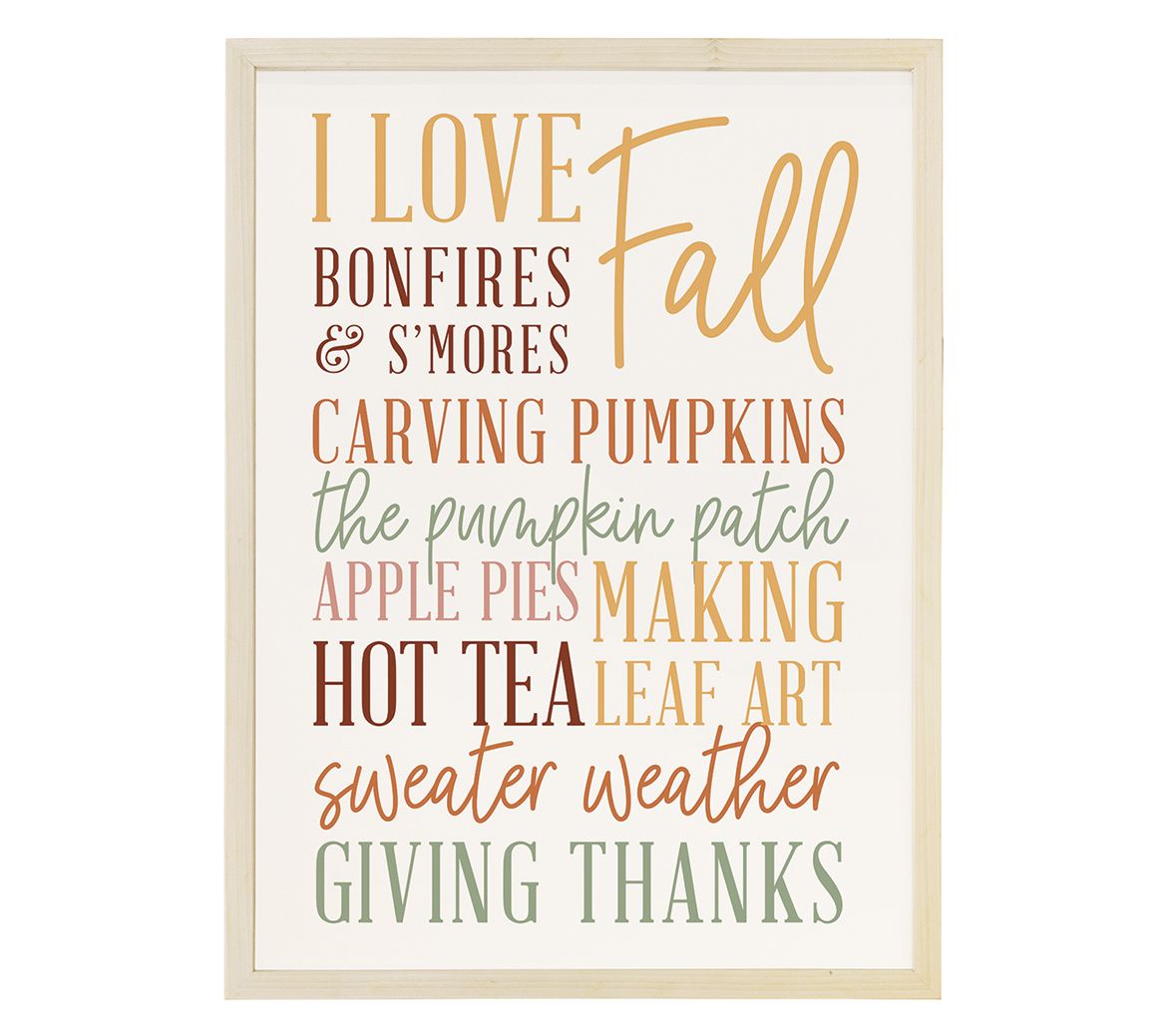 Celebrate all your favorite autumn moments with this charming wall hanging, featuring playful nods to bonfires, pumpkin carving, apple pies, and more. A slim pine frame and MDF backdrop give it a polished look, and its versatile design lets you hang it or display it on a tabletop to bring cozy fall vibes to any room. From Sincere Surroundings.