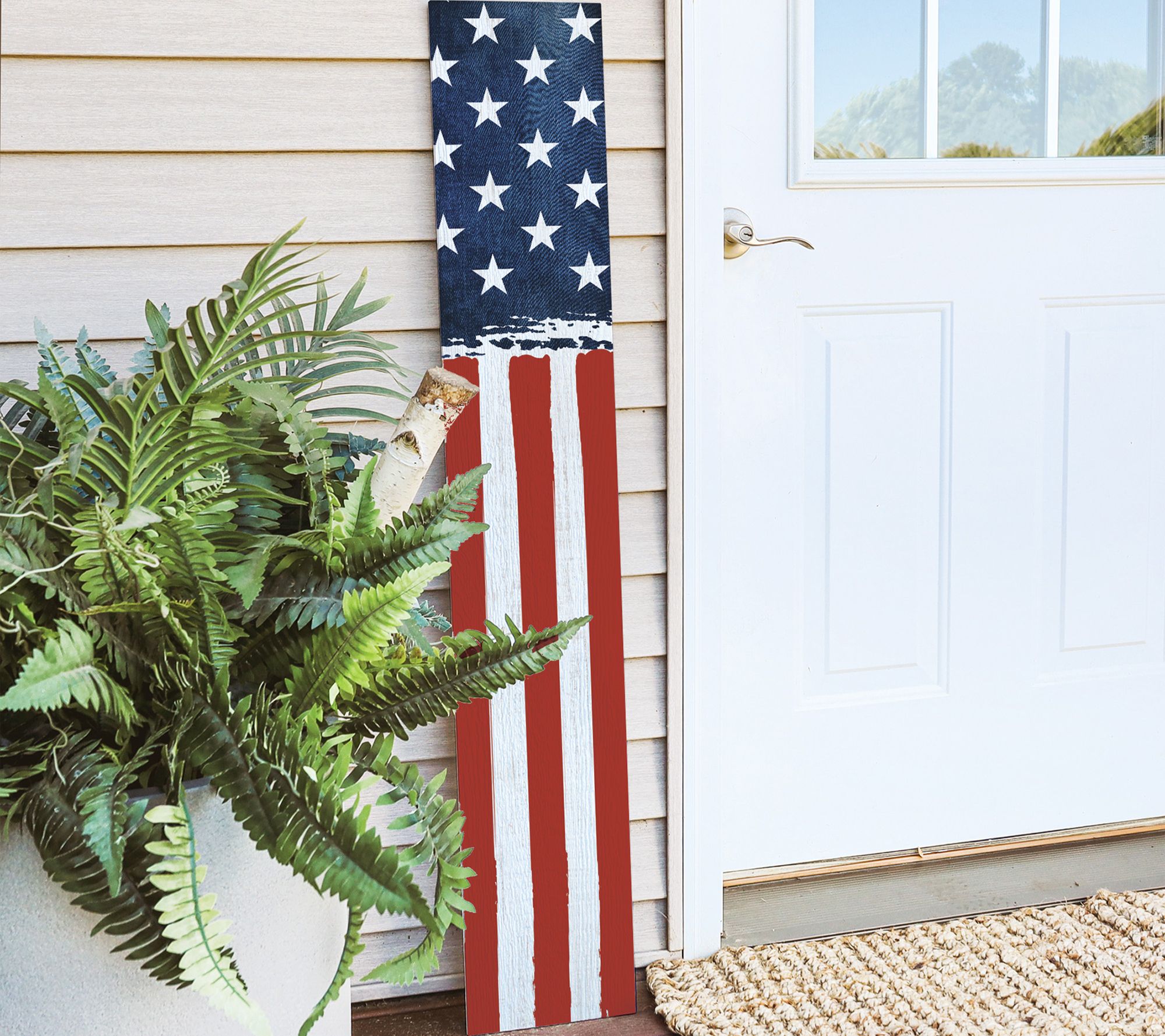 Show your patriotic spirit on your front porch or entryway with this vibrant American flag wall hanging. The colorful printed design welcomes guests with a touch of Americana, adding a cheerful accent to any gathering or summer celebration. From Sincere Surroundings.