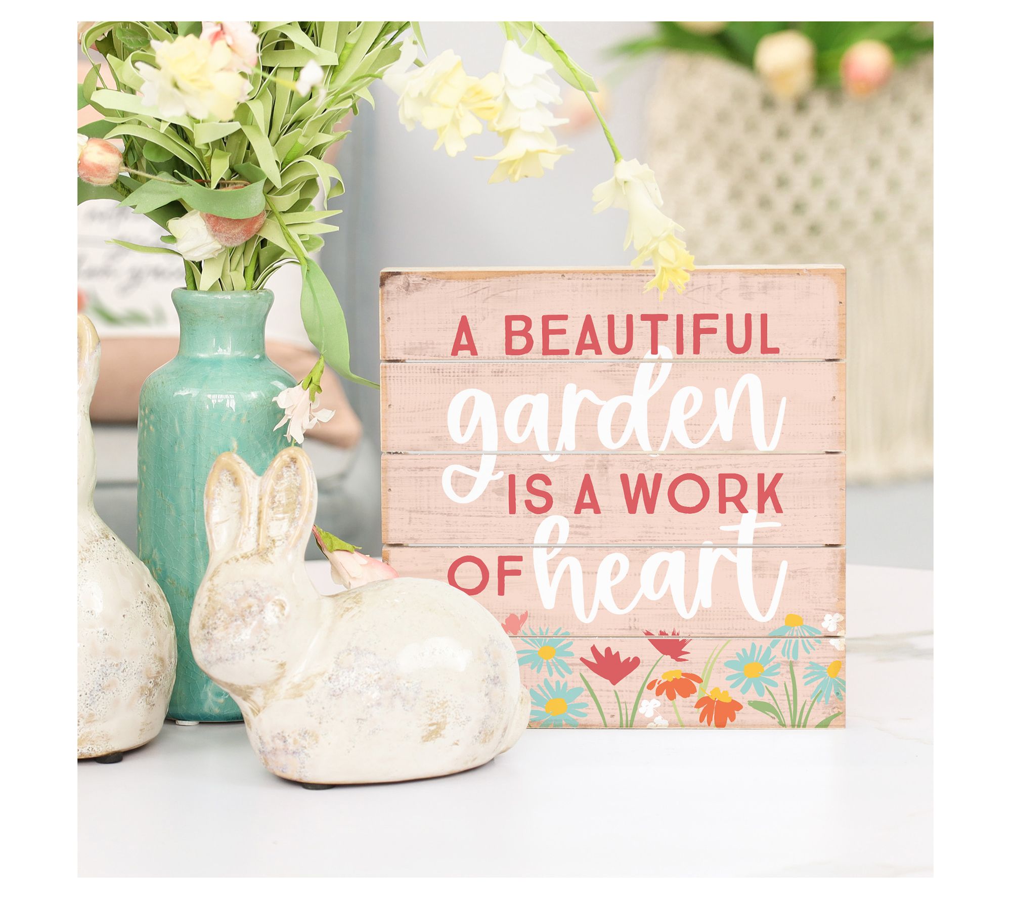 Brighten up your space with this delightful wooden pallet sign, which features the heartwarming message "A beautiful garden is a work of heart" against a peach-colored background, embellished with vibrant spring flowers. Perfect for hanging on the wall or displaying on a tabletop or shelf. From Sincere Surroundings.