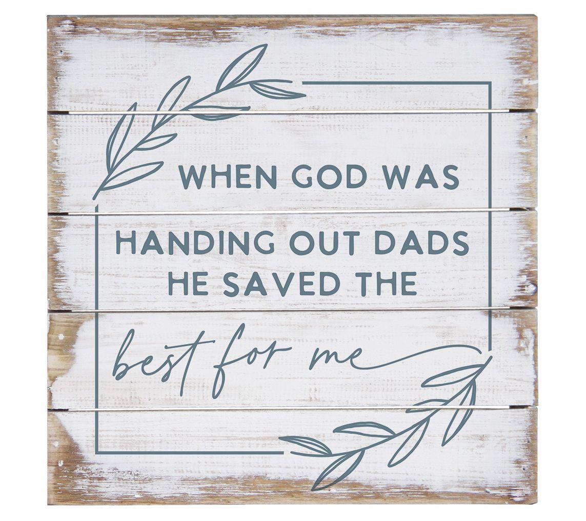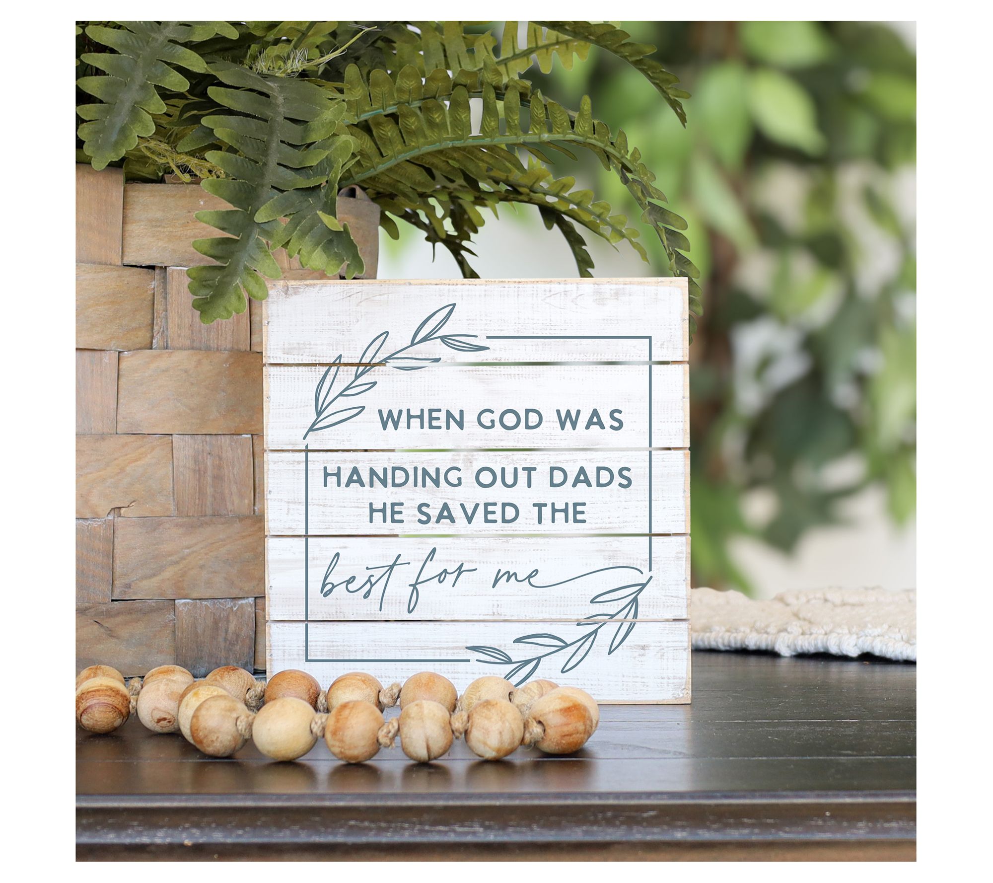 Celebrate the special bond with your dad with this Best For Me petite pallet art, featuring a heartfelt message and handsome imagery. This wall hanging combines a san serif and script font in a dusty blue tone, bordered by the outline of leafy figs, all set against a whitewashed wood texture. Perfect for letting Dad know just how much he means to you. From Sincere Surroundings.