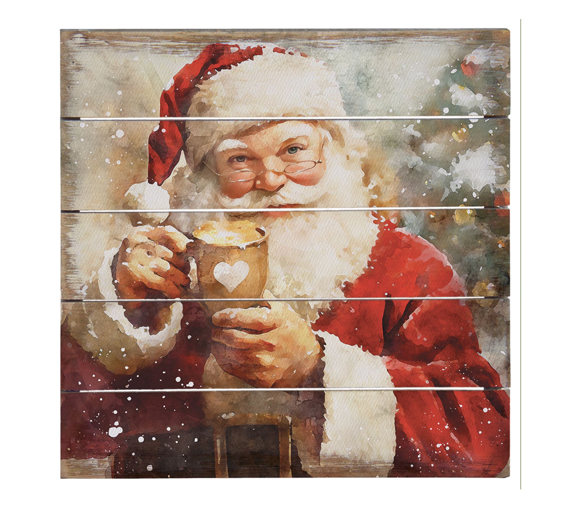 Santa brings cheerful warmth to your space with this whimsical watercolor wall hanging, capturing the sweet moment of savoring a mug of hot chocolate. Its versatile design lets you display it on a shelf or hang it on the wall, adding a festive spirit to your holiday decor. From Sincere Surroundings.