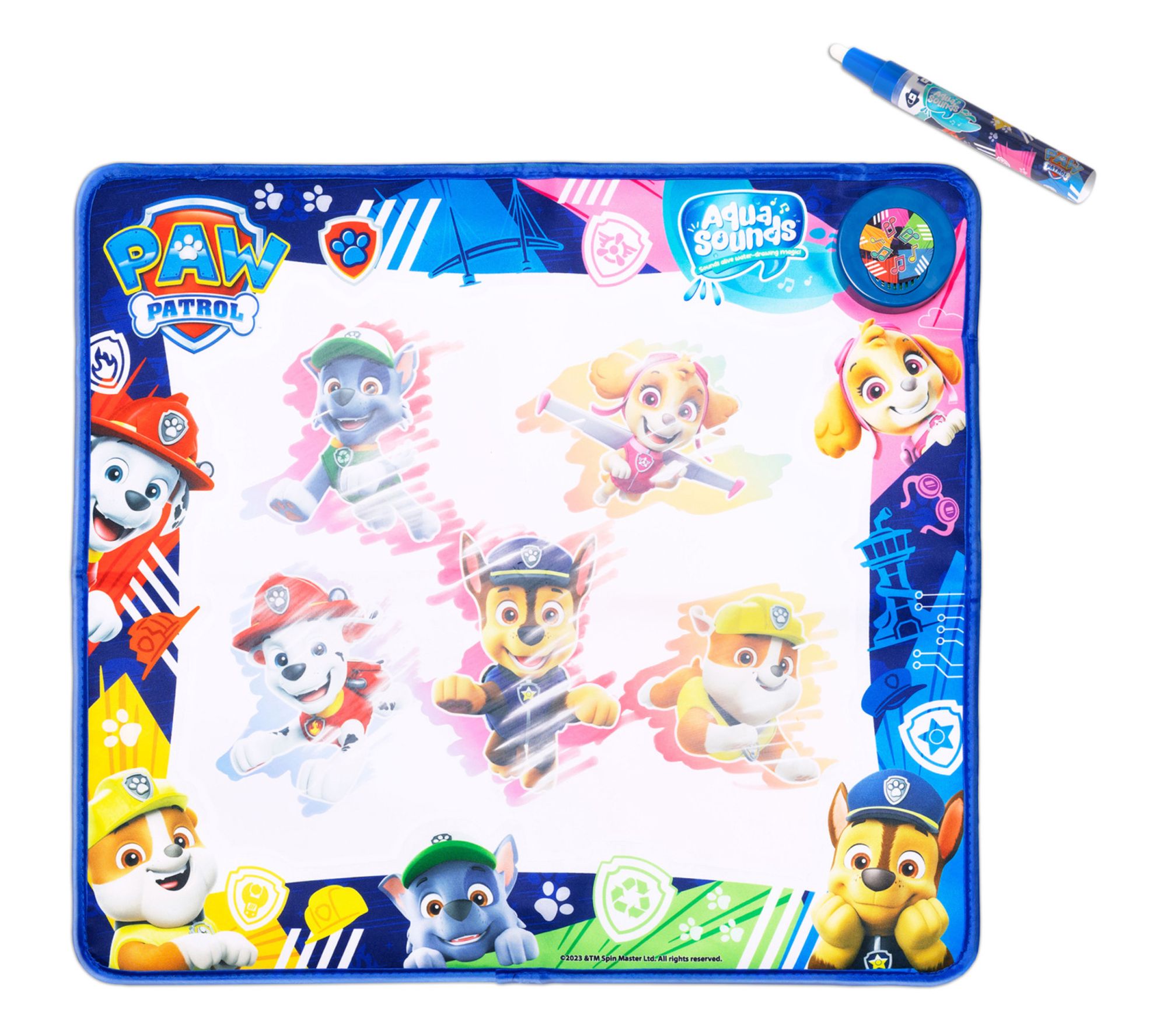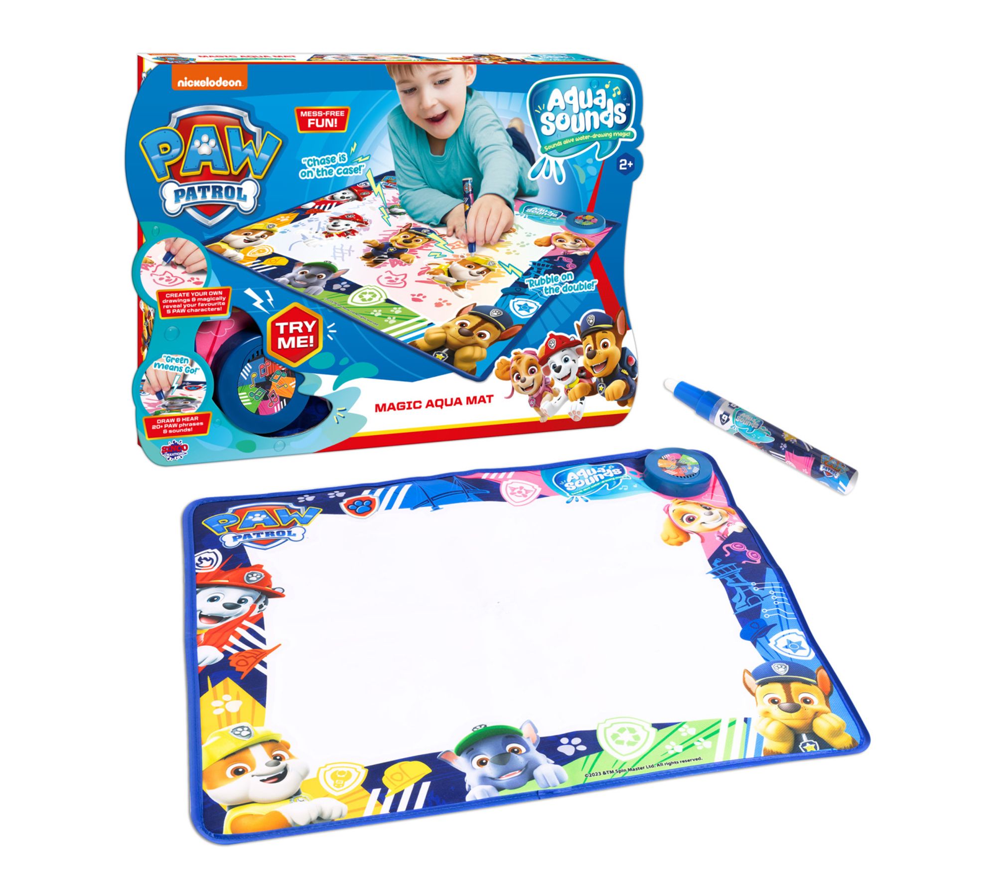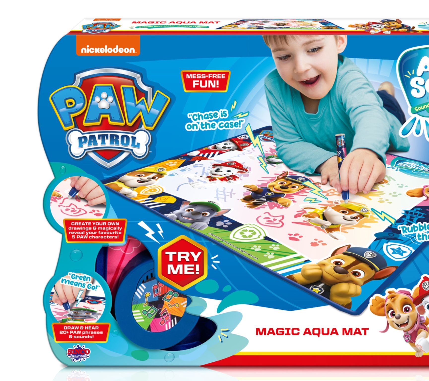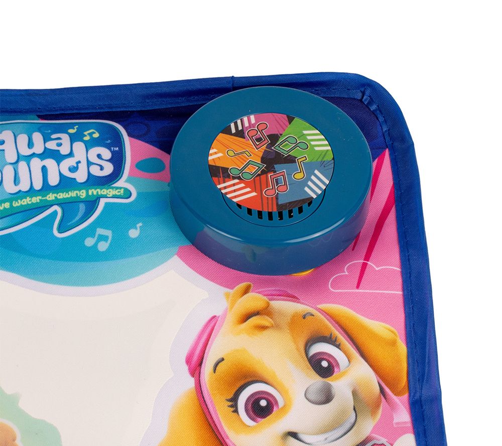 Create cherished memories with the Paw Patrol aqua sound mat. This delightful playmat encourages creativity with magical water-drawing that brings your child's favorite Paw Patrol characters to life with over 20 thrilling phrases and sounds. From Sinco.