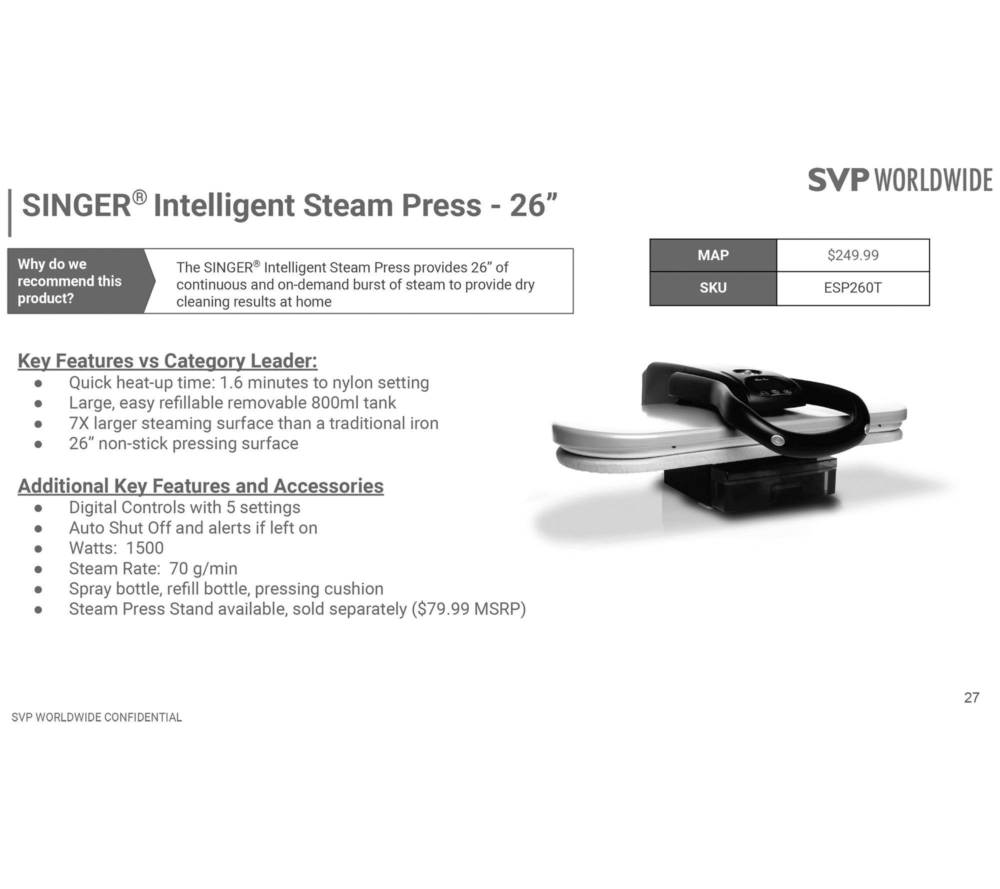 • Includes steam press, cushion, measuring cup, and spray bottle