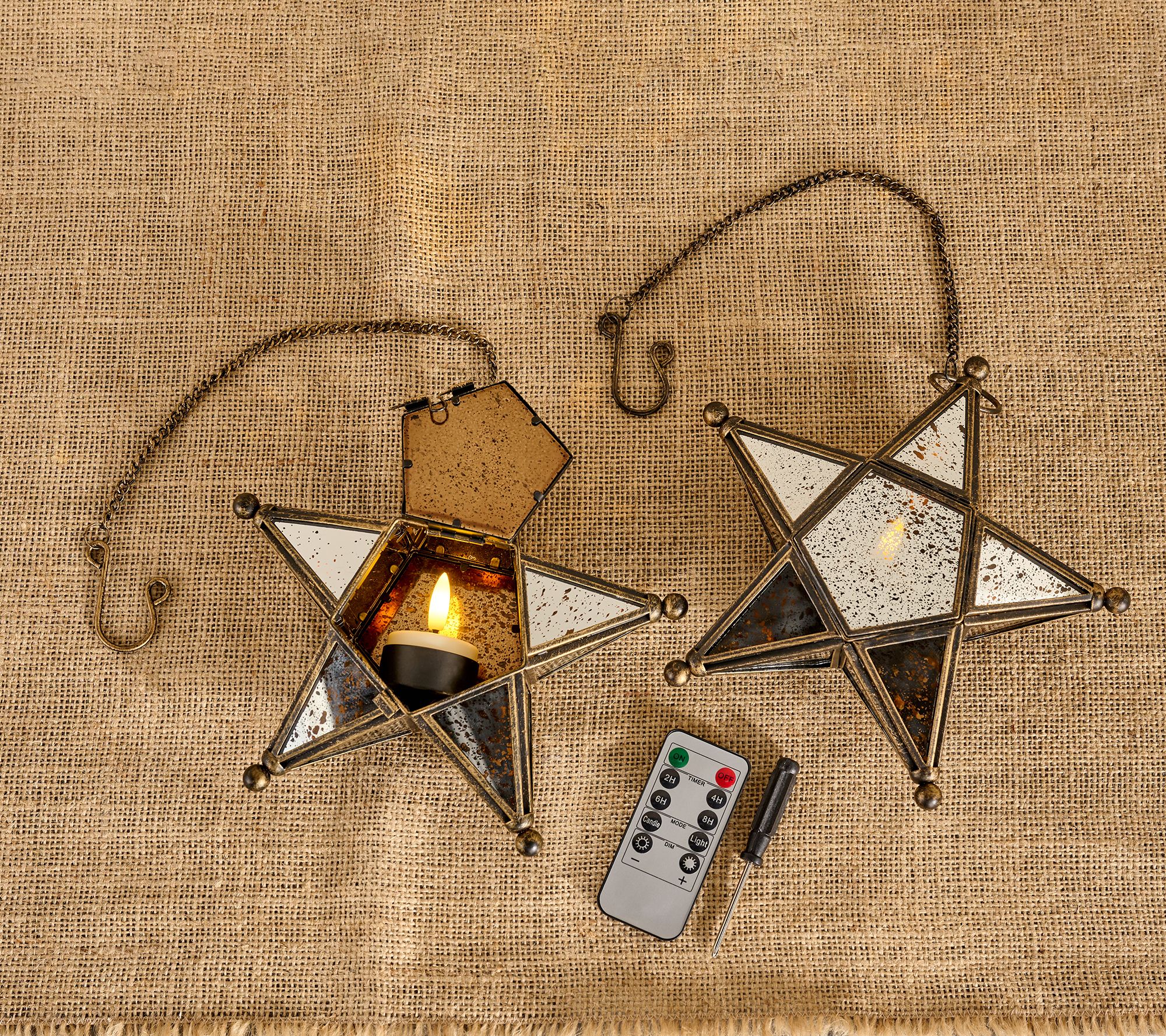 Includes two star lanterns, two tealight candles with CR2450 batteries, and remote control with CR2025 battery