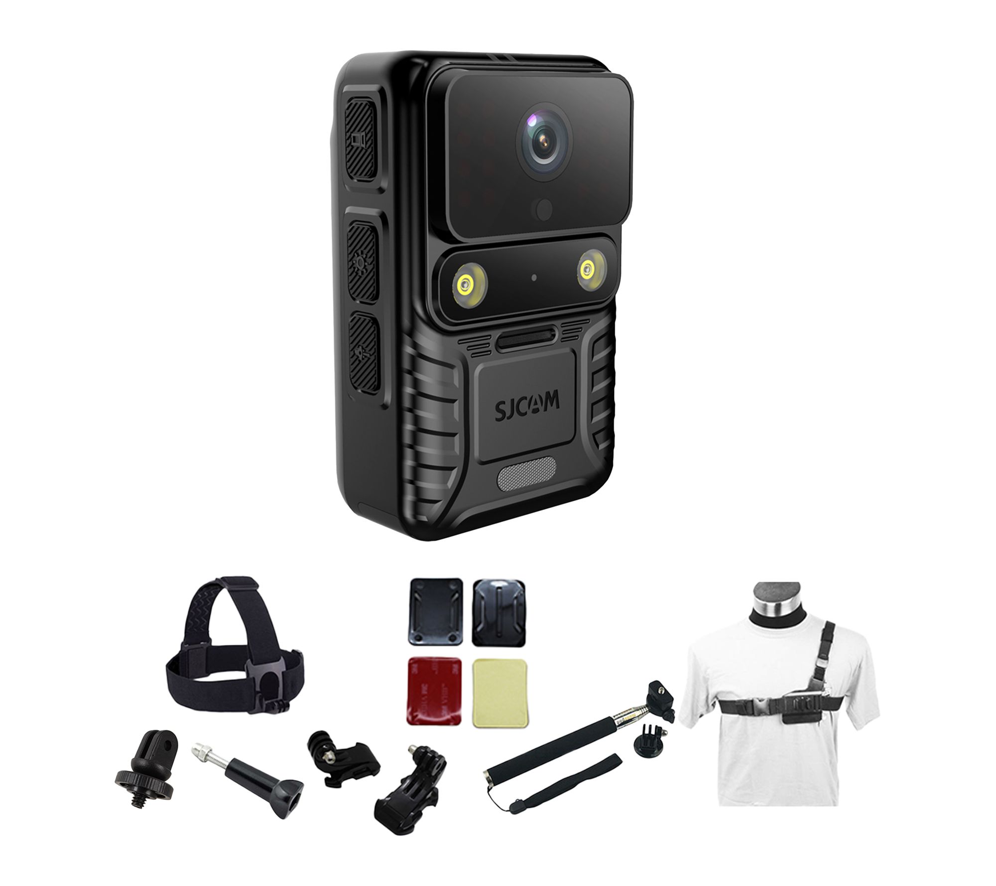 • Includes SJCAM A50 sports camera with charging cable, chest mount harness, mounting buckles, J-hook buckles, thumb screws, tripod adapter mount, adhesive mounts, and extendable handheld monopod/selfie stick