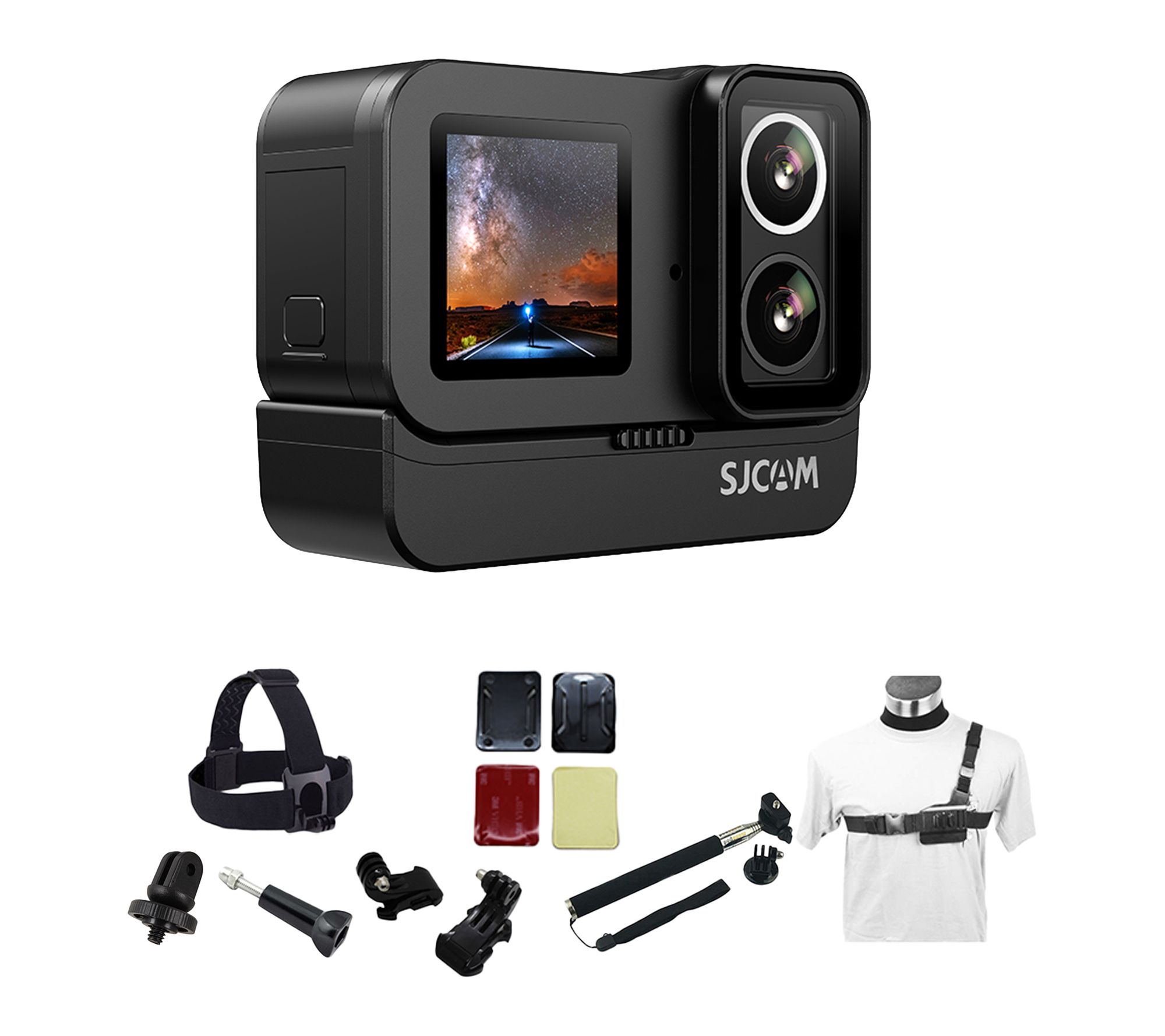 Includes SJCAM SJ20 Dual Lens Action Camera, head strap mount, chest mount harness, mounting buckles, J-hook buckles, thumb screws, tripod adapter mount, adhesive mounts, extendable handheld monopod / selfie stick