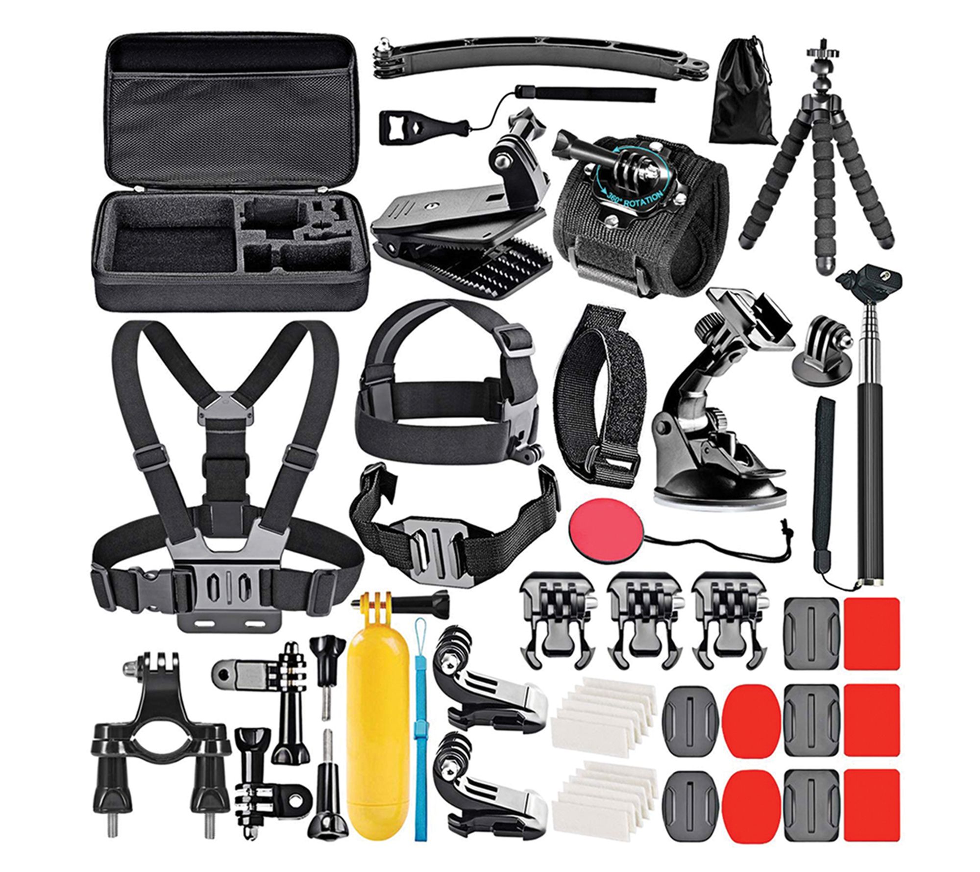 Includes SJ4000 Dual-Screen Action Camera, two helmet base mount USB cables, two sticker mounting frame cloths, rechargeable lithium-ion battery, and 50-in-1 accessory bundle