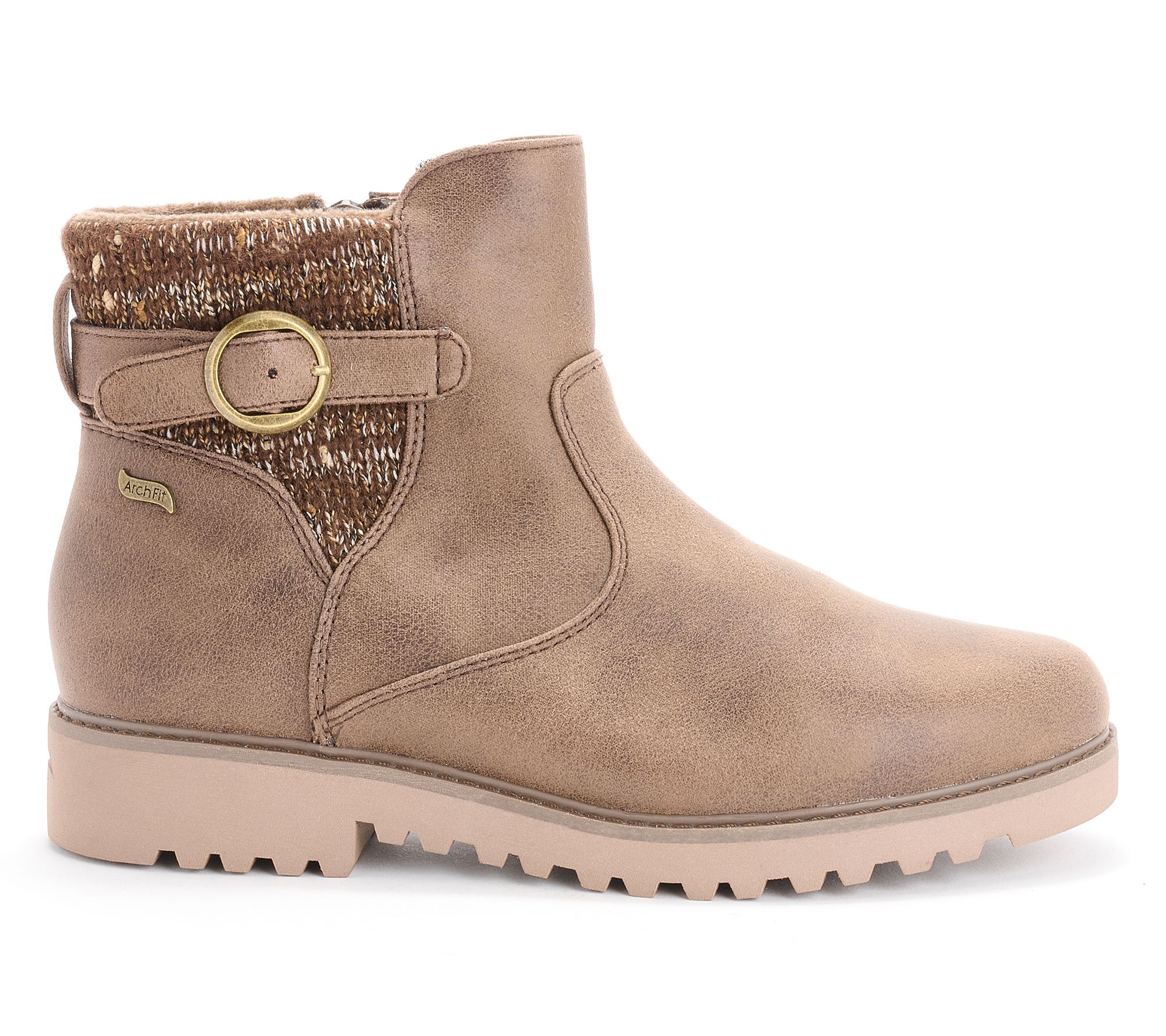 • Water-repellent upper, side zip closure, wrap buckle detail, knit shaft, faux-fur lining