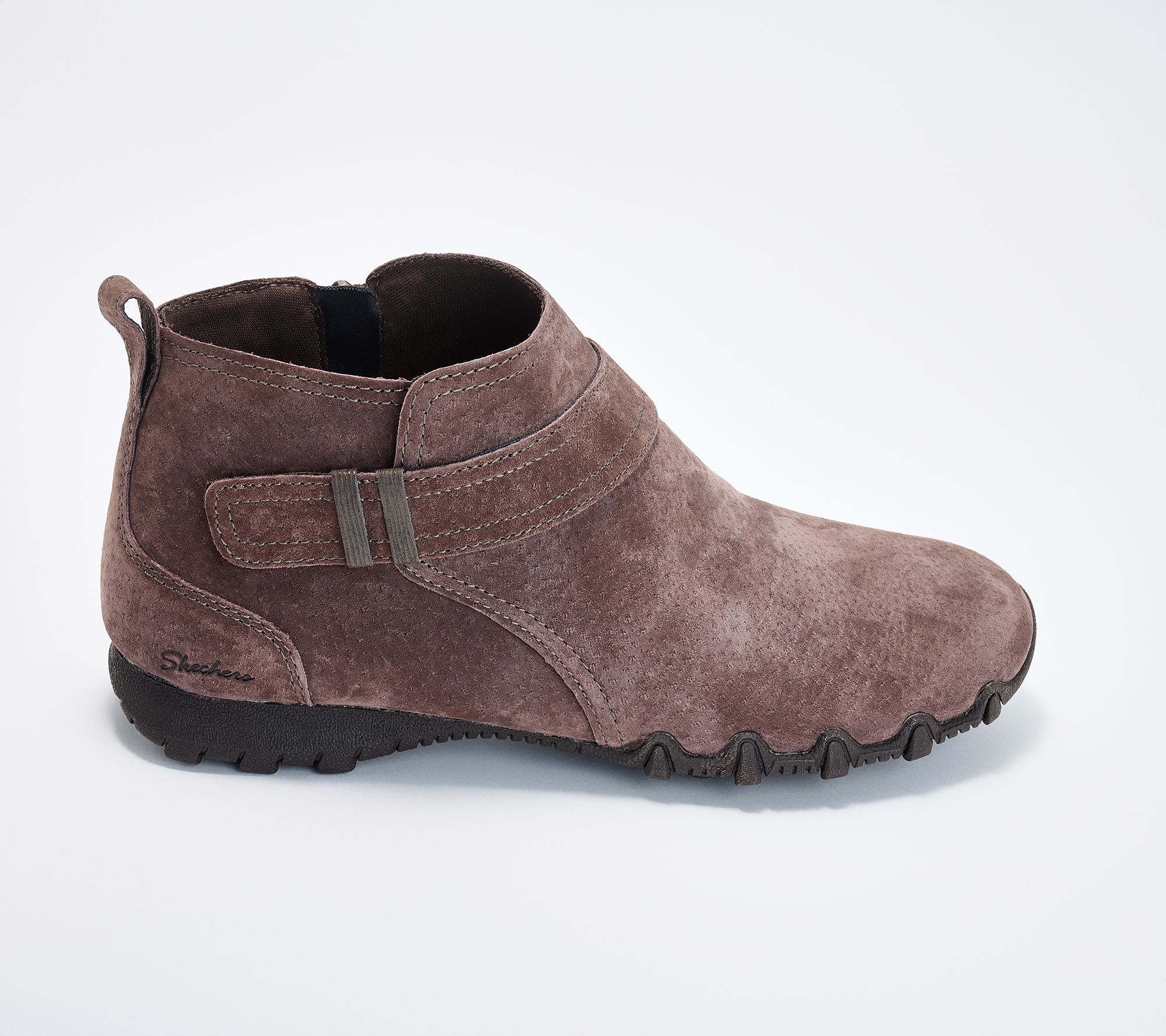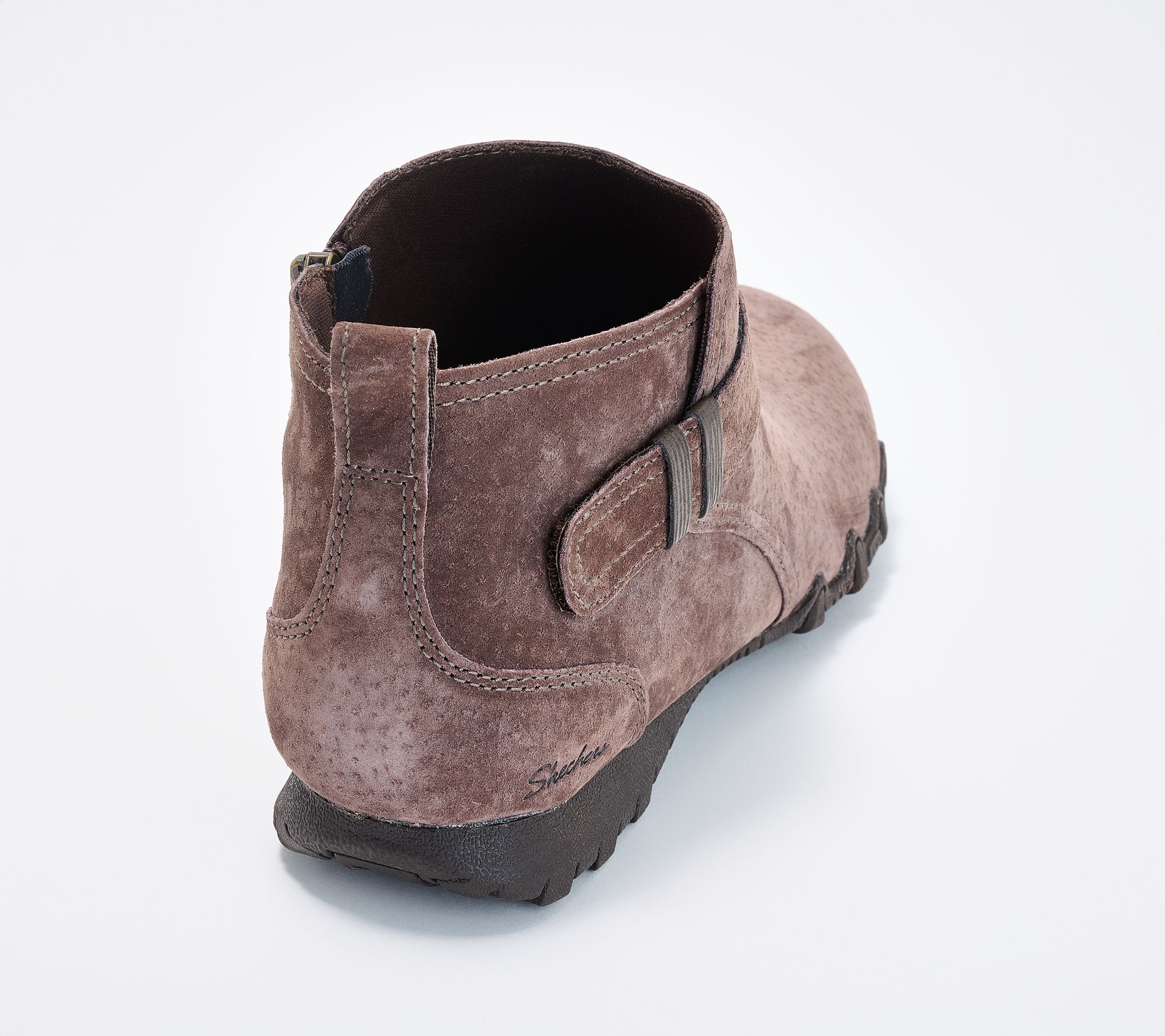 Whether you're heading out for an errand run or keeping it casual with friends, these suede booties offer sporty support and laid-back flair for everyday comfort. The relaxed fit and cushiony insole keep you moving with ease, and a side zip plus strap details make styling and slipping on simple. From Skechers.