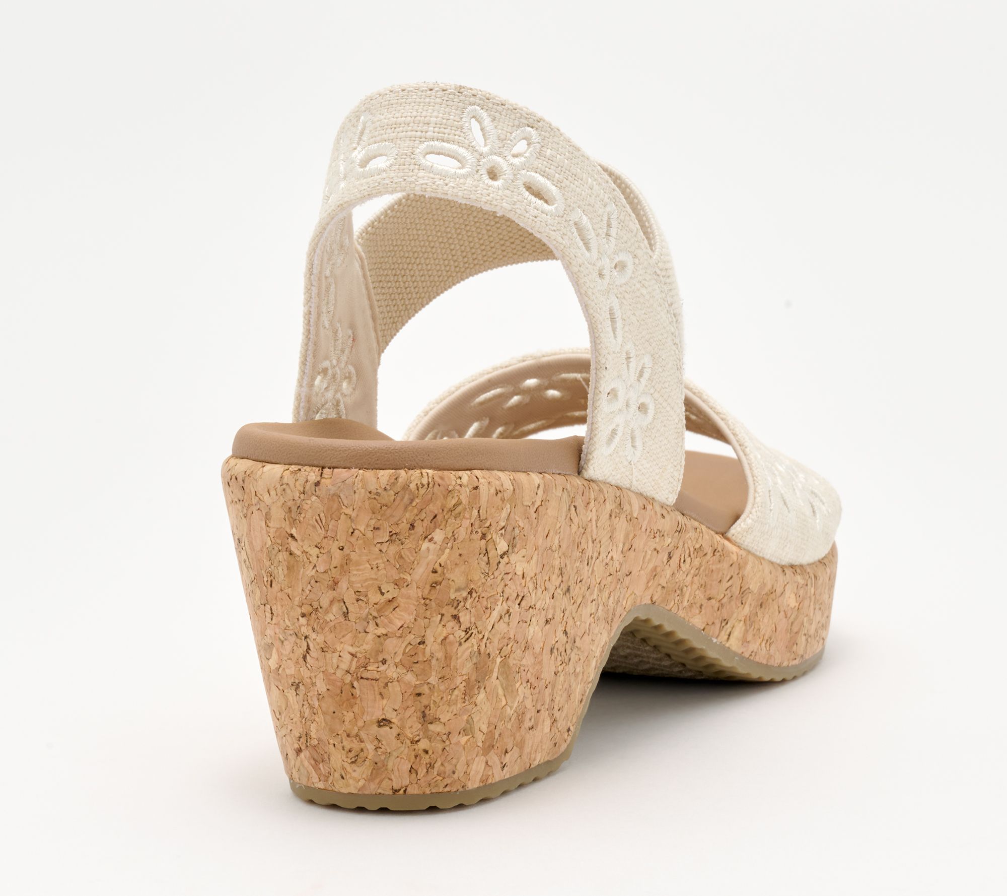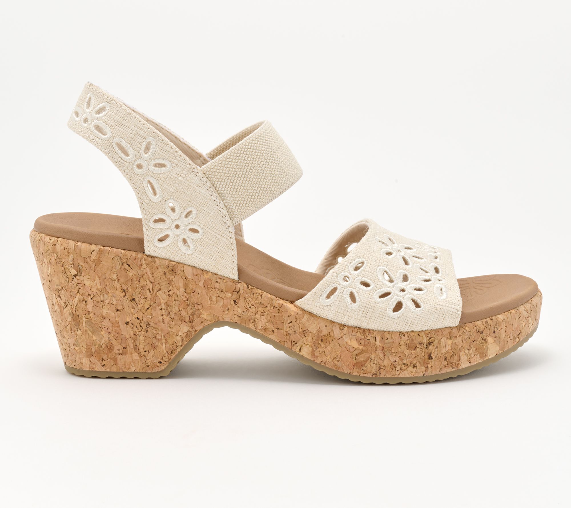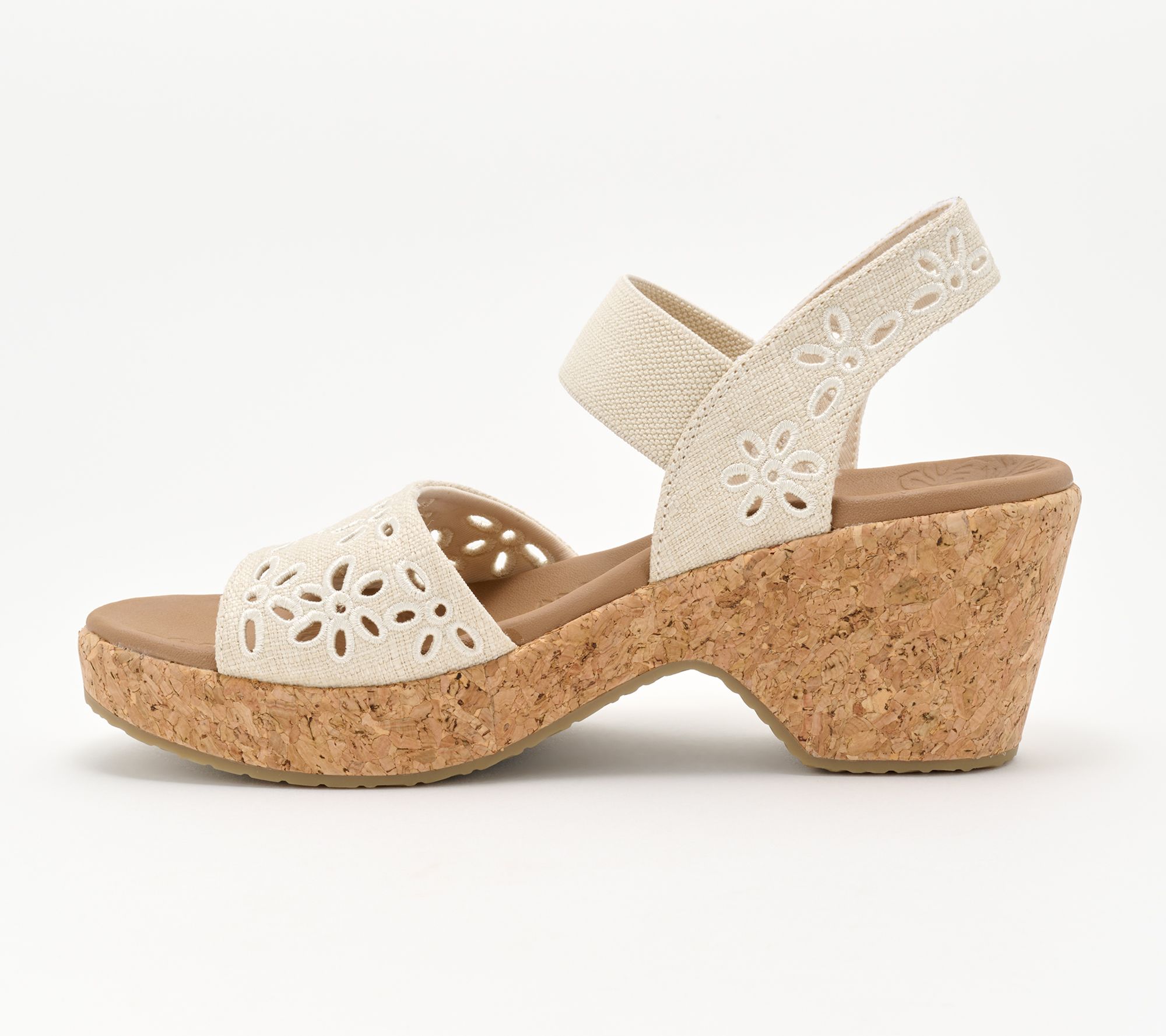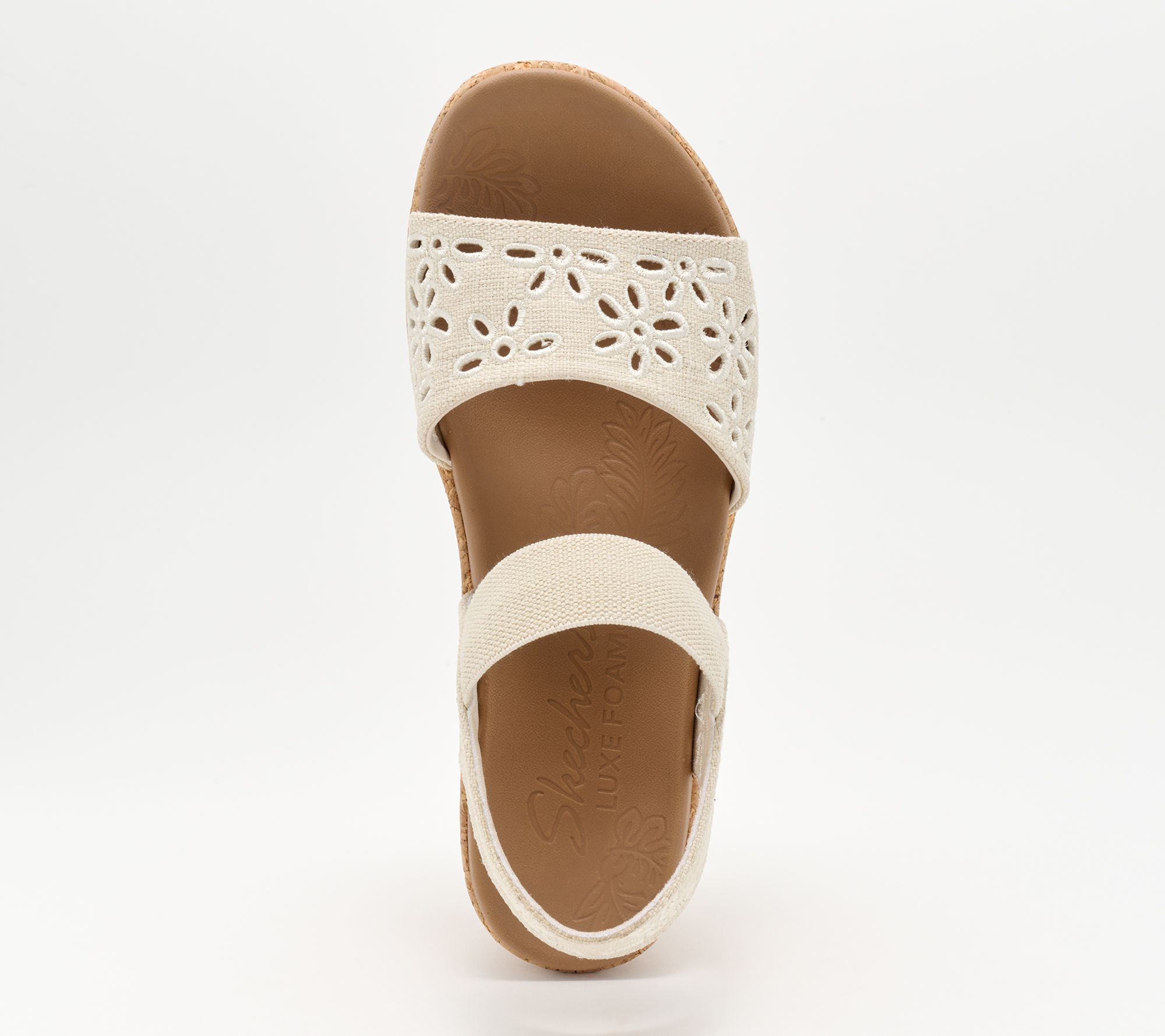Summer soirees and vacation plans call for the sweet and stepped-up look of these Skechers Cali sandals. The Brystol Beach Bliss wedges wow with a canvas floral eyelet upper, pull-on gore strap, and cushioned Luxe Foam footbed for a stylish and supportive fit. From Skechers.