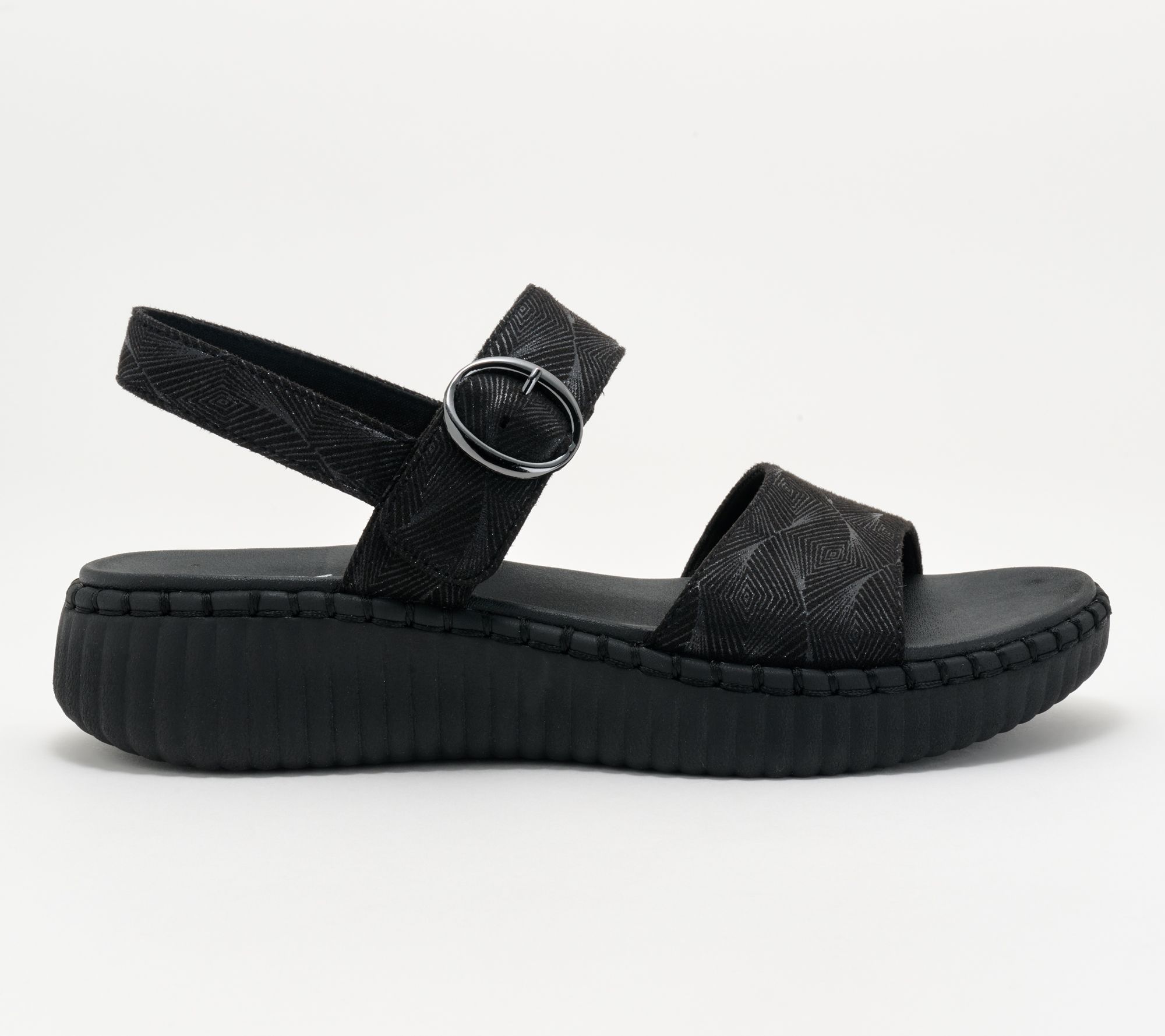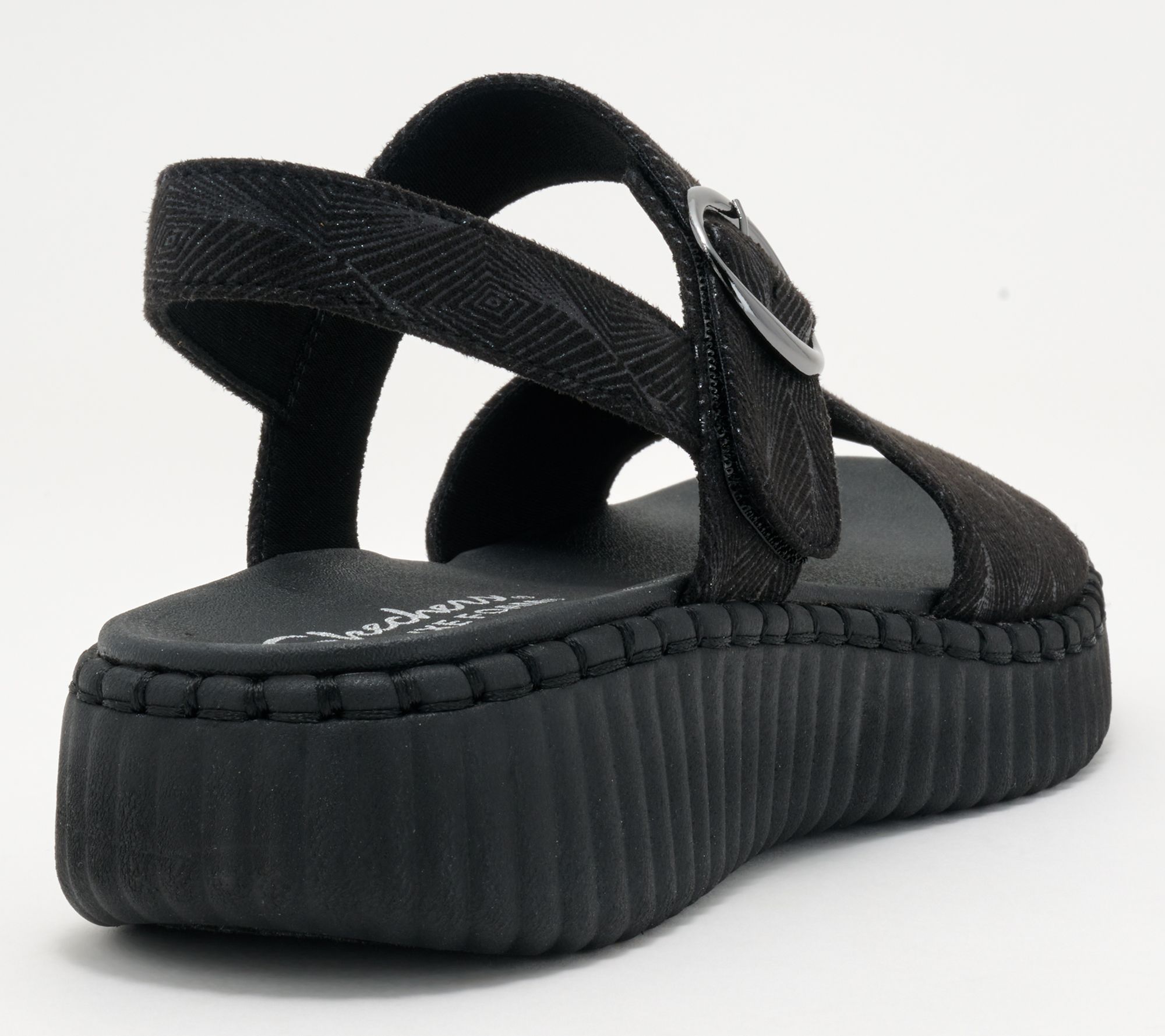 • Shimmer upper, adjustable ankle strap, buckle closure, round toe, stitched midsole trim
