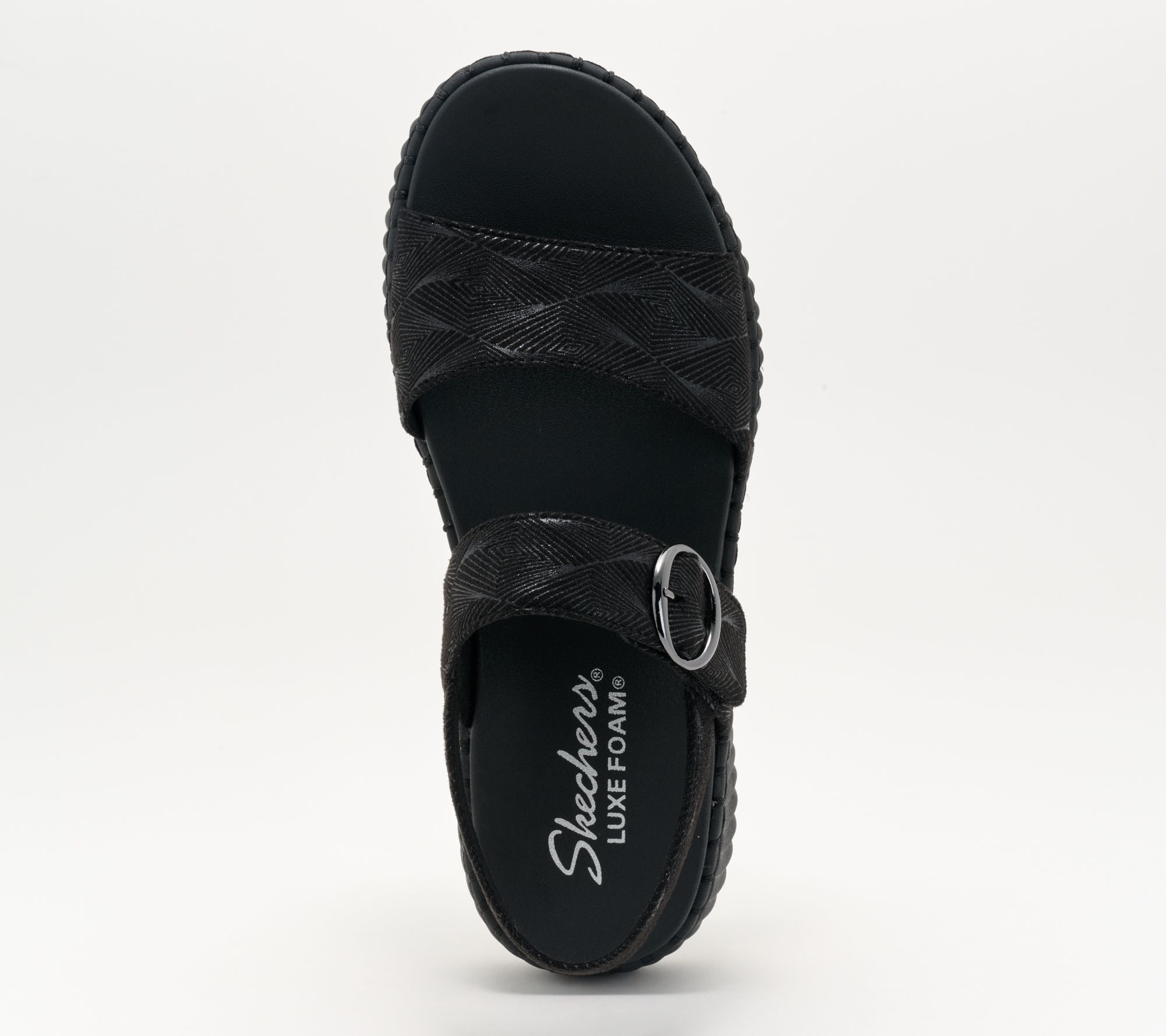 Get up and glow! Designed for fun and effortless moments, these vegan sandals feature a shimmery upper and a cushioned Luxe Foam footbed. Whether you're heading to a brunch or a beachfront stroll, they're a prime sunny day accessory. From Skechers.