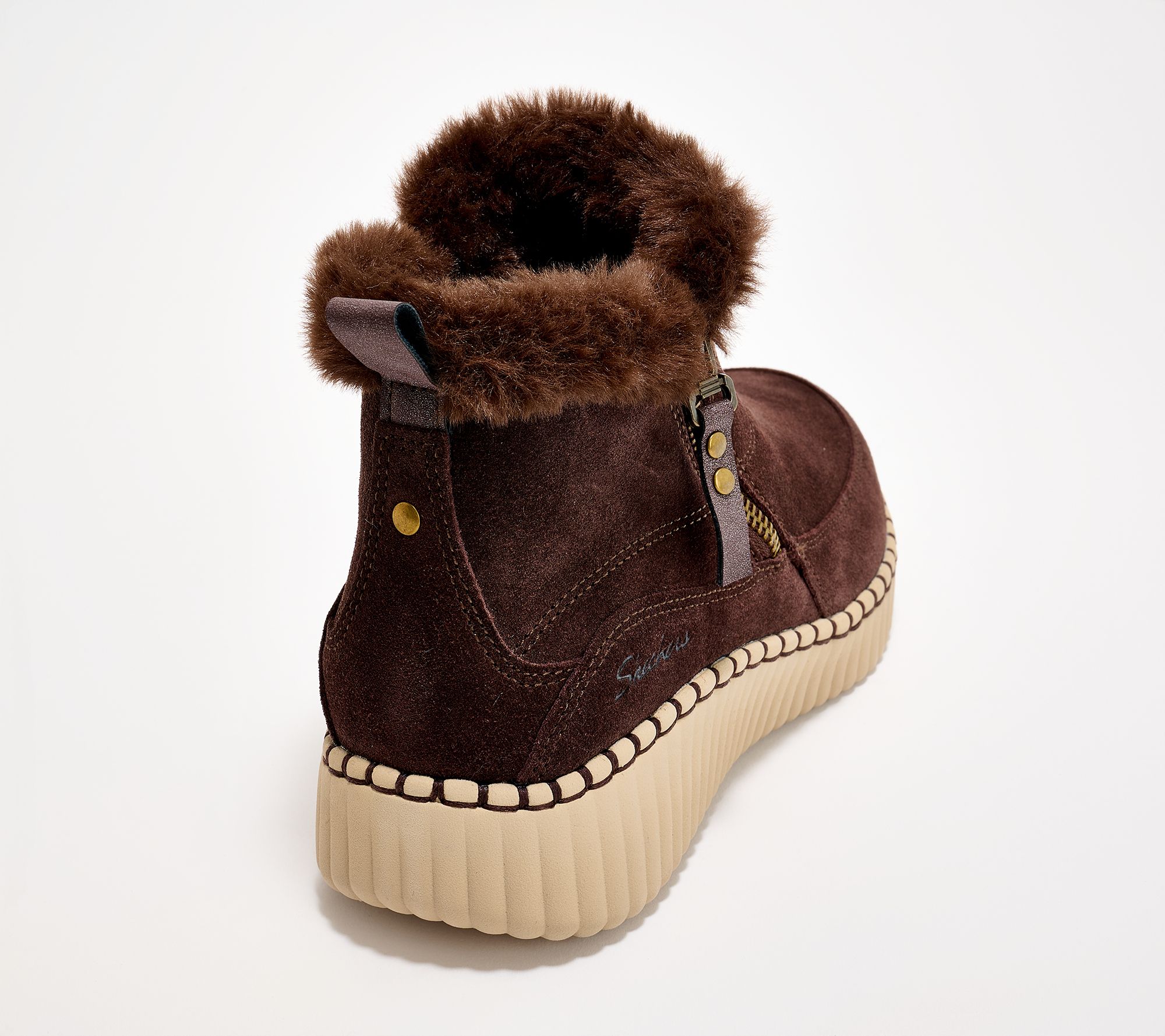 Pair laid-back looks with easygoing warmth when you slip into these mid-top booties, featuring a soft suede finish and cozy faux fur details. Whether you're running errands or relaxing at home, the roomy design and cushioned Memory Foam insole provide all-day comfort, while the side zipper offers quick on-and-off convenience. From Skechers.