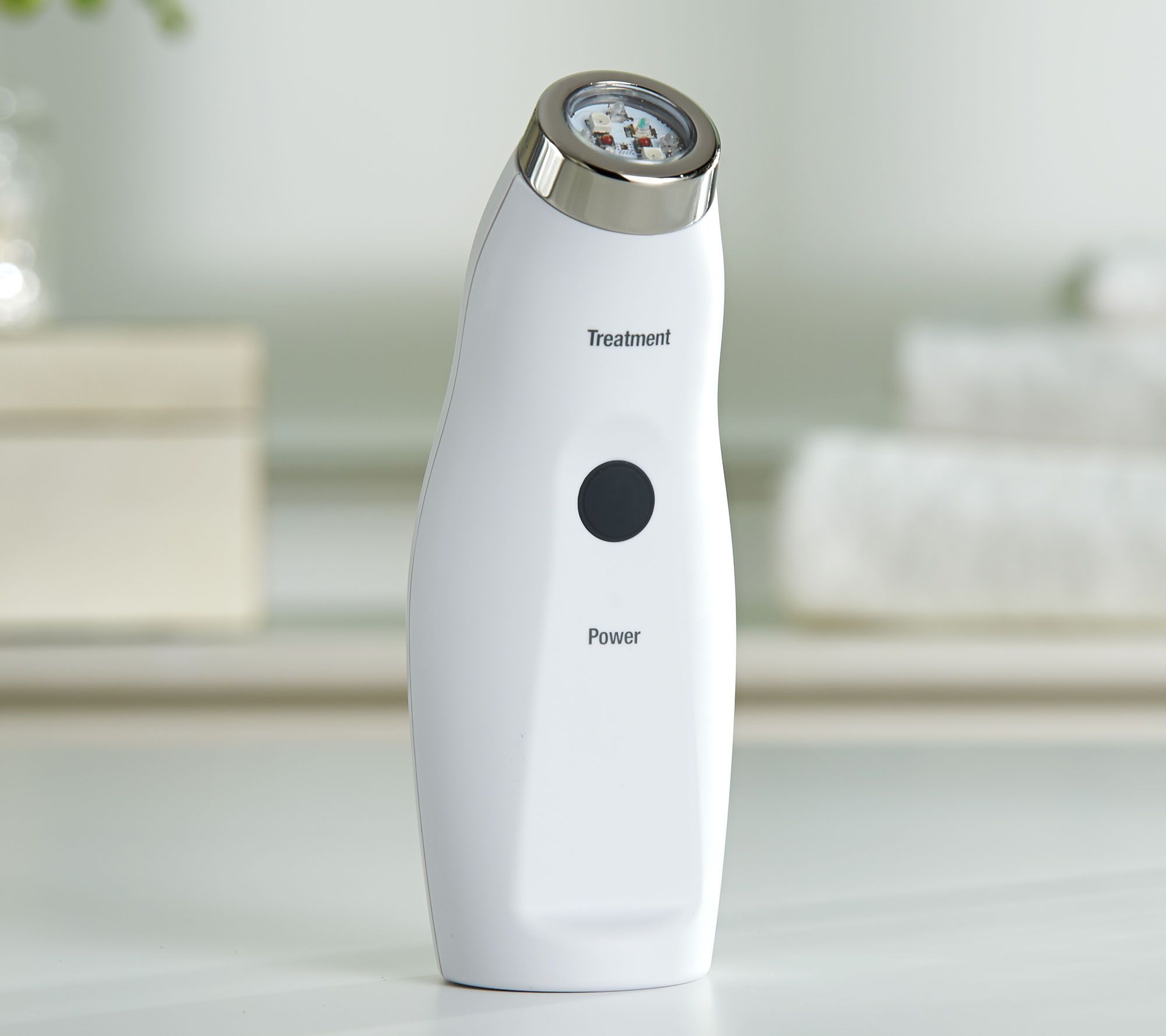 How do I use it: Turn the reverse light therapy device on by pressing the on/off button to power on. The blue treatment light and green/yellow power light will illuminate. Place the device lens in contact with your skin and glide gently along treatment area until it beeps (three minutes). There is no need to apply pressure. Repeat for each treatment area and then press the on/off button to power off.