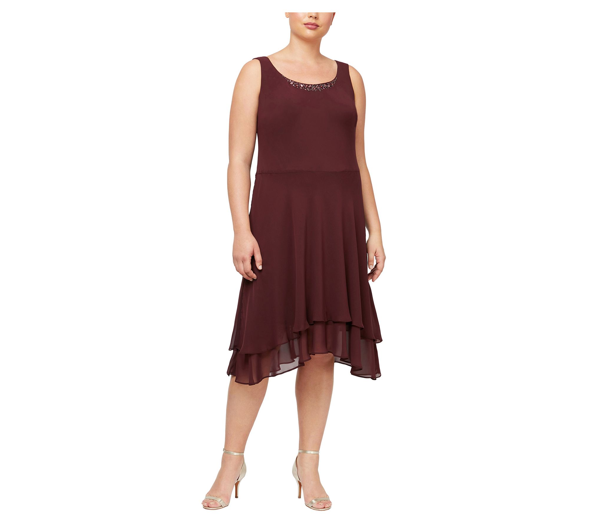 Glam up with this sequined jacket and dress combo that showcases a flattering scoop neckline and a flirty flounced cut. From S.L. Fashions.