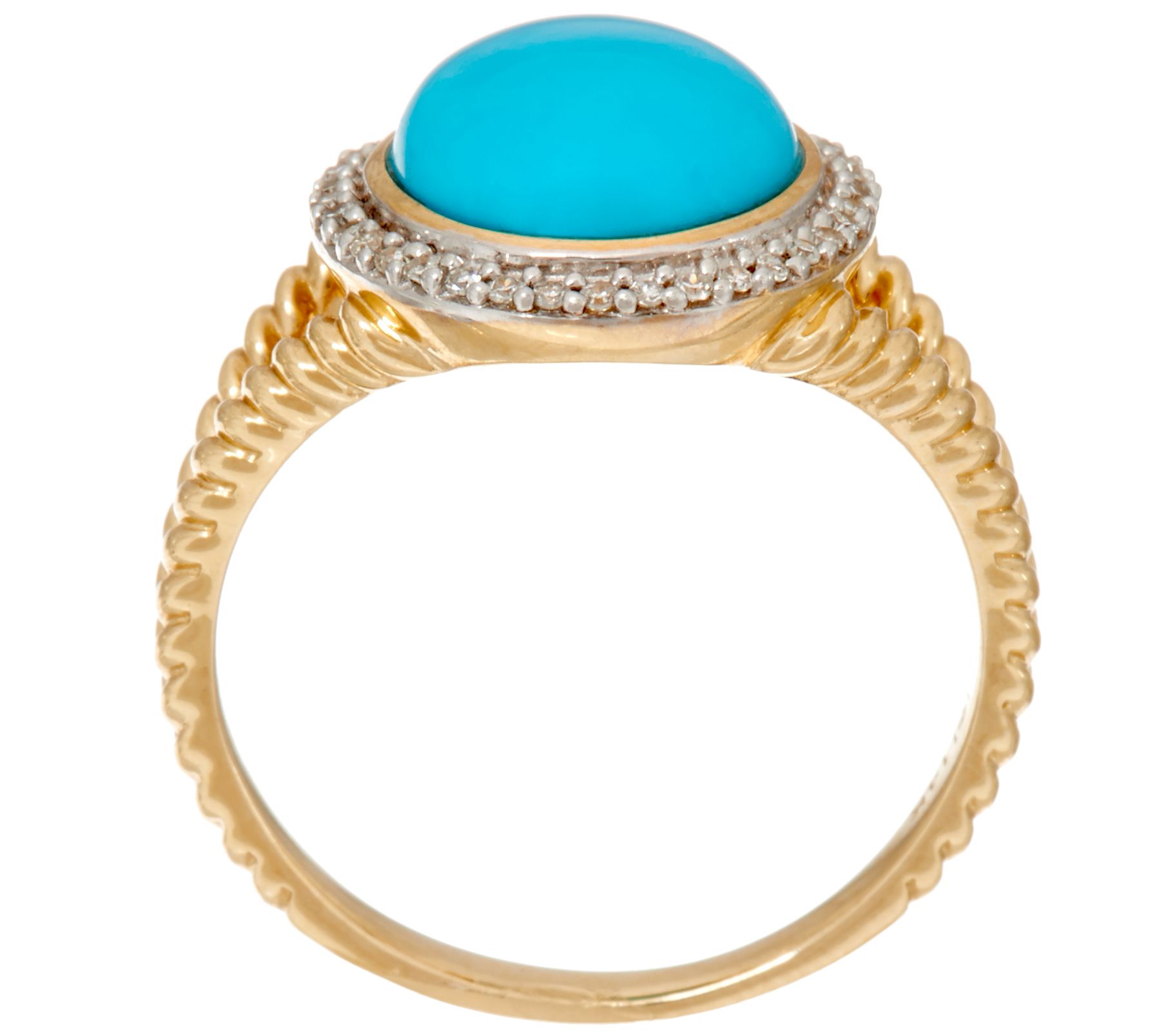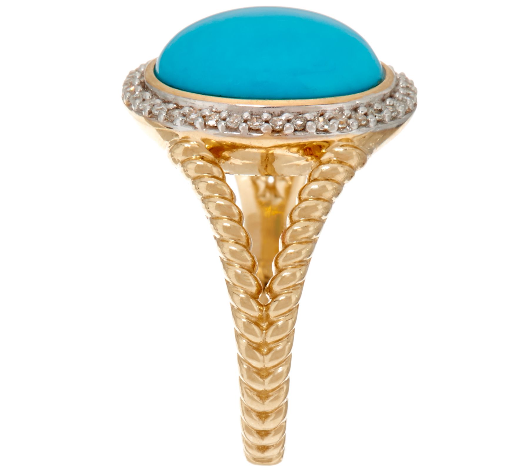 Transform every casual gesture into an eye-catching flourish with this 14K gold Sleeping Beauty turquoise and diamond ring. You'll love how it makes a stunning statement without overwhelming your ensemble--while the contrast between 14K gold and white diamonds creates a dramatic effect. Whether you dress it up or down, this ring is a sophisticated showpiece you'll want to flaunt.