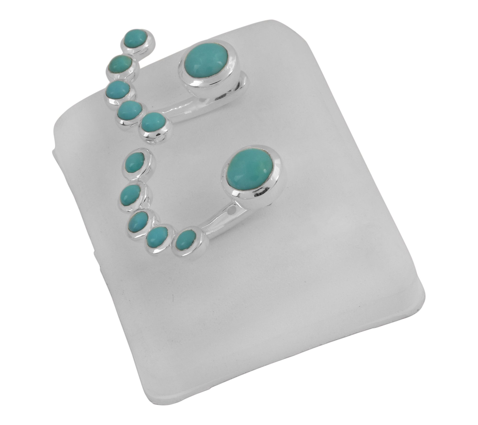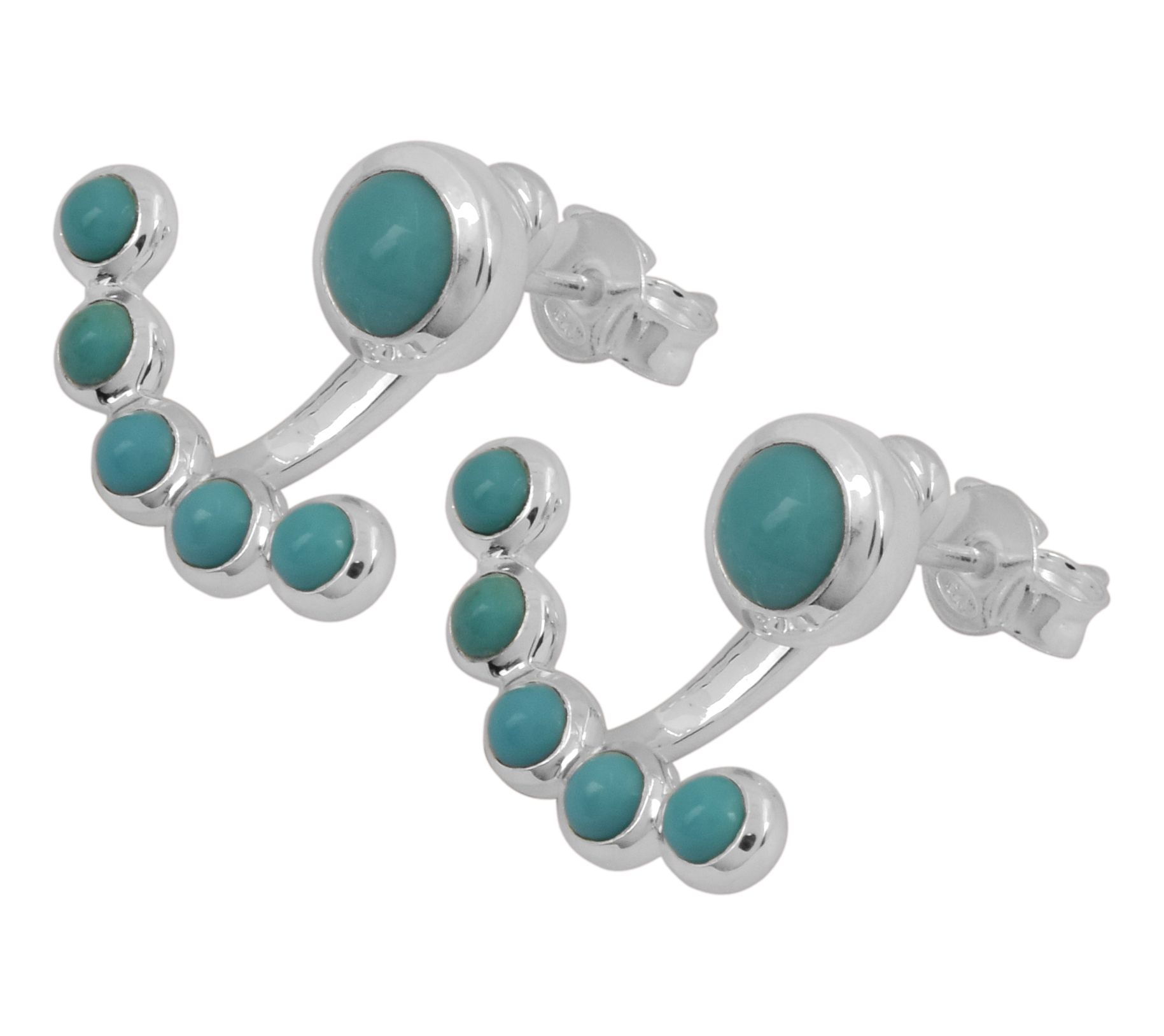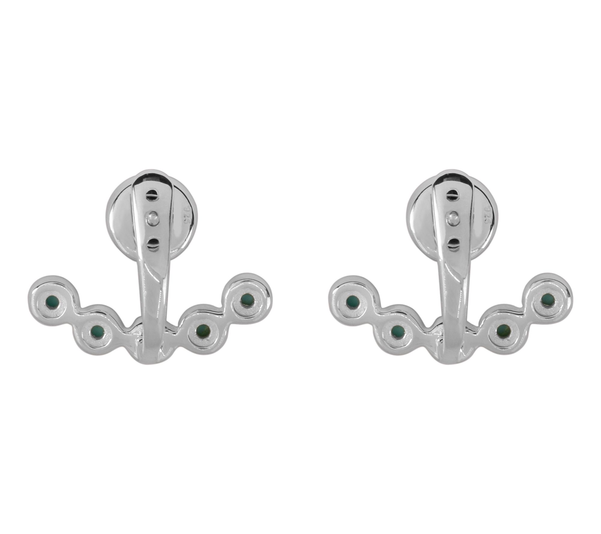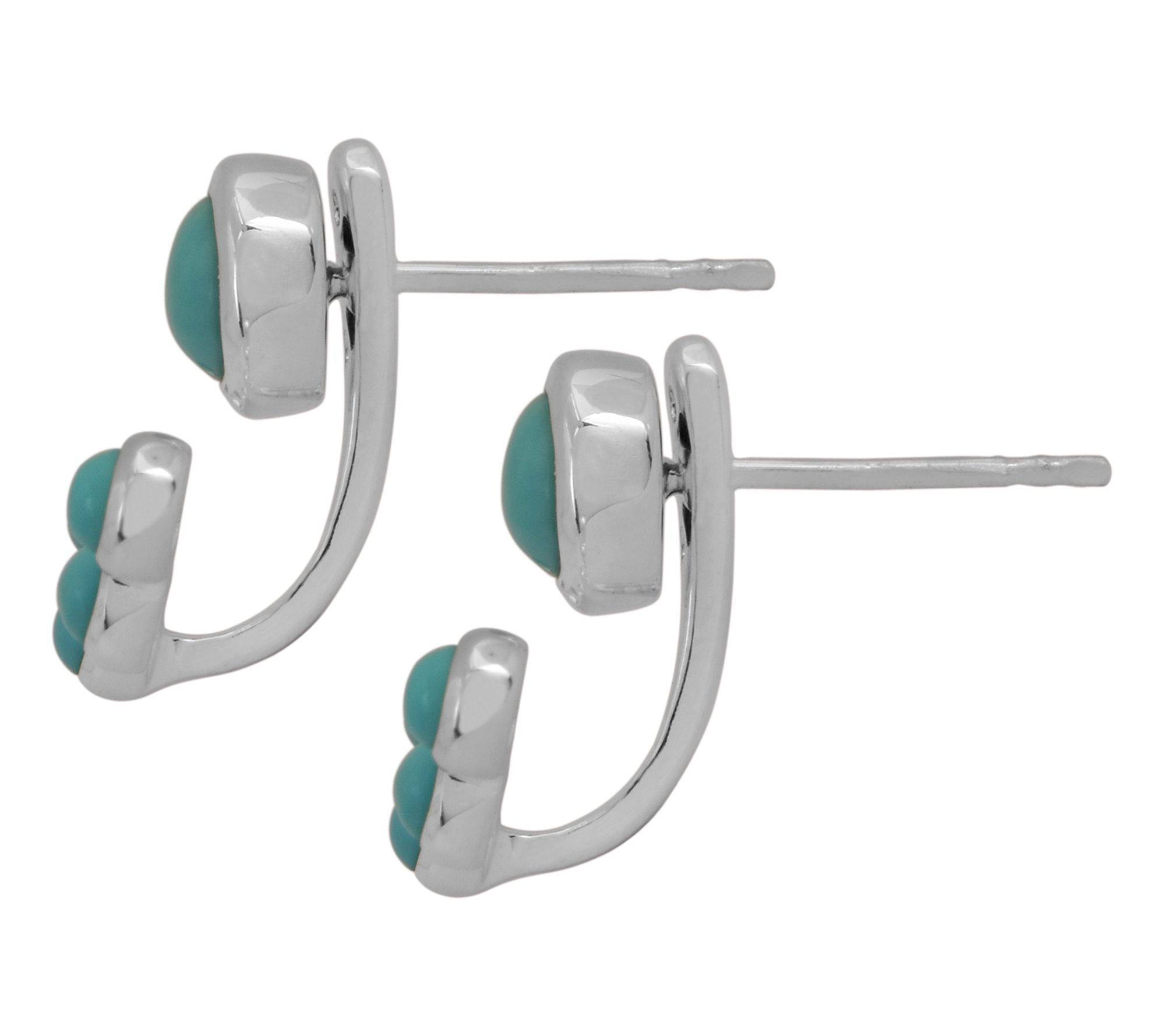 Larger round, bezel-set Sleeping Beauty cabochon post; five round, bezel-set Sleeping Beauty cabochons in arch on jacket; three-hole adjustable bar on jacket accommodates different ear positioning