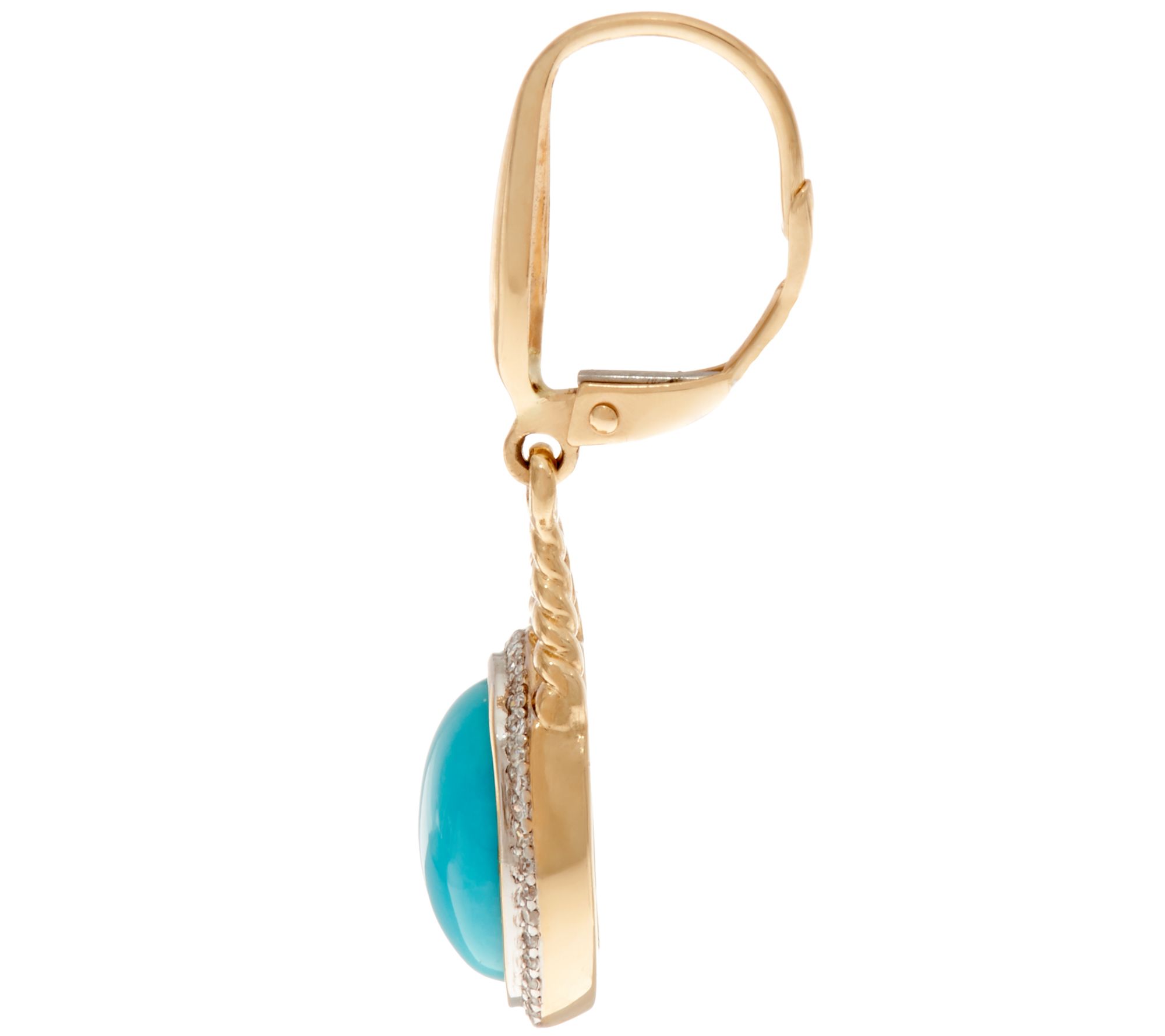 The best part of new earrings is planning on what you want to wear them with. A large oval Sleeping Beauty turquoise is surrounded by a halo of pave-set round white diamonds with 14K yellow gold rope details. Not only do these dangling earrings dazzle in many ways, they work as a perfect light blue accent to your outfits.