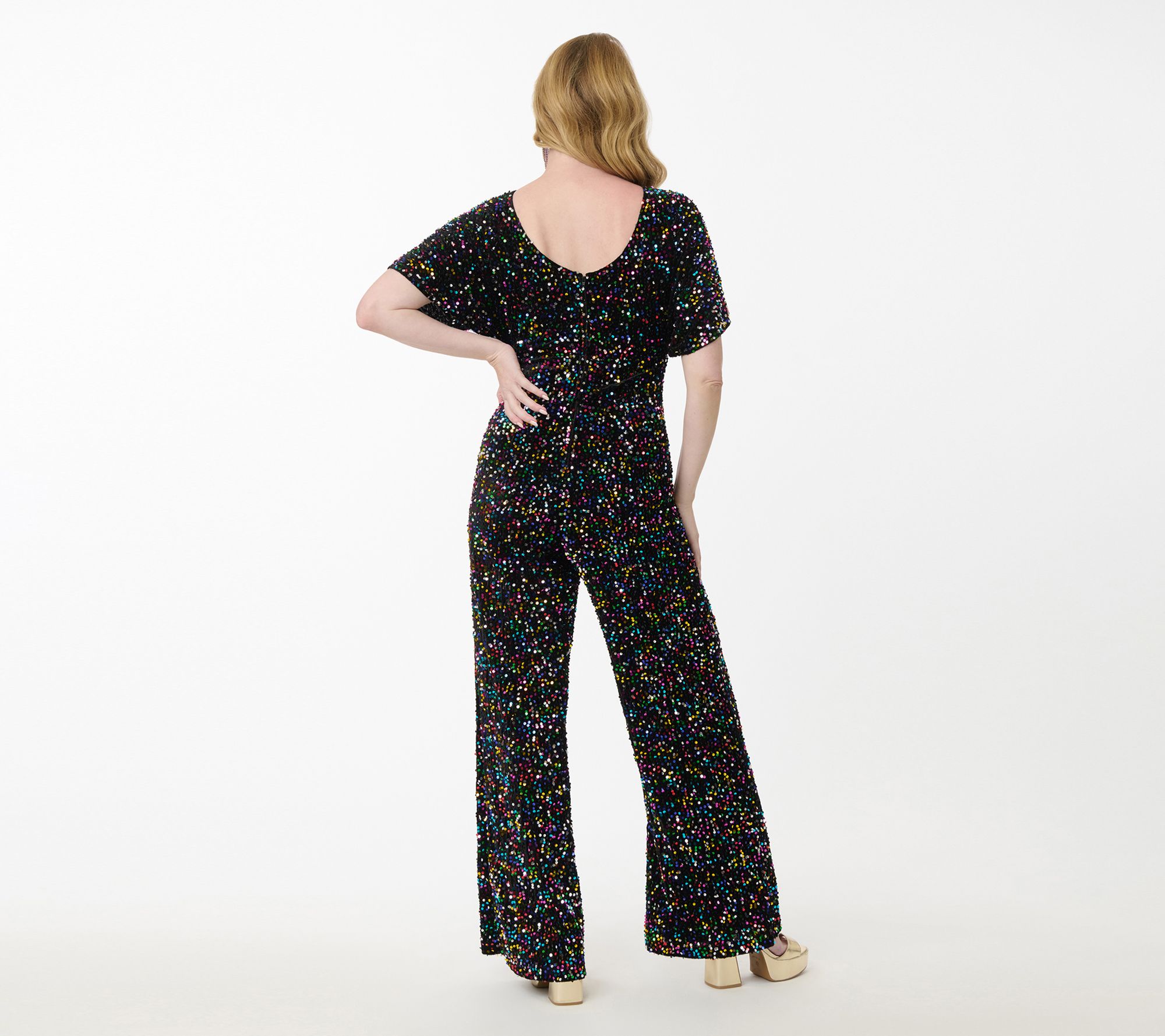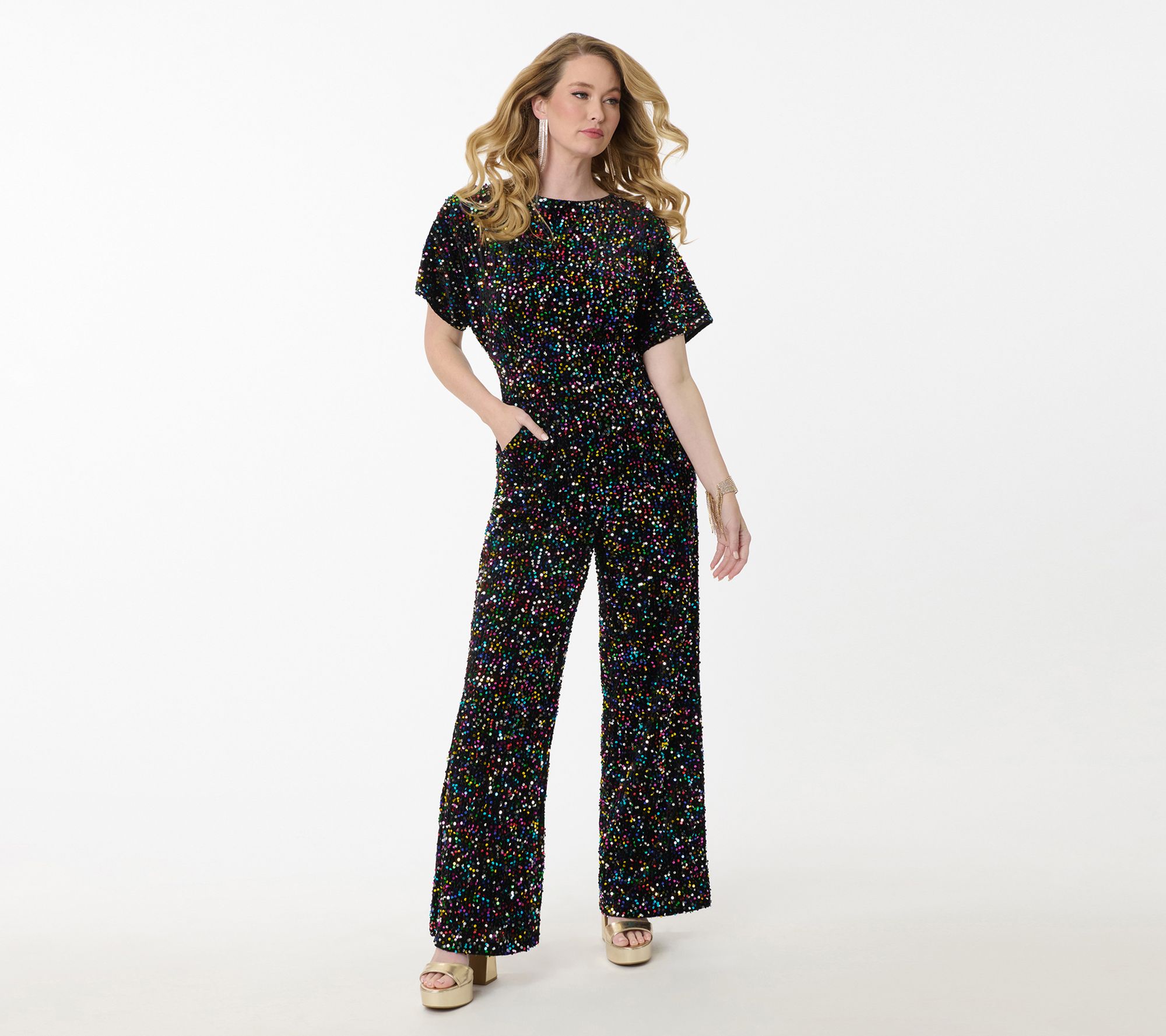 • Features: short sleeves, wide-leg silhouette, allover rainbow sequin design, side pockets