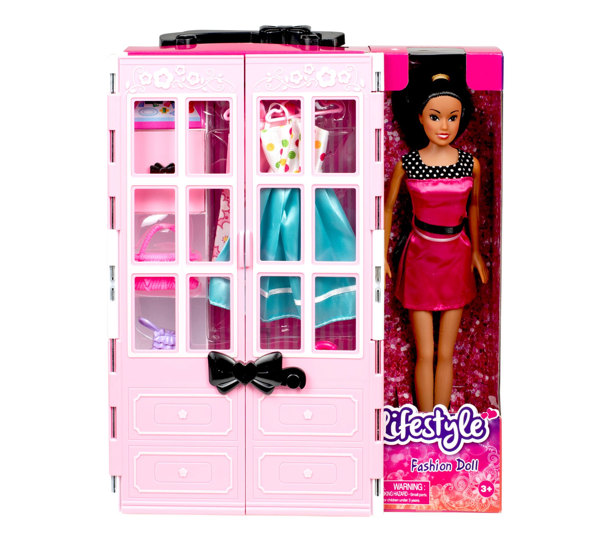 • Includes 11.5" doll, wardrobe carrying case, two dresses, two hangers, three handbags, one necklace, and three pairs of shoes