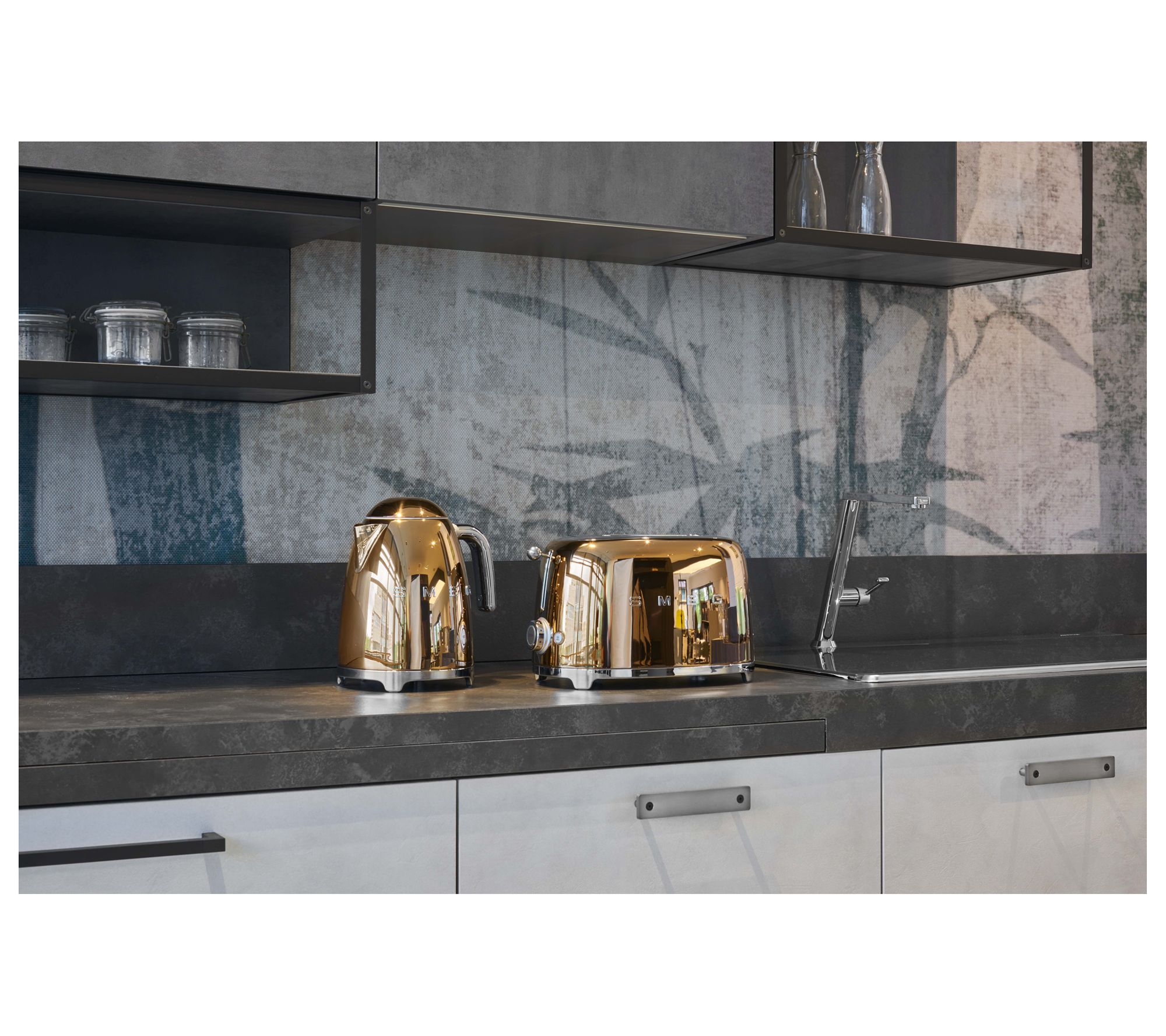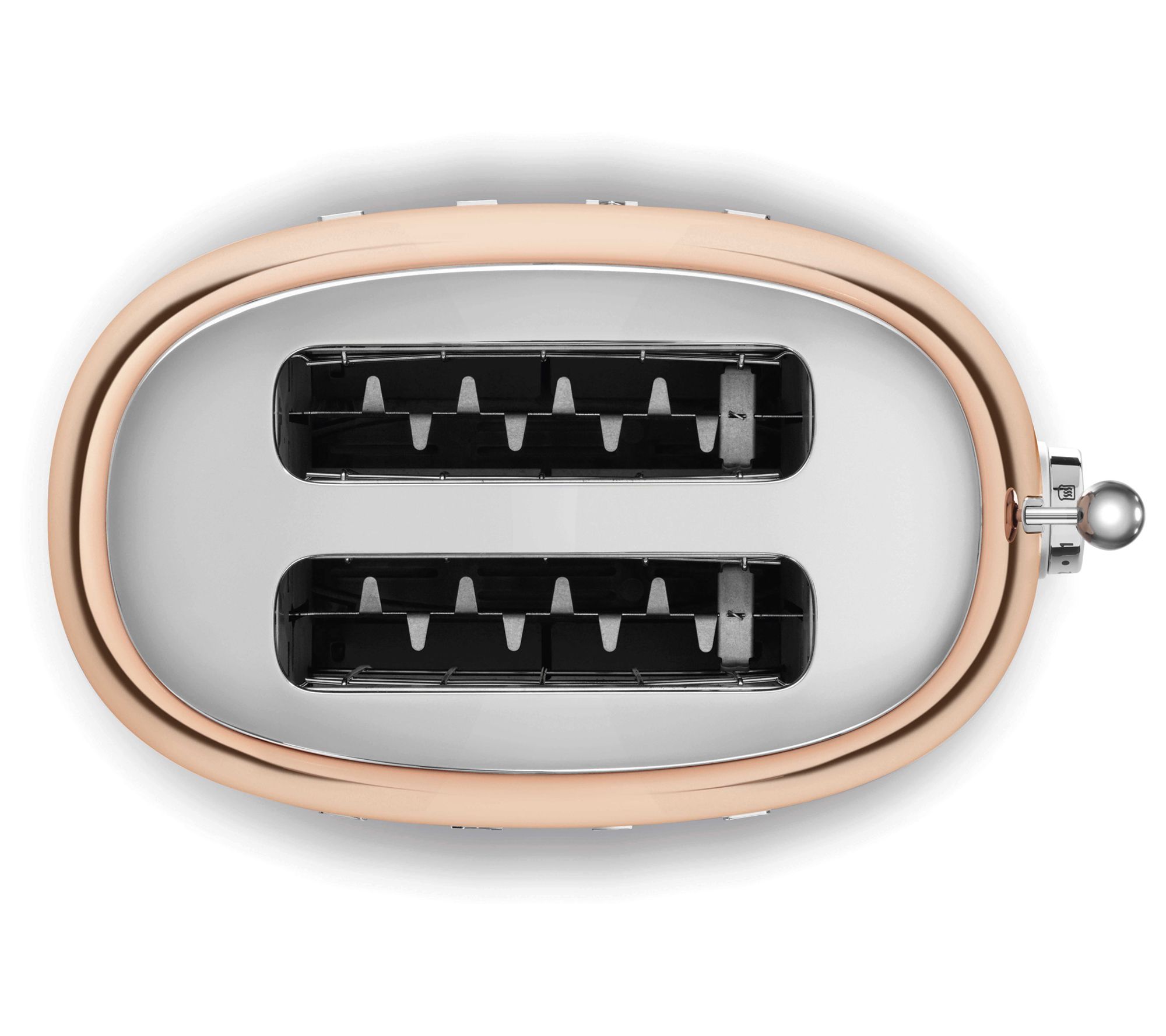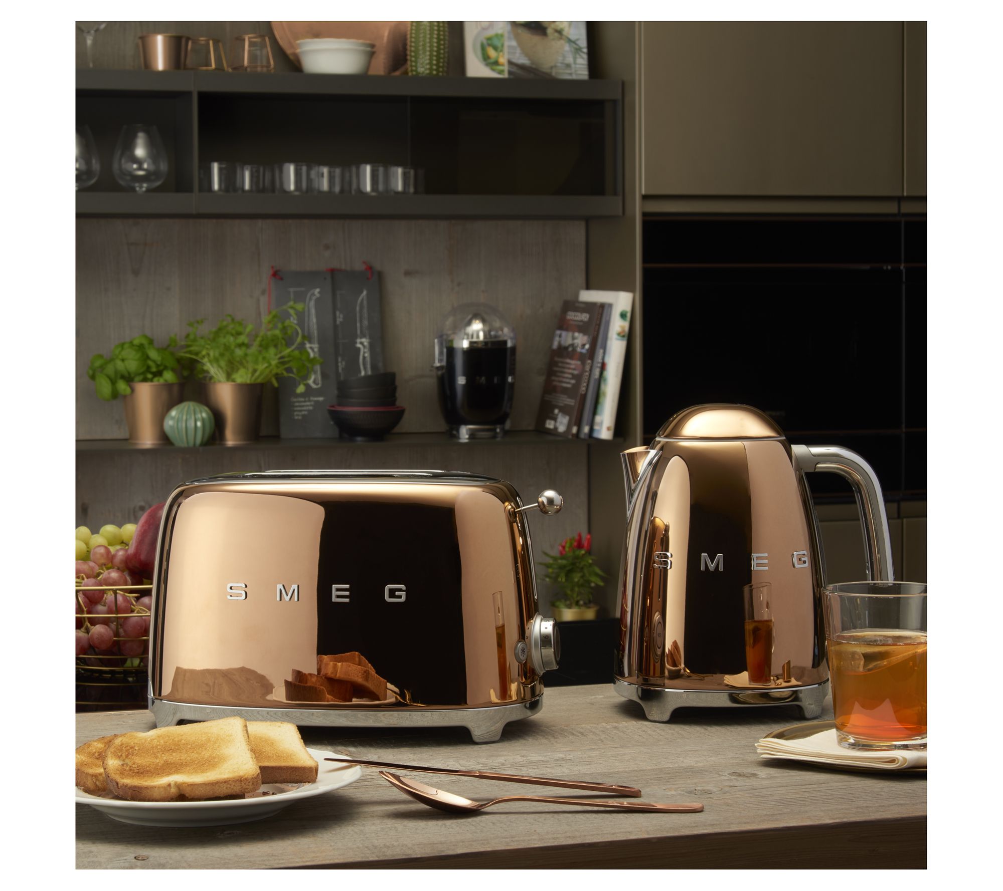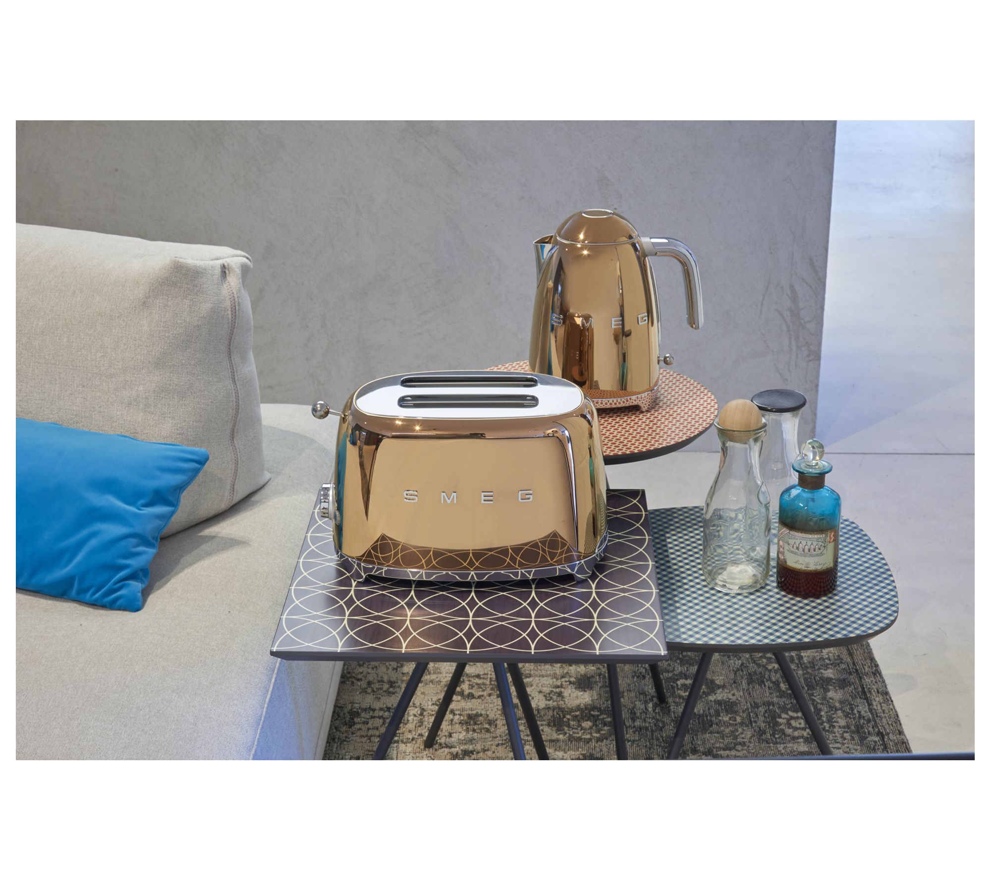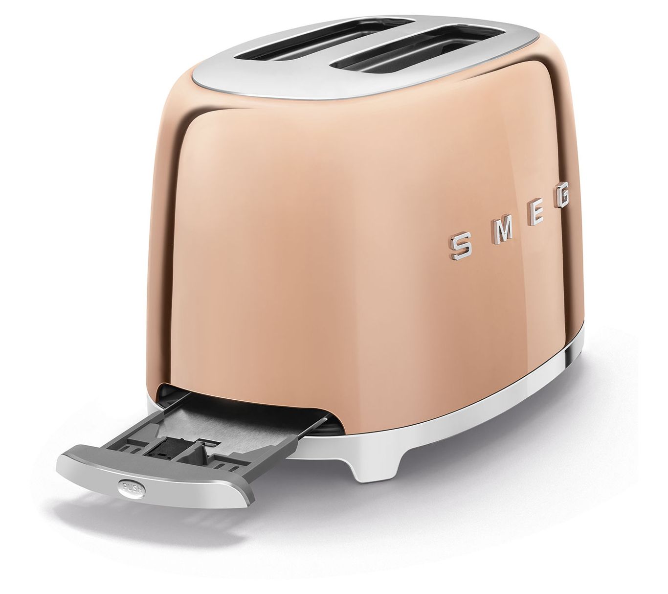 Cool retro-inspired style with a modern twist, this two-slice toaster offers self-centering racks, automatic slice pop up, and a removable stainless steel crumb tray. From Smeg.