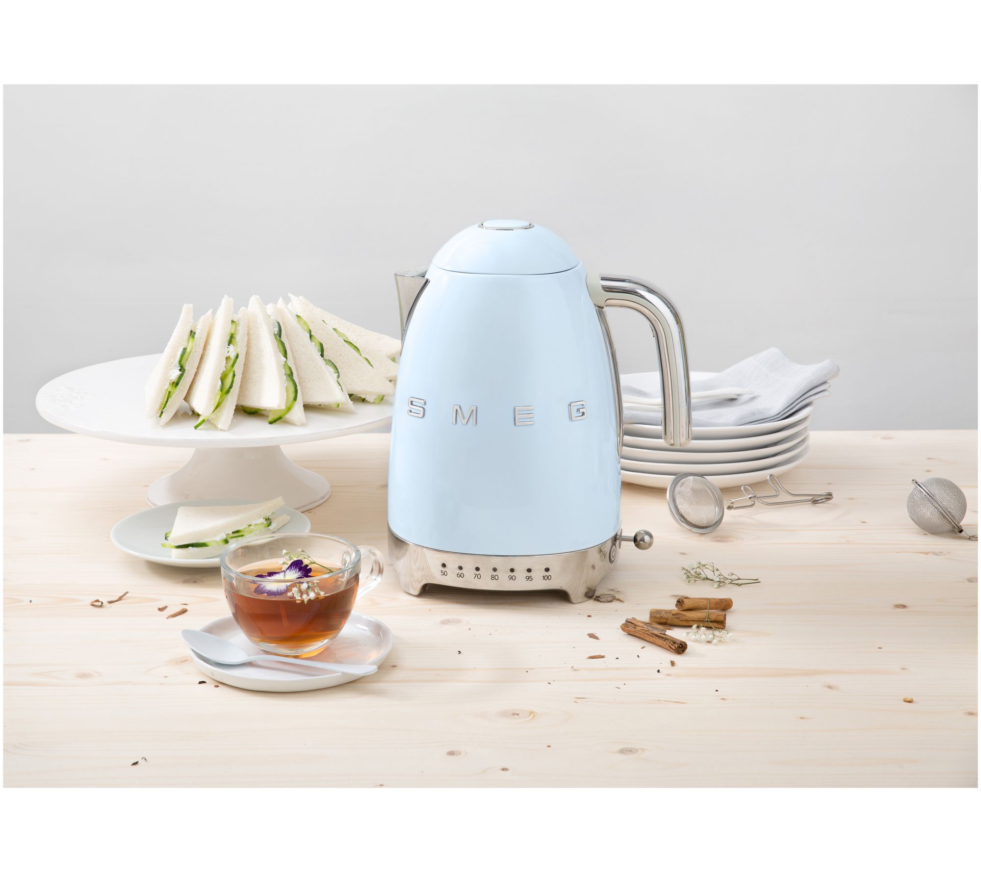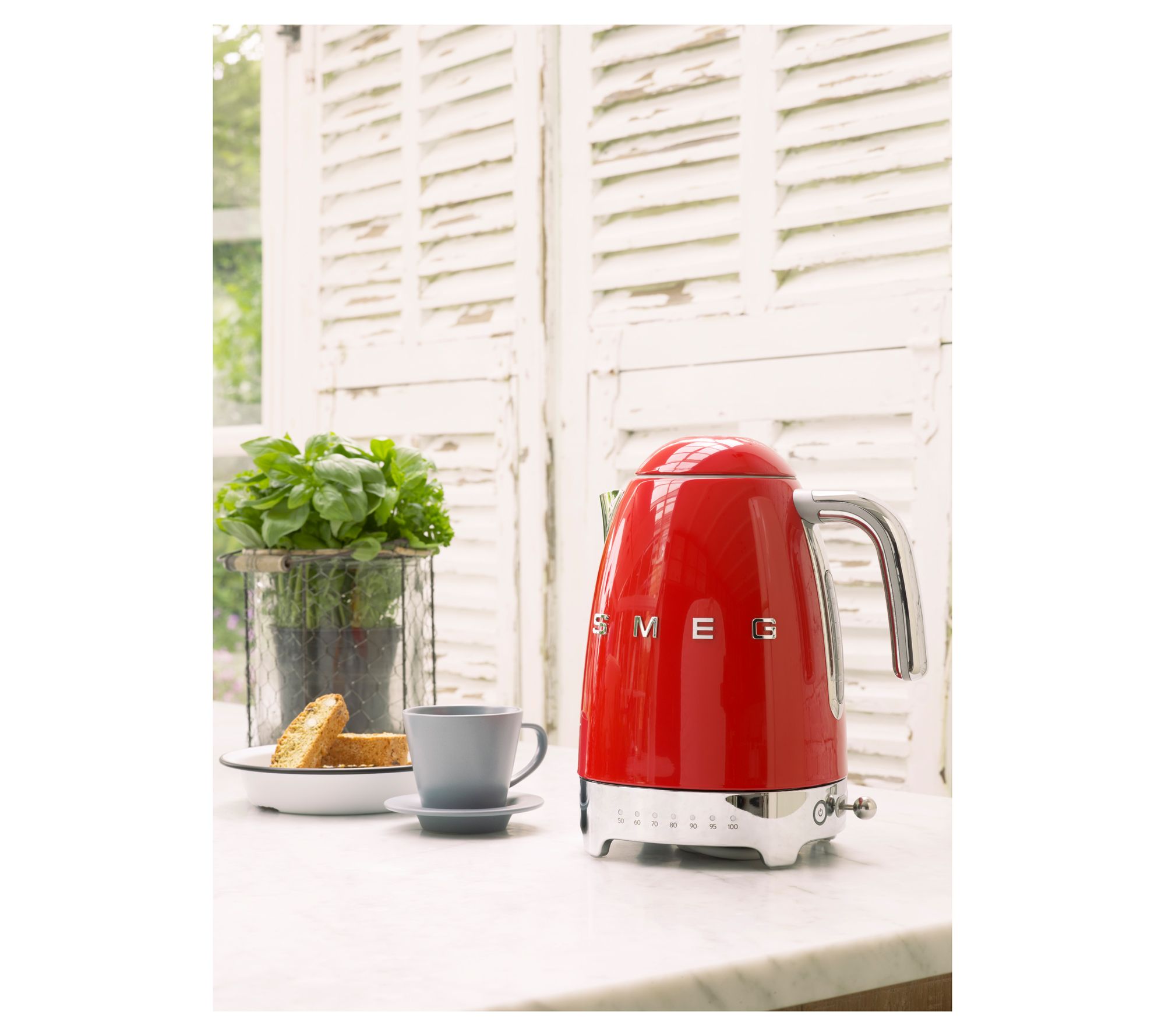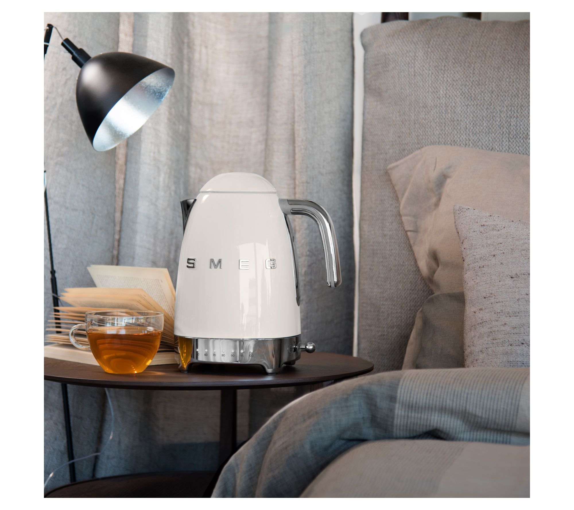 Offering a sleek, 1950s-inspired aesthetic, this 1.7-liter electric kettle features seven temperature levels and a keep warm setting. From Smeg.