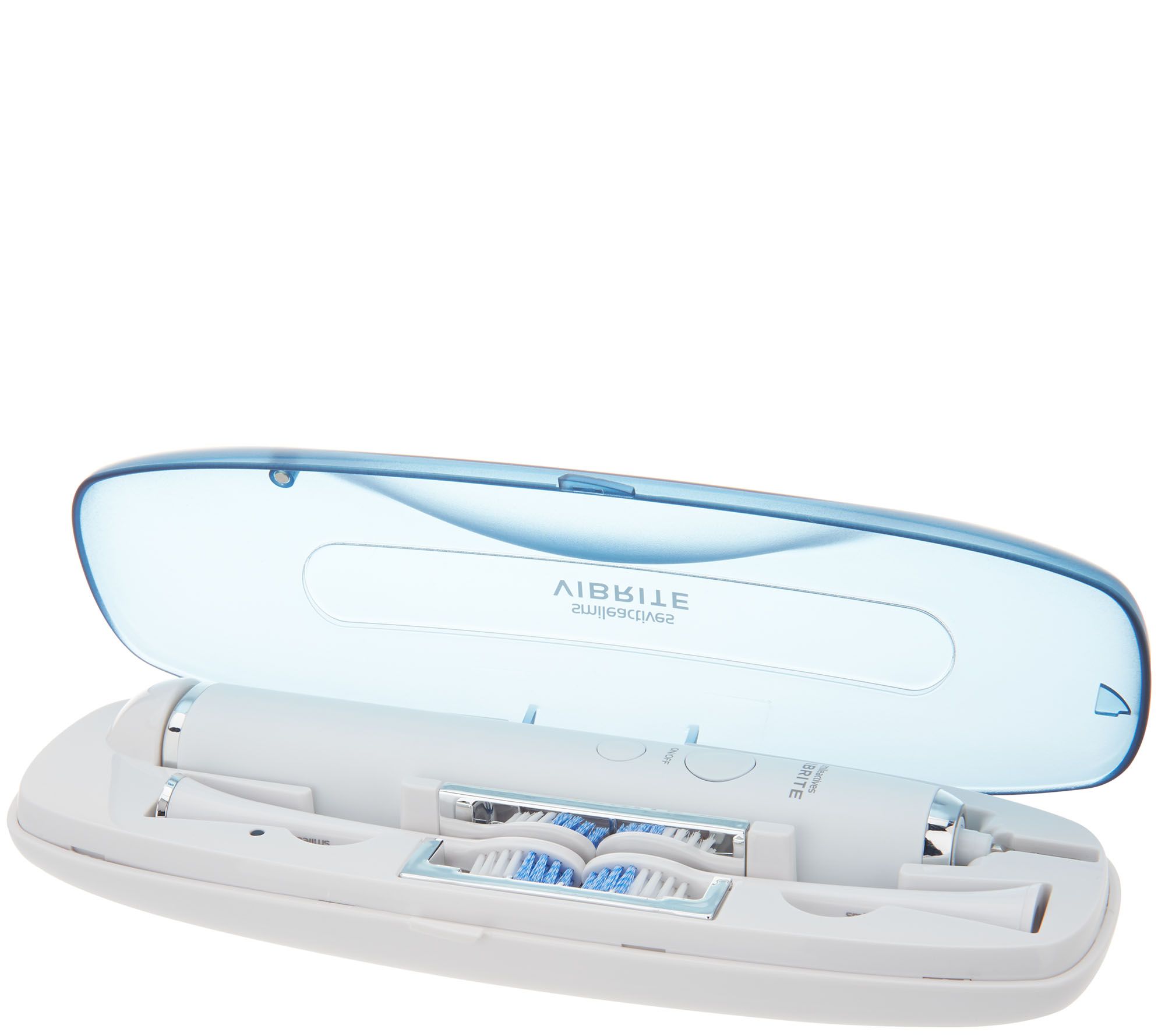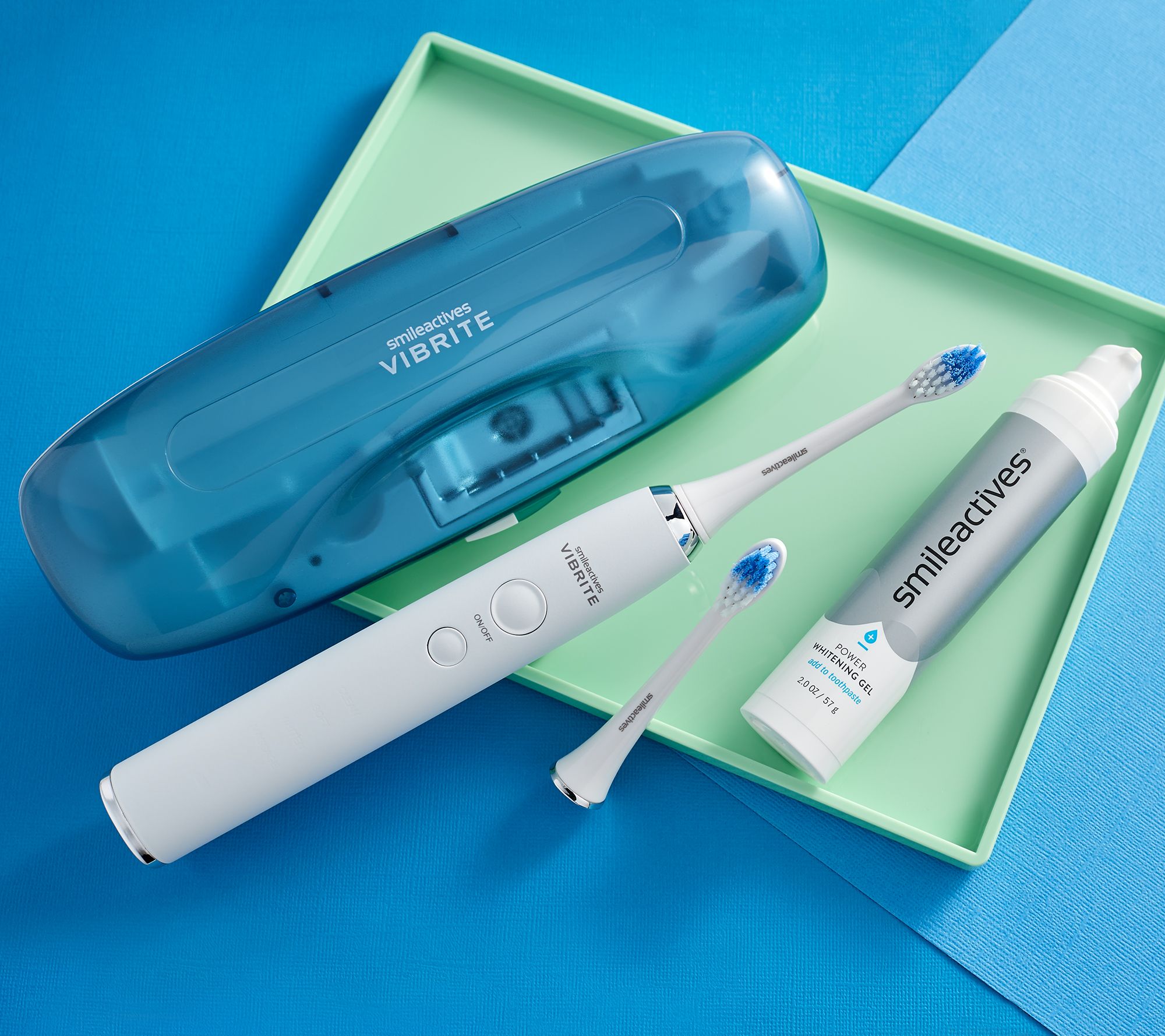 Includes Vibrite Wave Sonic Whitening Toothbrush handle, two brush heads, 2.0-oz Power Whitening Gel, charging case with UV sanitizer, compact charging stand, USB charging cable, and wall adapter