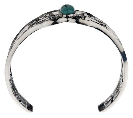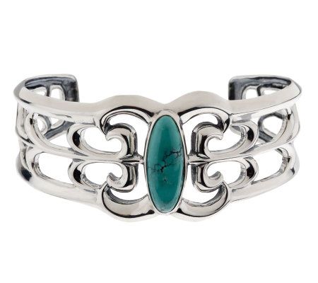 Sensational in silver. An oval bluish-green turquoise cabochon is bezel-set in the center of this sterling silver openwork scroll design cuff. The Smithsonian National Museum of the American Indian serves as inspiration for this stunning piece.