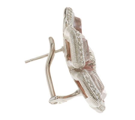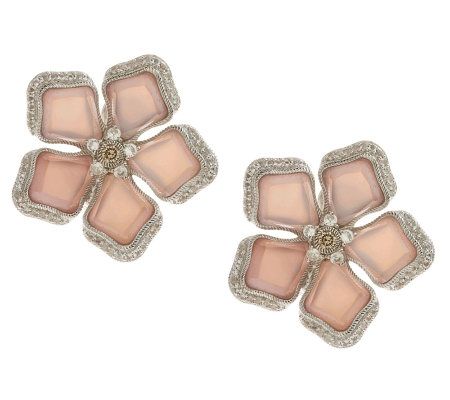 All eyes on your ears. These soft pink shell mother-of-pearl and rock crystal quartz doublet earrings frame your face with delicate blossoms. A bezel-set champagne diamond surrounded by white topaz gemstone petals winks from the center of the bloom. This is the pair that invites a stare. From Judith Ripka.