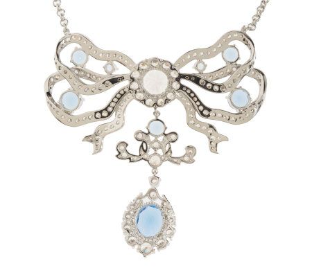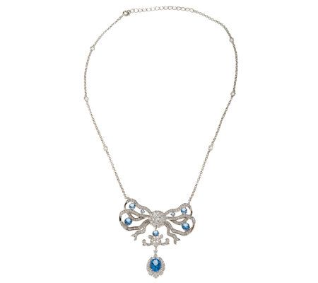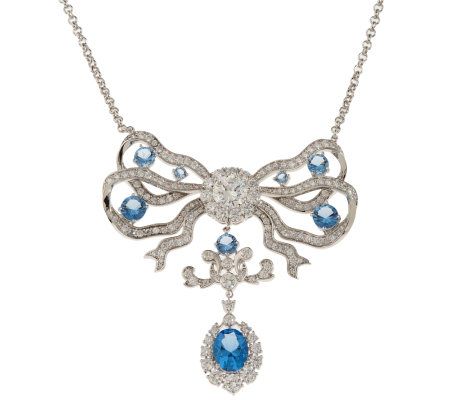 Blue and ribbon never looked better together. For a winning look, this necklace flaunts small, round simulated diamonds set in the ribbon design, while the openwork bow is accented with round, prong-set simulated blue diamonds in various sizes.