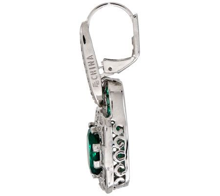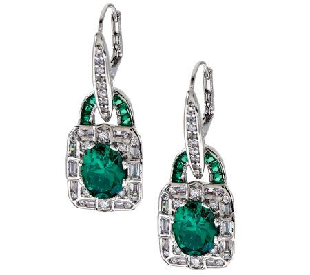 Highly polished; dangle with prong-style set, oval simulated Mackay emerald framed by baguette-cut and round simulated diamonds; dangle loop with baguette-cut simulated emeralds; open scrollwork on gallery and back; lever back with shield on front and bead-set, round simulated diamond accents