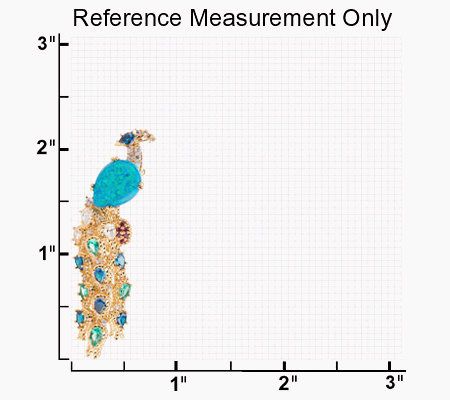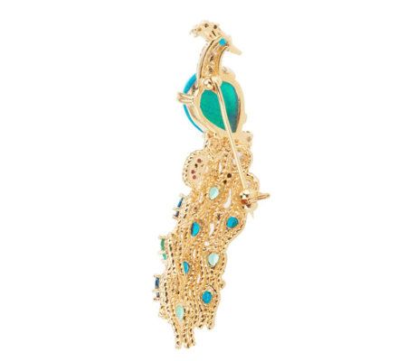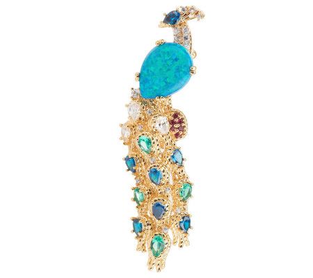 Peacock with pear-shaped simulated opal body; round and pear-shaped simulated gemstones and simulated diamonds for plumage, head, neck, and feet; simulated sapphire eye; gemstones are prong- and bead-set; textured finish