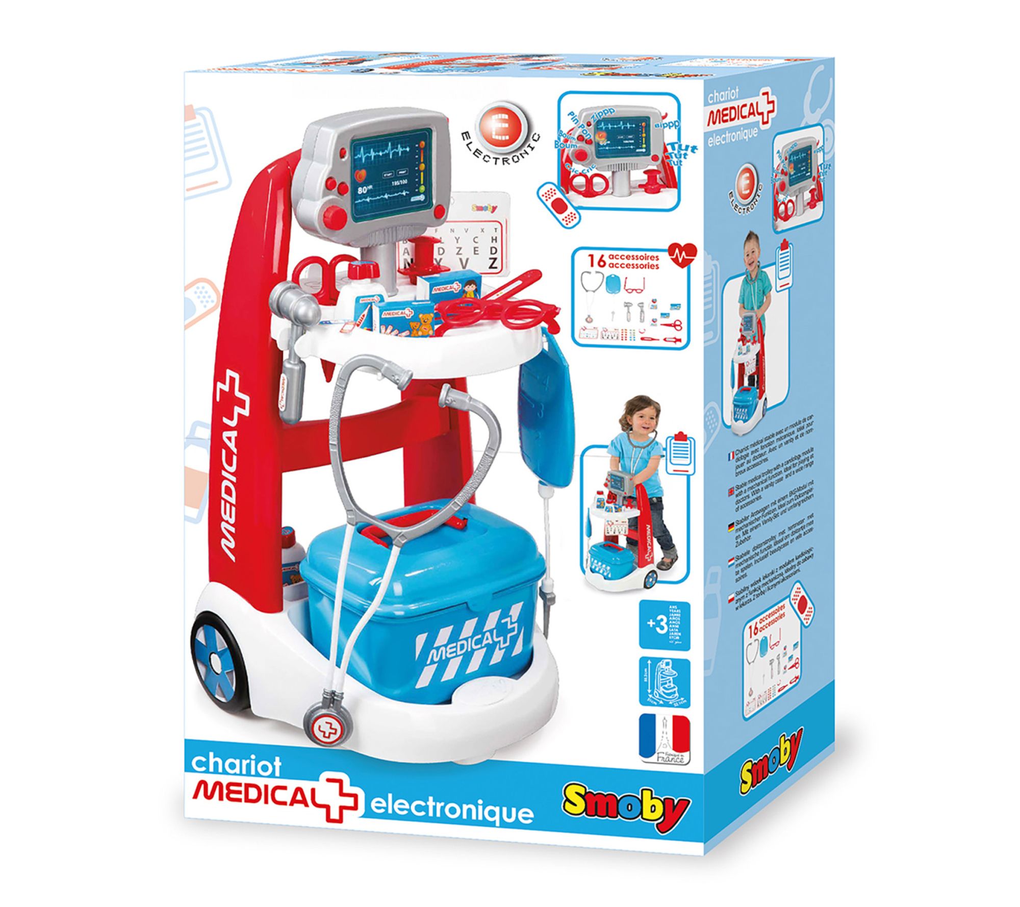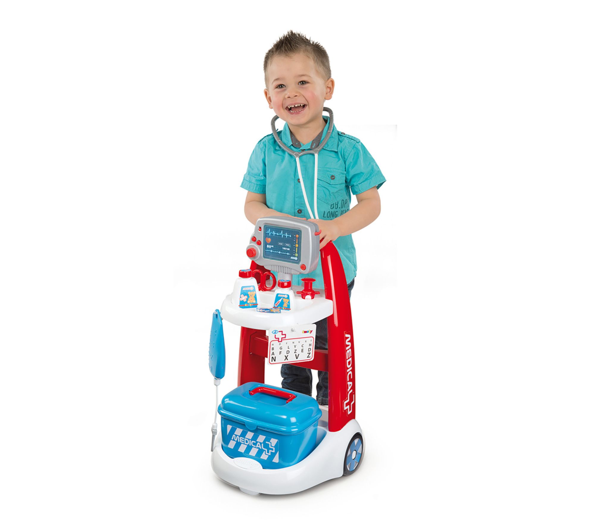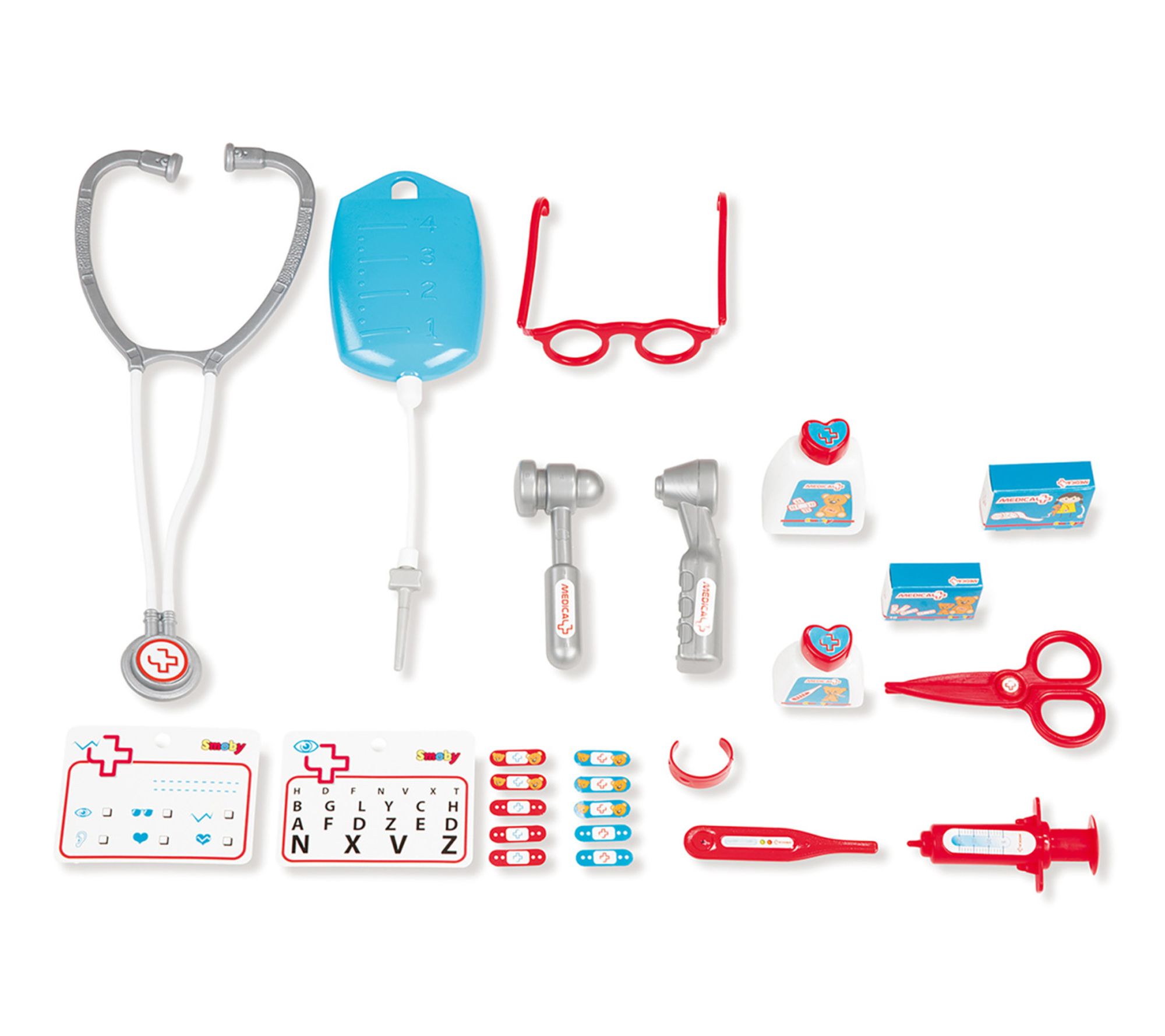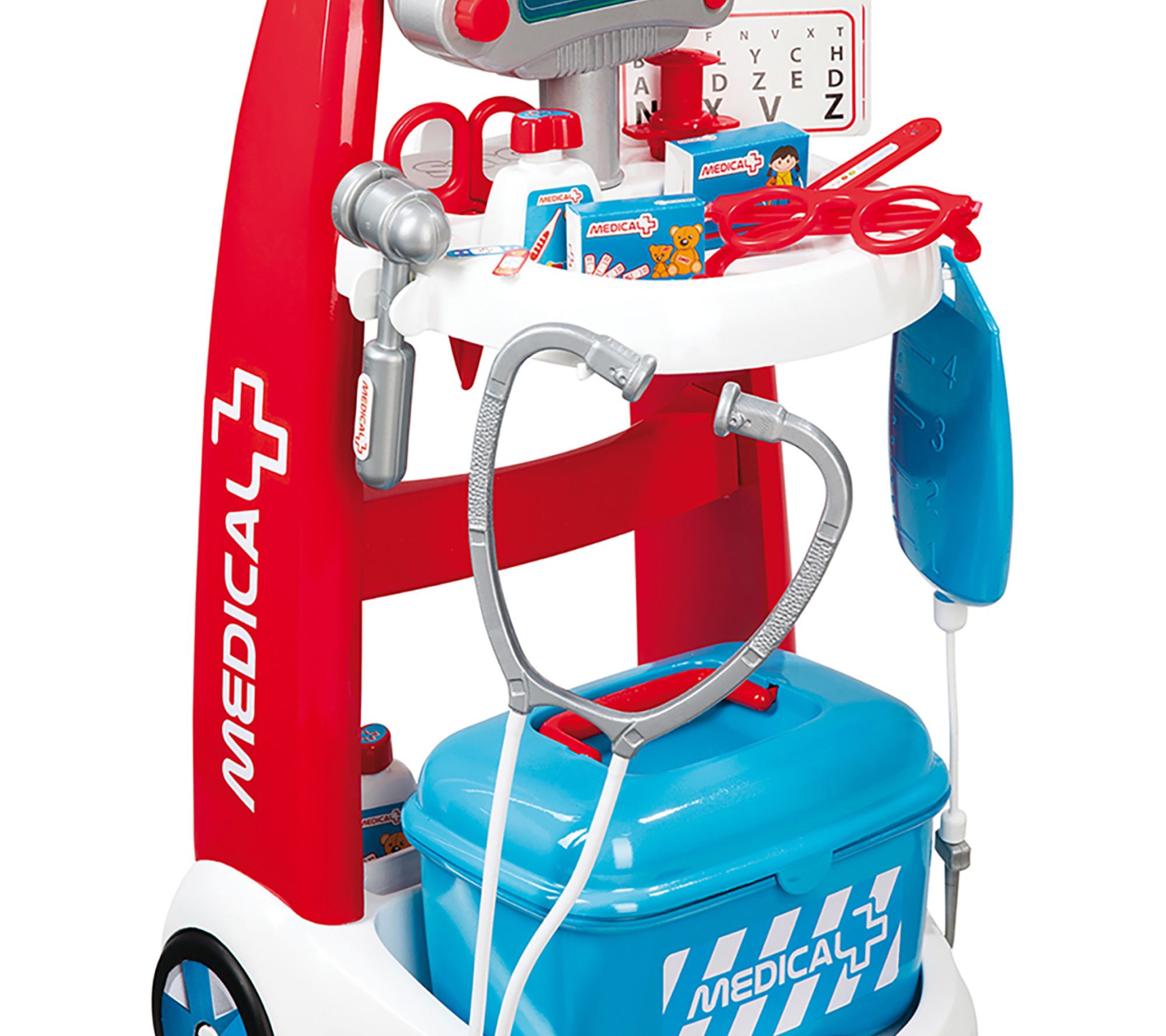 Includes two medicine bottles, syringe, thermometer, two bandage boxes, scissors, otoscope, two cards, stethoscope, hammer, eye test board, pair of glasses, electronic module, and trolley