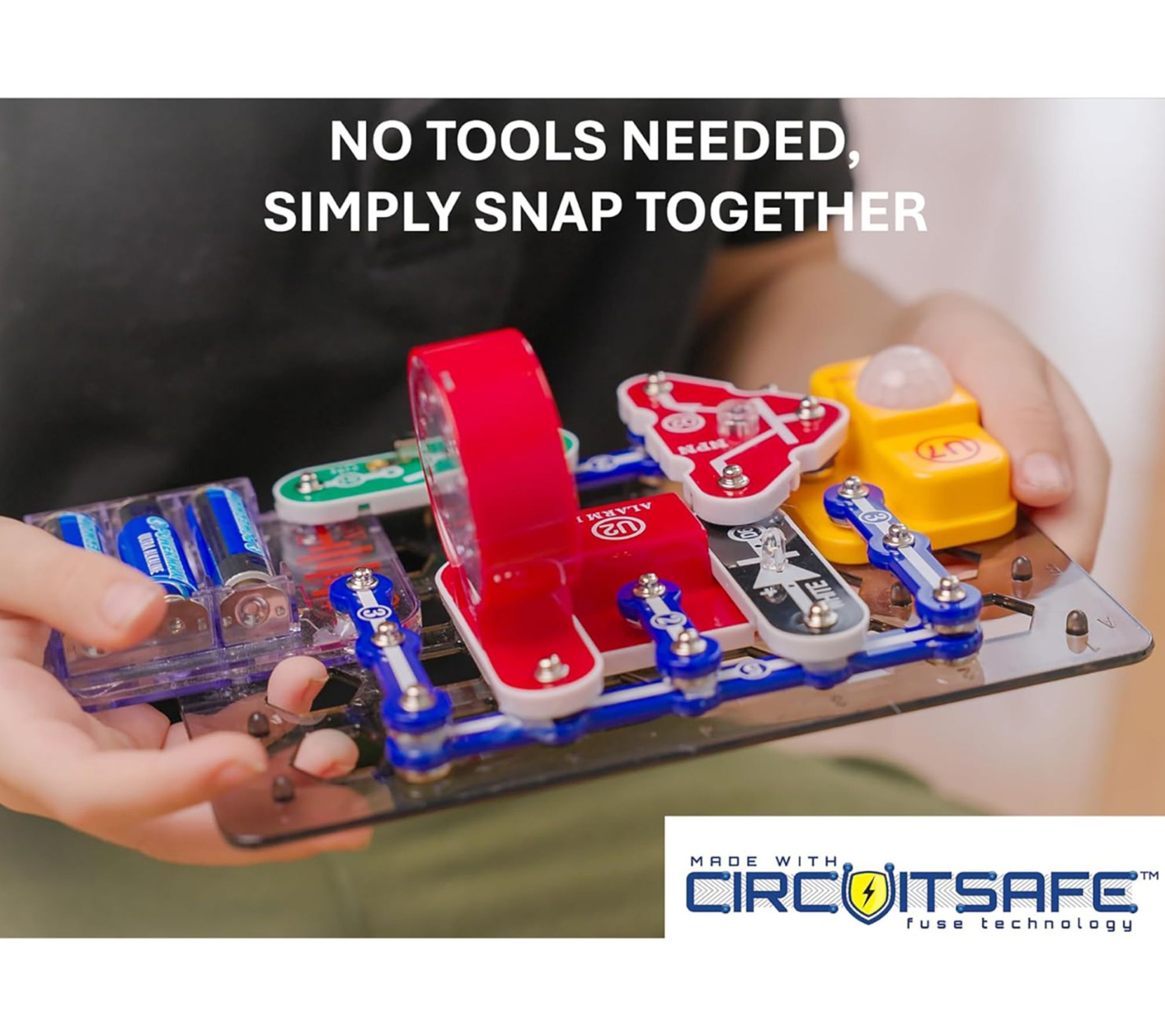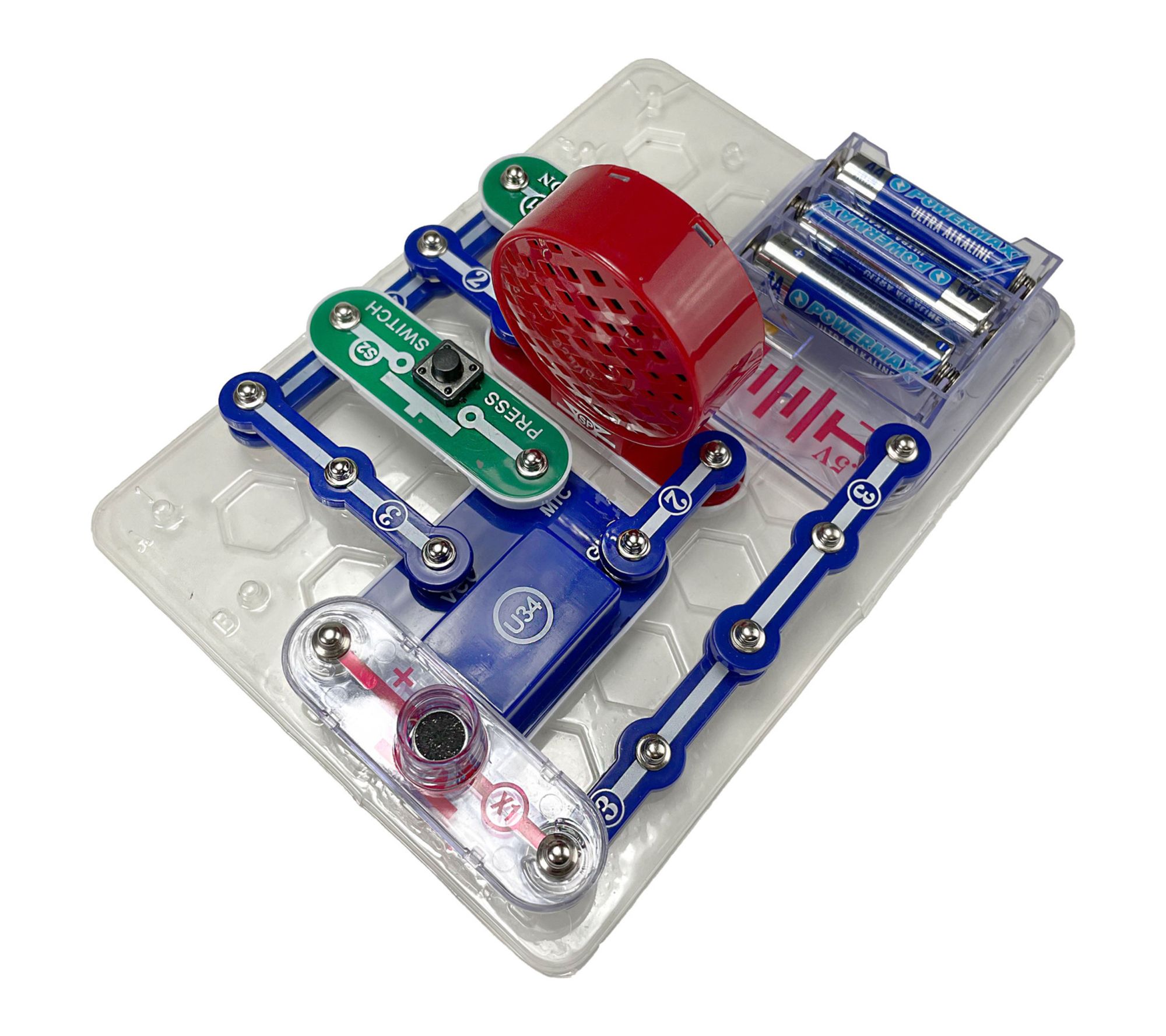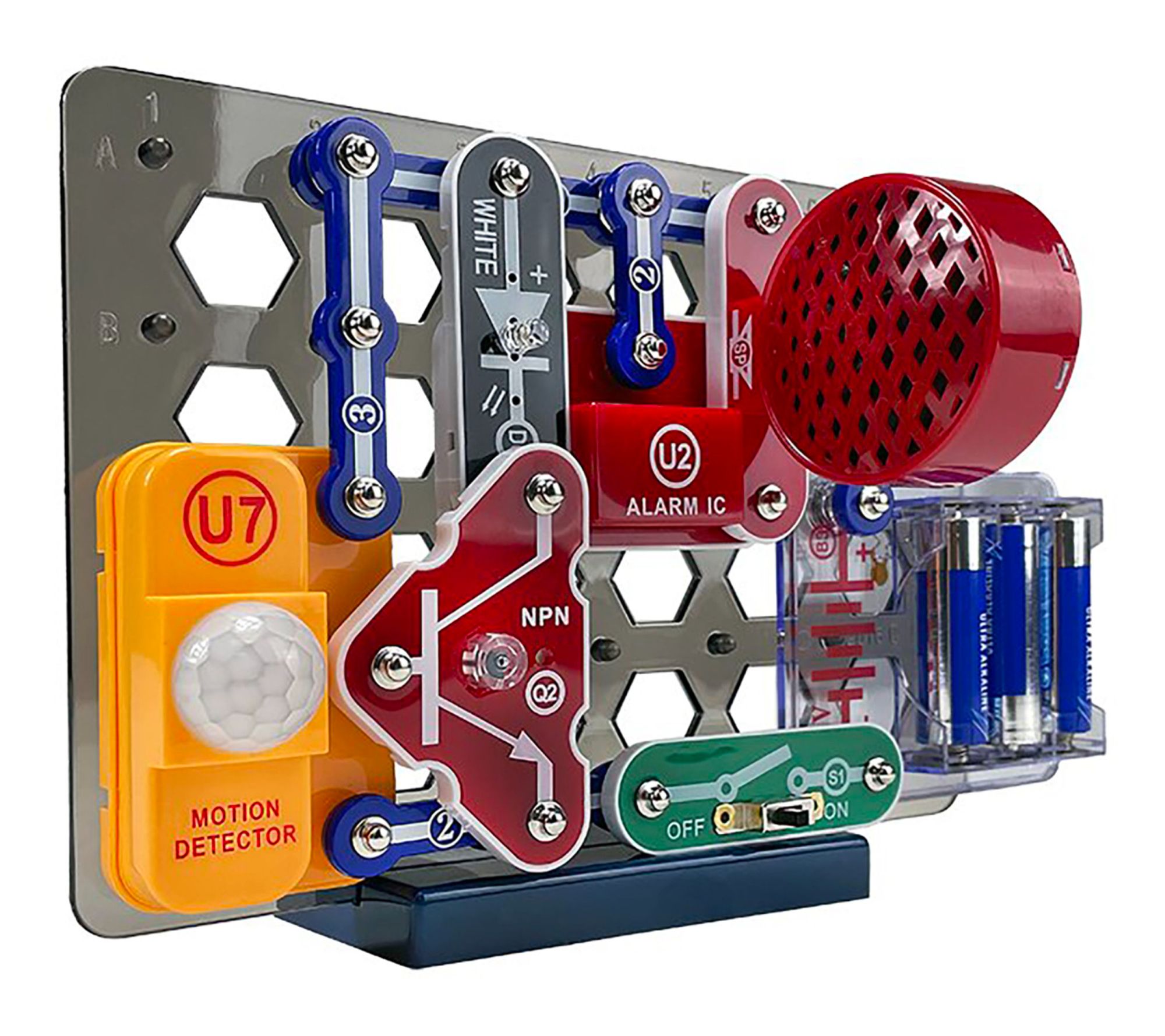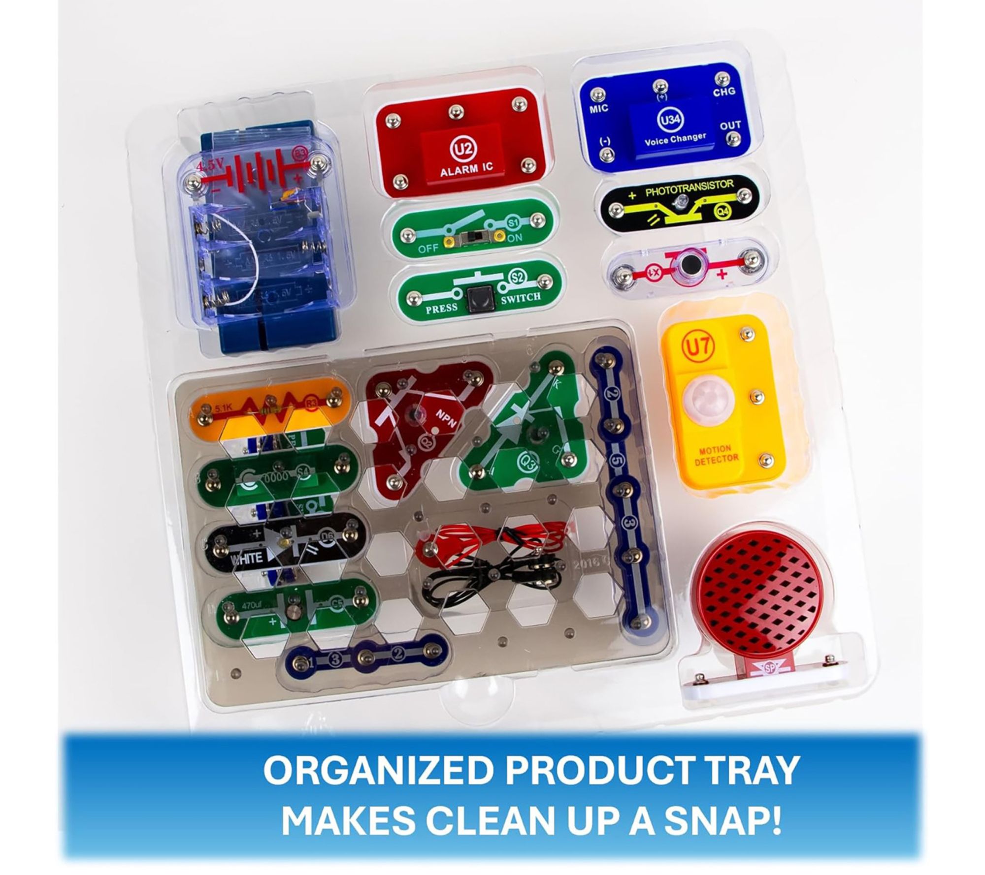Includes base grid, 1-snap wire, three 2-snap wires, three 3-snap wires, 5-snap wire, 3AA battery holder, capacitor 470F, white LED, red/green/blue filters, jumper wire black, jumper wire red, NPN transistor, SCR, phototransistor, resistor 5.1k, slide switch, press switch, vibration switch, speaker, alarm IC, motion detector IC, voice changer IC, microphone, blue stand