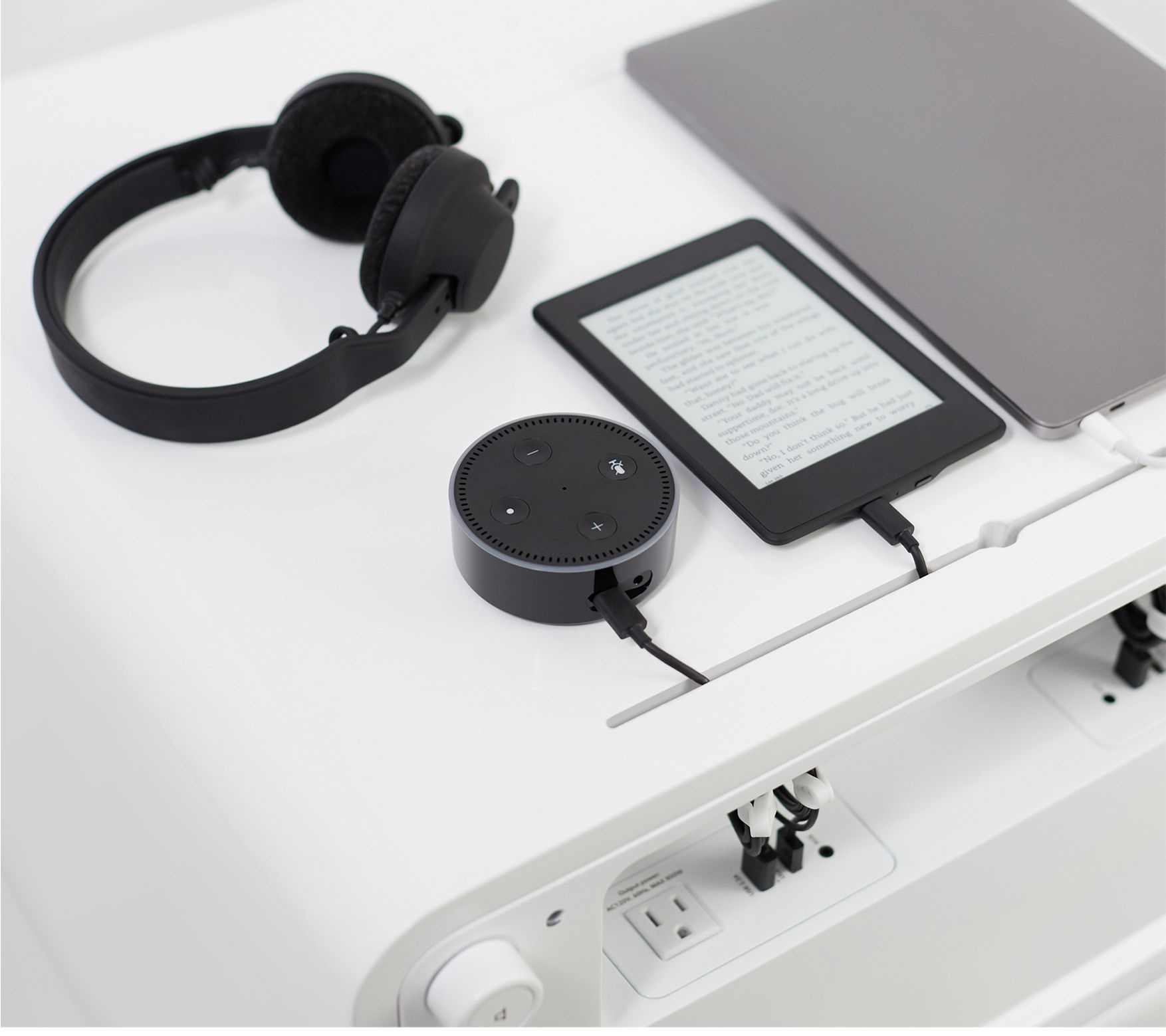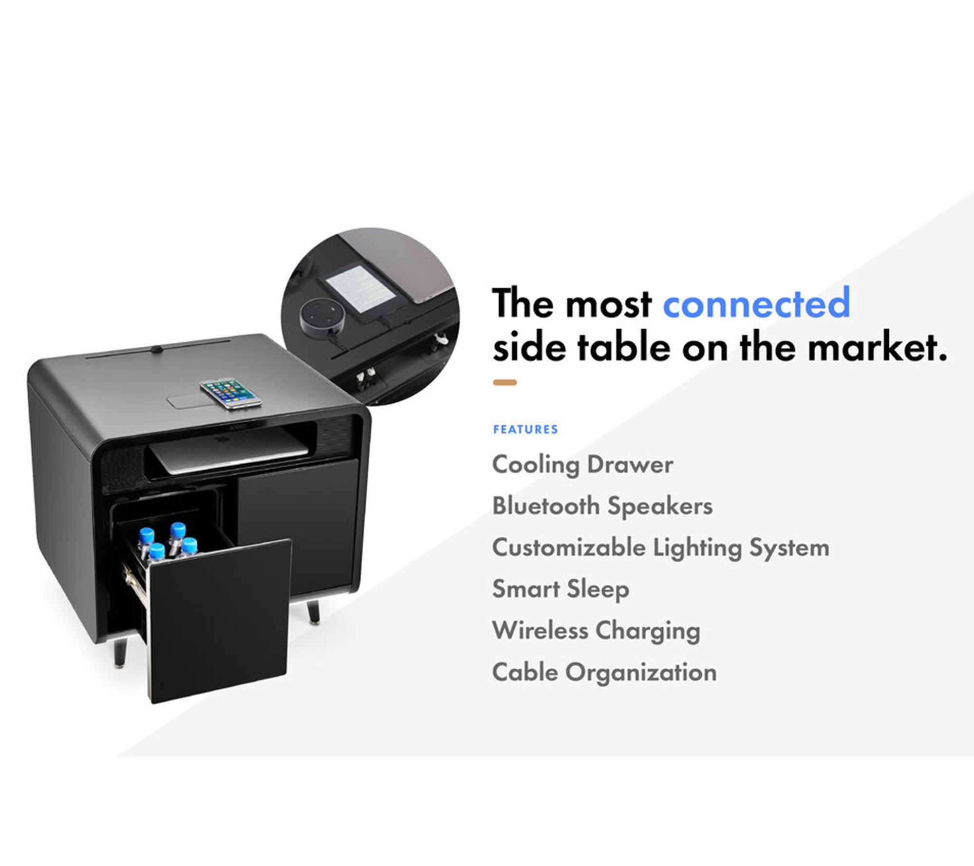 Includes side table, power cord, and auxiliary cord