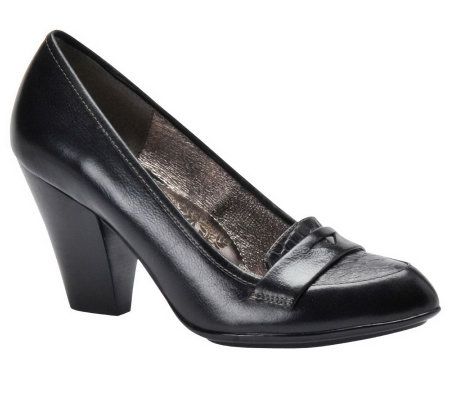 You'll be pretty as a penny in these stylish shoes! Proof that a polished look never goes out of style, the modern loafers flaunt a chunky, stacked heel and sleek leather upper. From Sofft.