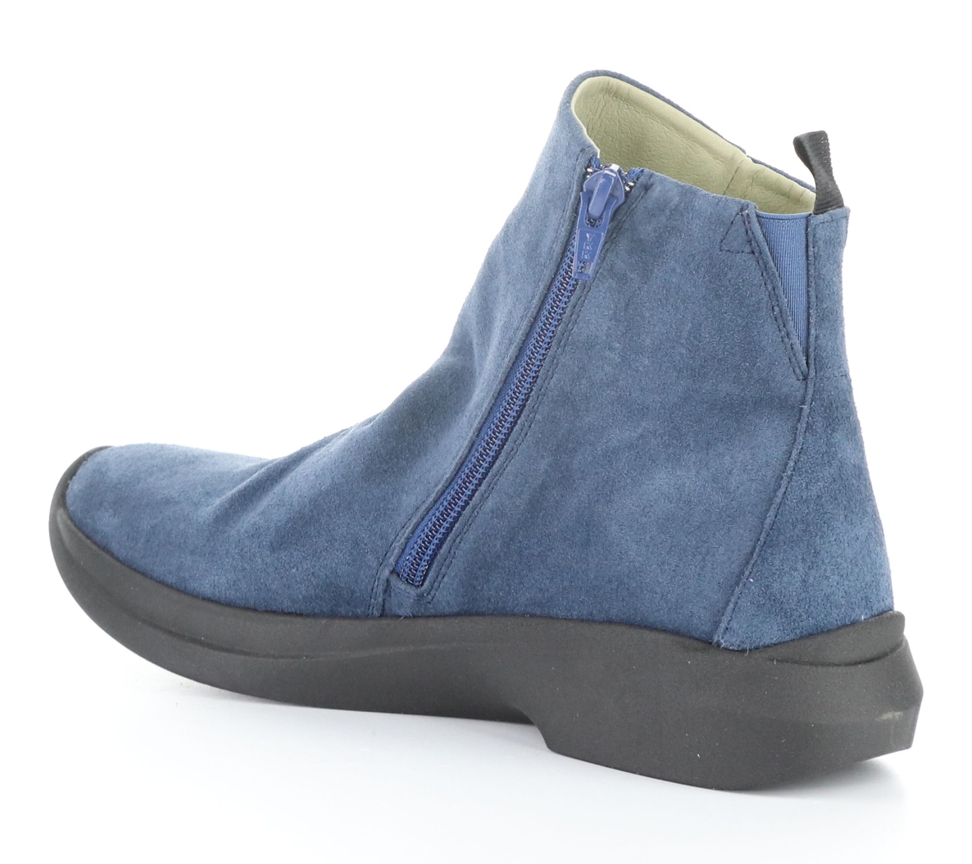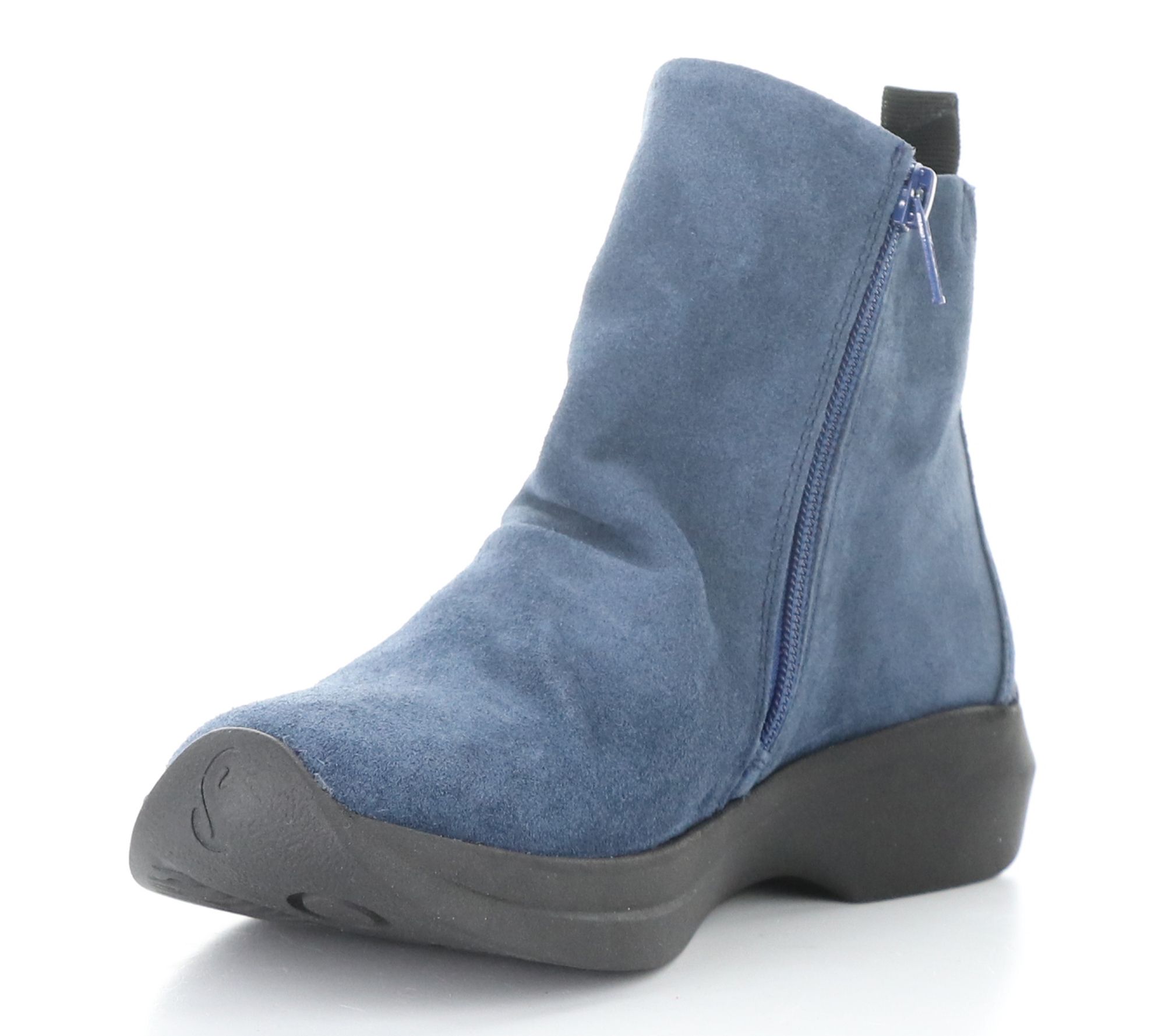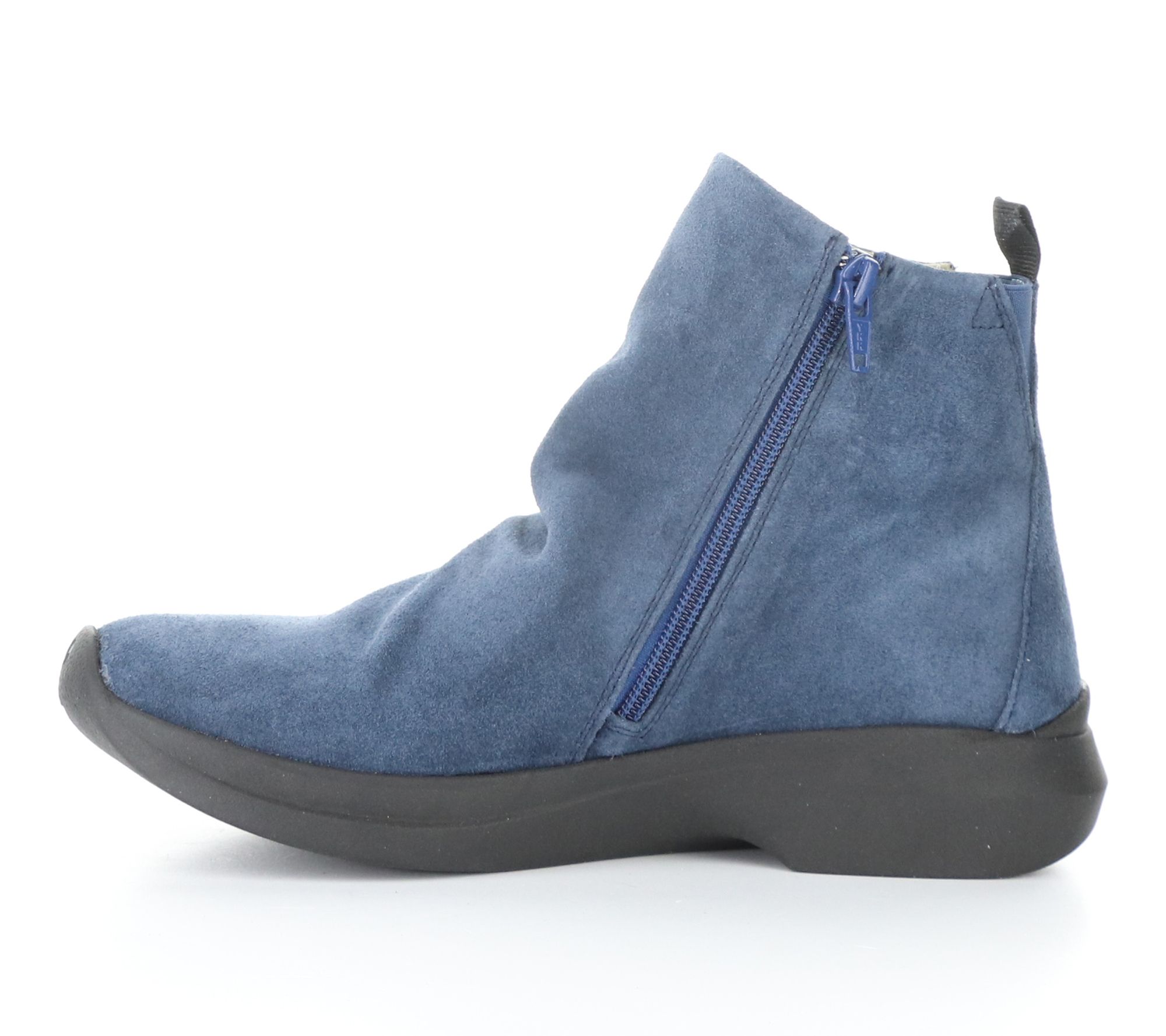 • Suede upper with side zip closure and round toe