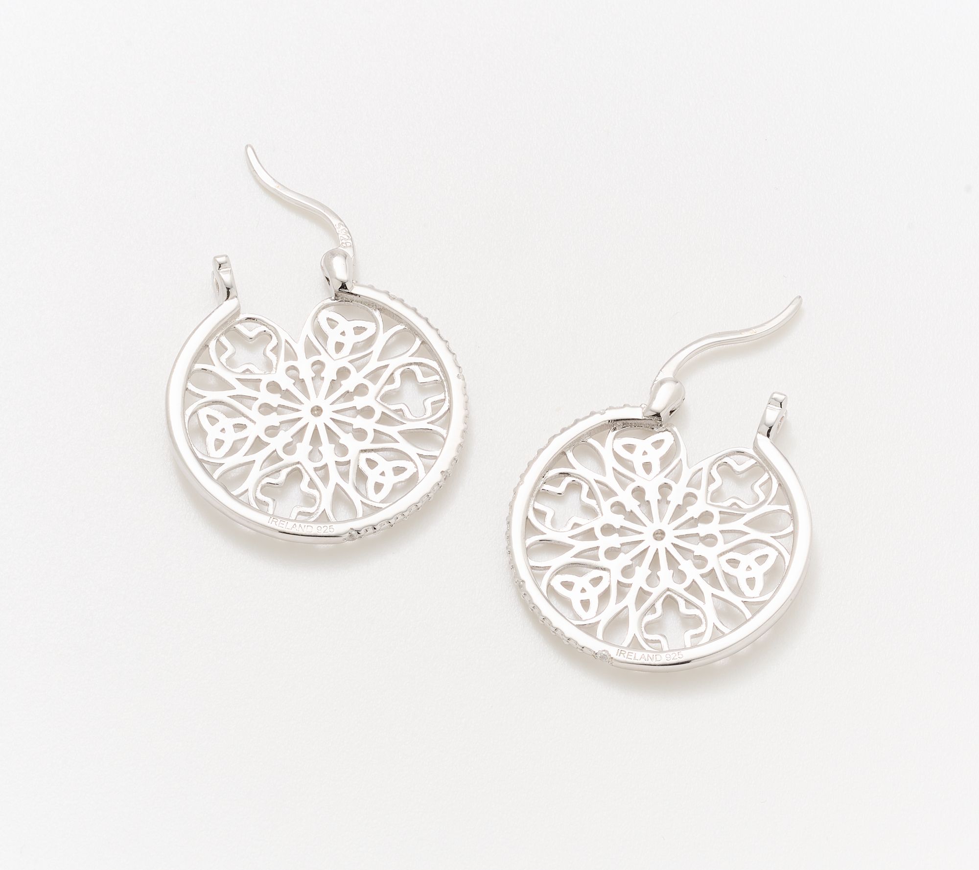 Soft curves and intricate detailing invite you to explore the spirit and tradition of these sterling silver earrings, where a round openwork pattern echoes the wonder of ancient church windows. A single simulated diamond gleams at the center -- making this pair a beautiful finishing touch for special gatherings or adding extra meaning to your everyday look. From Solvar.