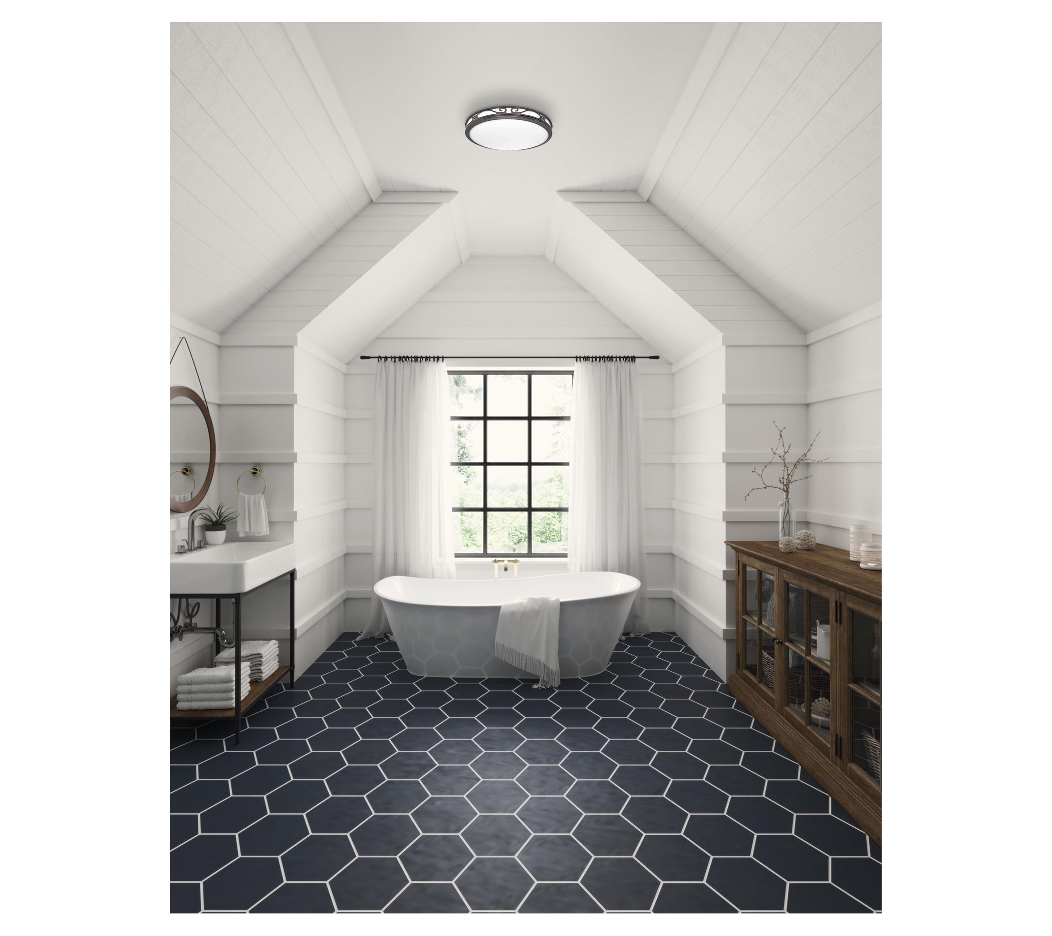 Operating at 3.0 sones with an output of 110 CFM, the Sona keeps air flowing and showcases an imperial bronze finish with sophisticated scrollwork housing, a white glass enclosure, and can be used for overhead illumination or as a nightlight. From Hunter.