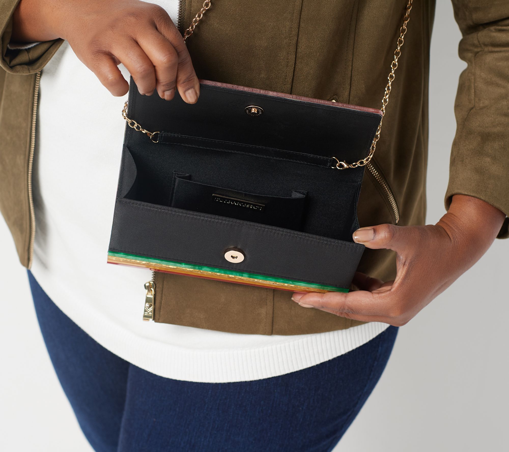 • Foldover entry, magnetic snap closure, multicolor stripe design, optional chain strap