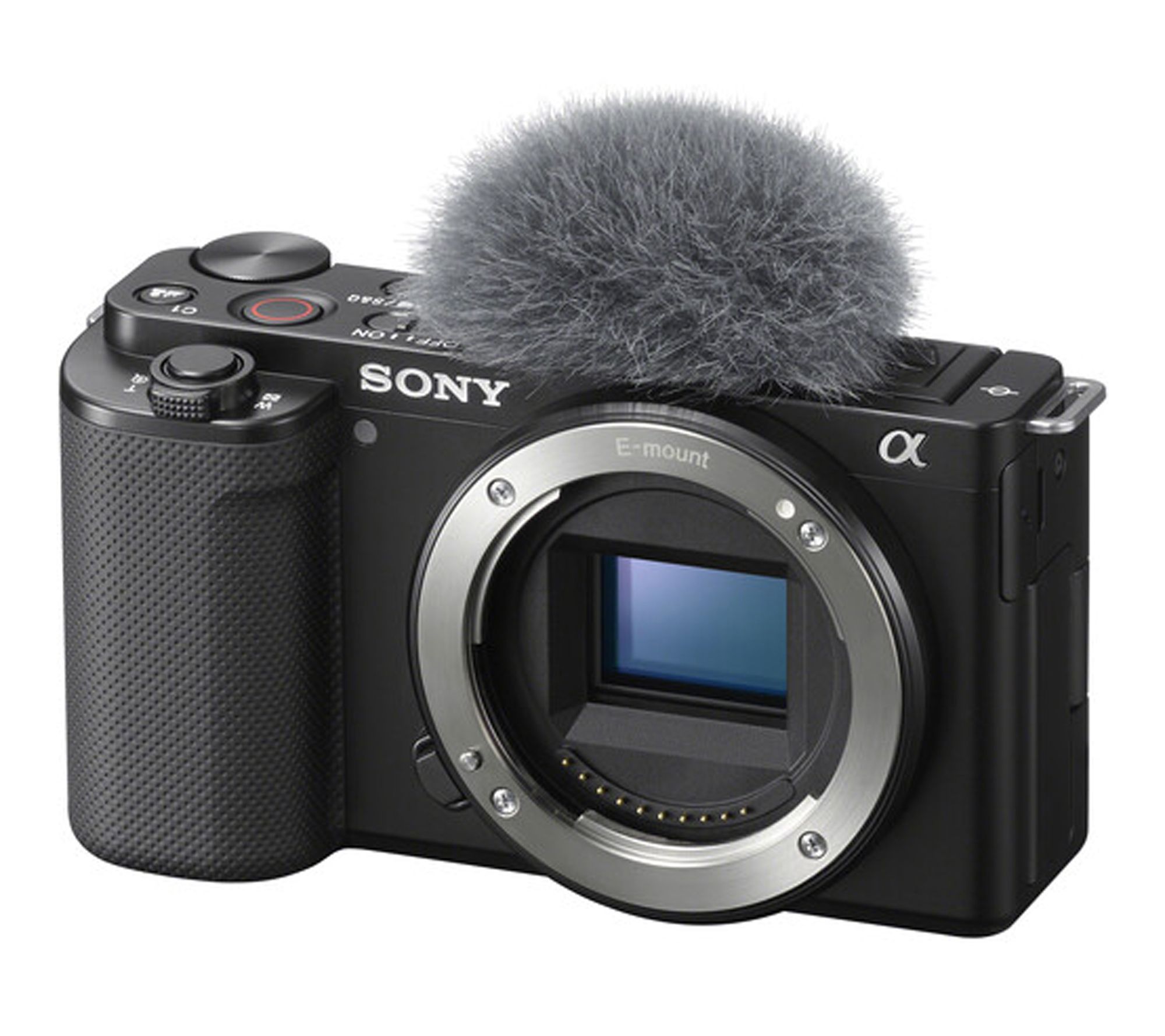 Includes ZV-E10 mirrorless camera (black), body cap for E-mount cameras, AC adapter, USB-C cable, shoulder strap, wind screen, wind screen adapter, and soft case