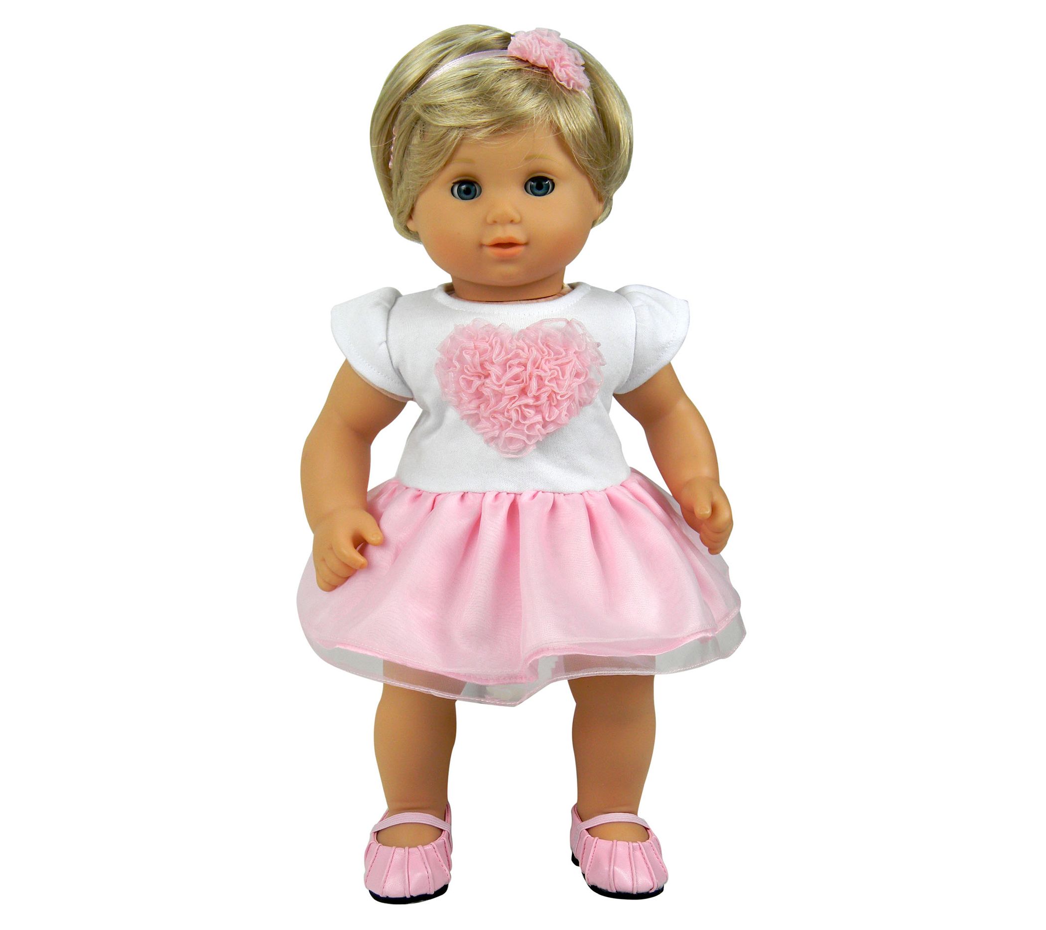 From special occasions to casual playdates, your child will love dressing their 15" doll in this frilly frock featuring a pink satin and tulle skirt and white top embellished with a pink heart. Don't forget the matching headpiece! From Sophia's.