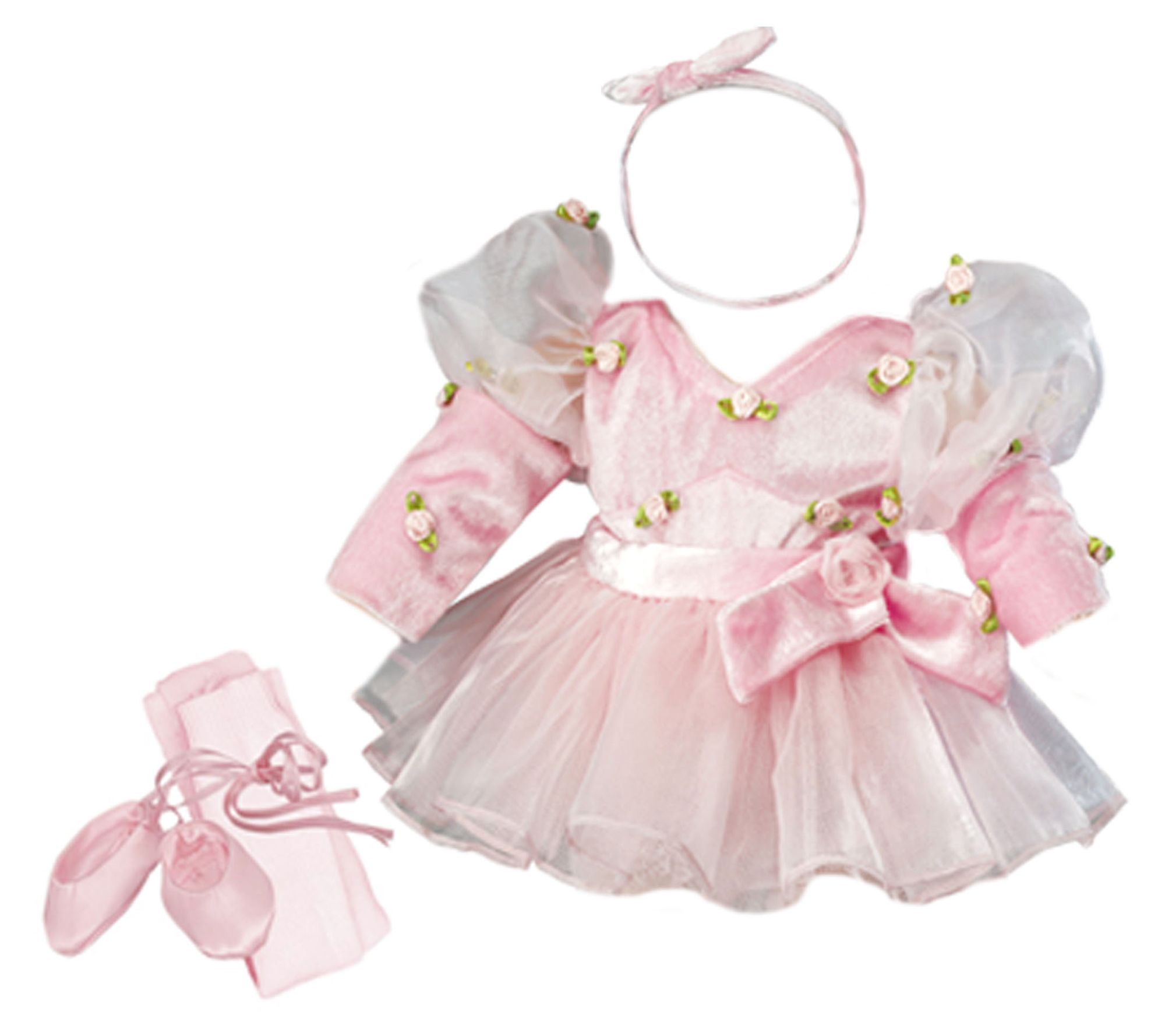 INCLUDED: This 5-piece ballerina set includes a leotard, tutu, tights, slipper and headband. REALISTIC DETAILS: This complete ballet costume features a full tulle tutu with a velour waistline, a velour leotard with decorative rose appliques and dainty organza sleeve caps. Accessories include a velour bow headband, pink tights, and slippers with ribbon ties. PERFECT FOR KIDS: Kids can channel their imagination while dressing their dolls in this complete ballet recital costume.;a leotard, tutu, tights, slipper and headband.