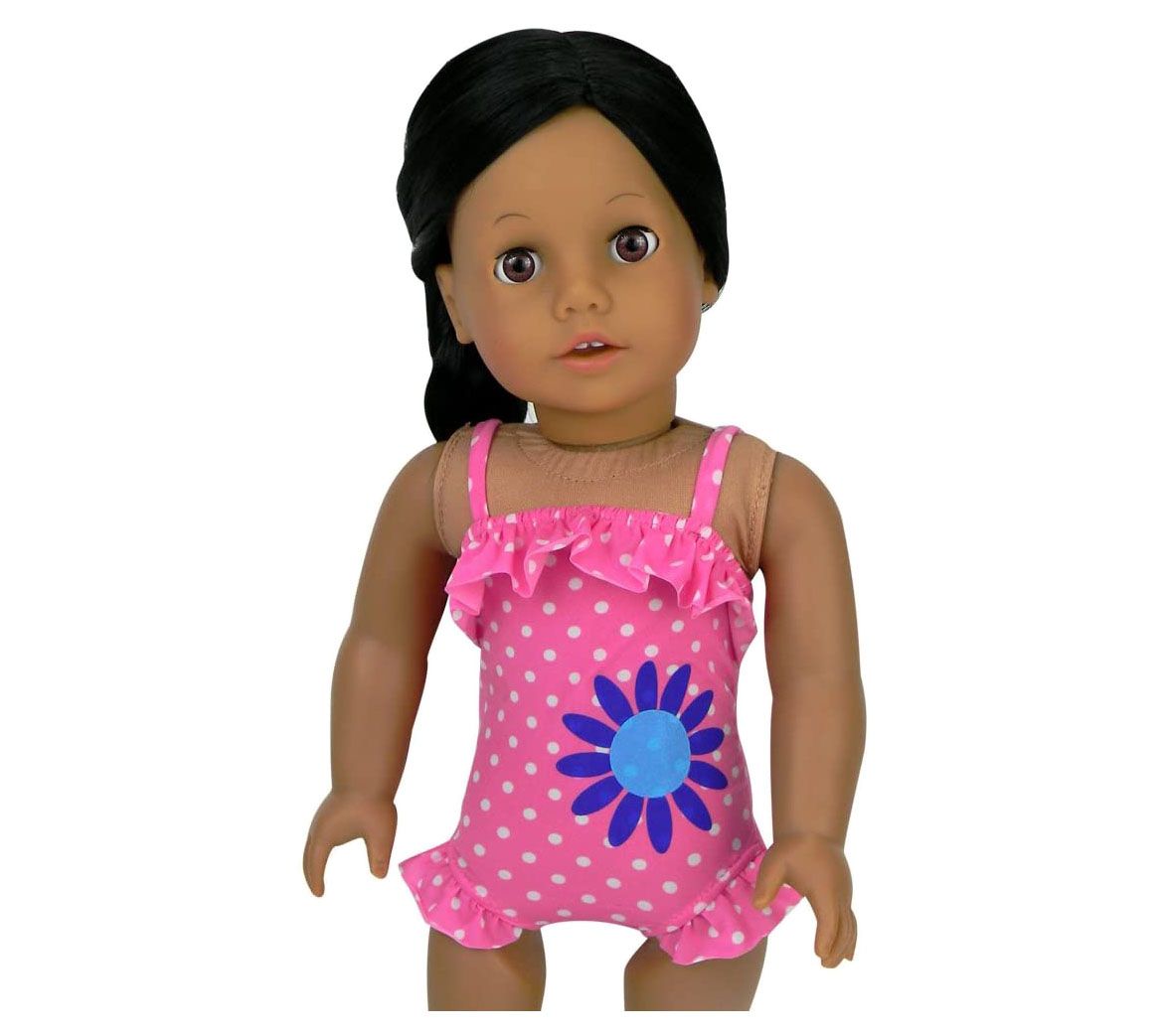 Surf's up and your 18" doll is ready to dive in with this cute set that includes a pink ruffle polka dot bathing suit and a fun, colorful inner tube. From Sophia's.