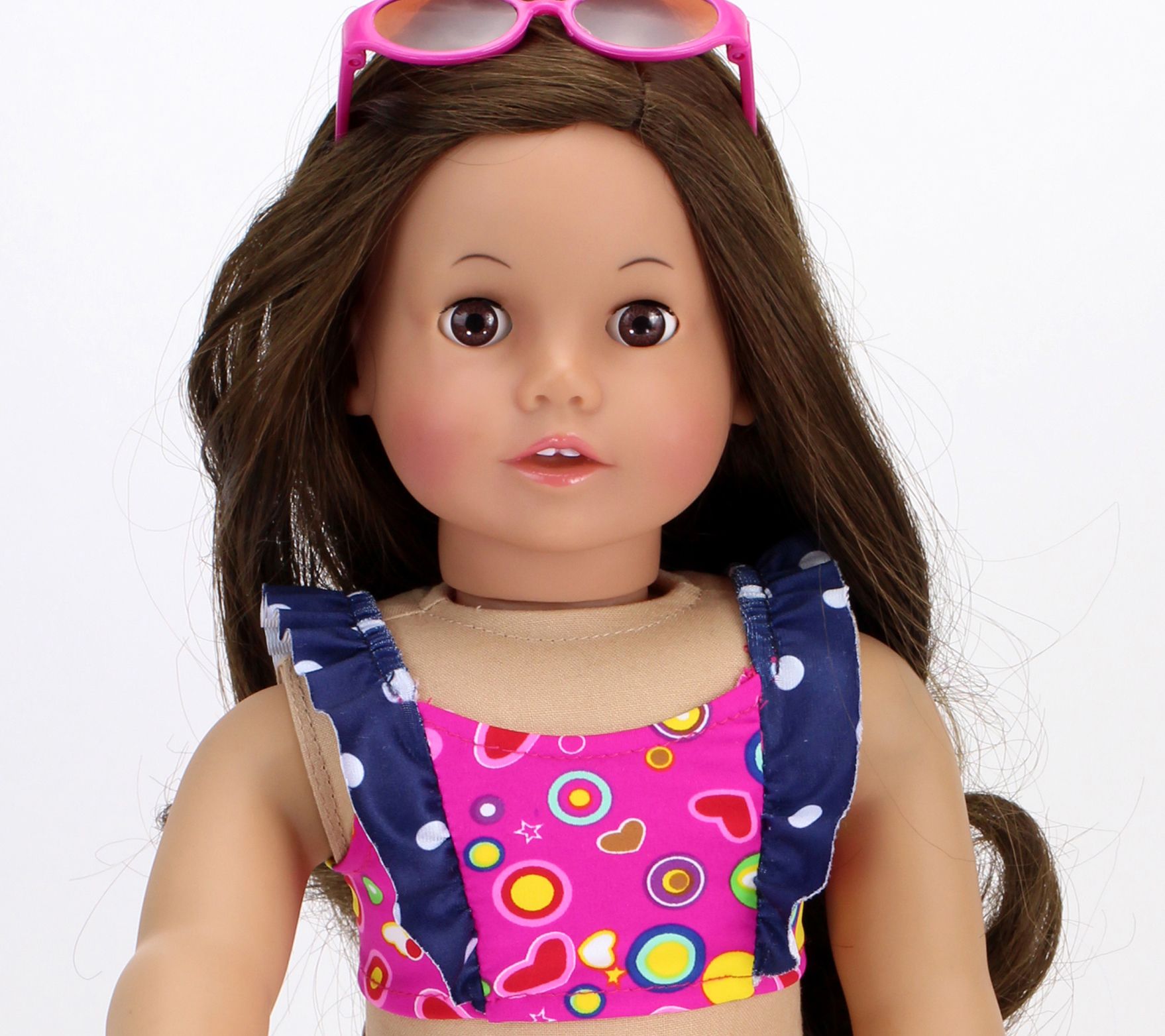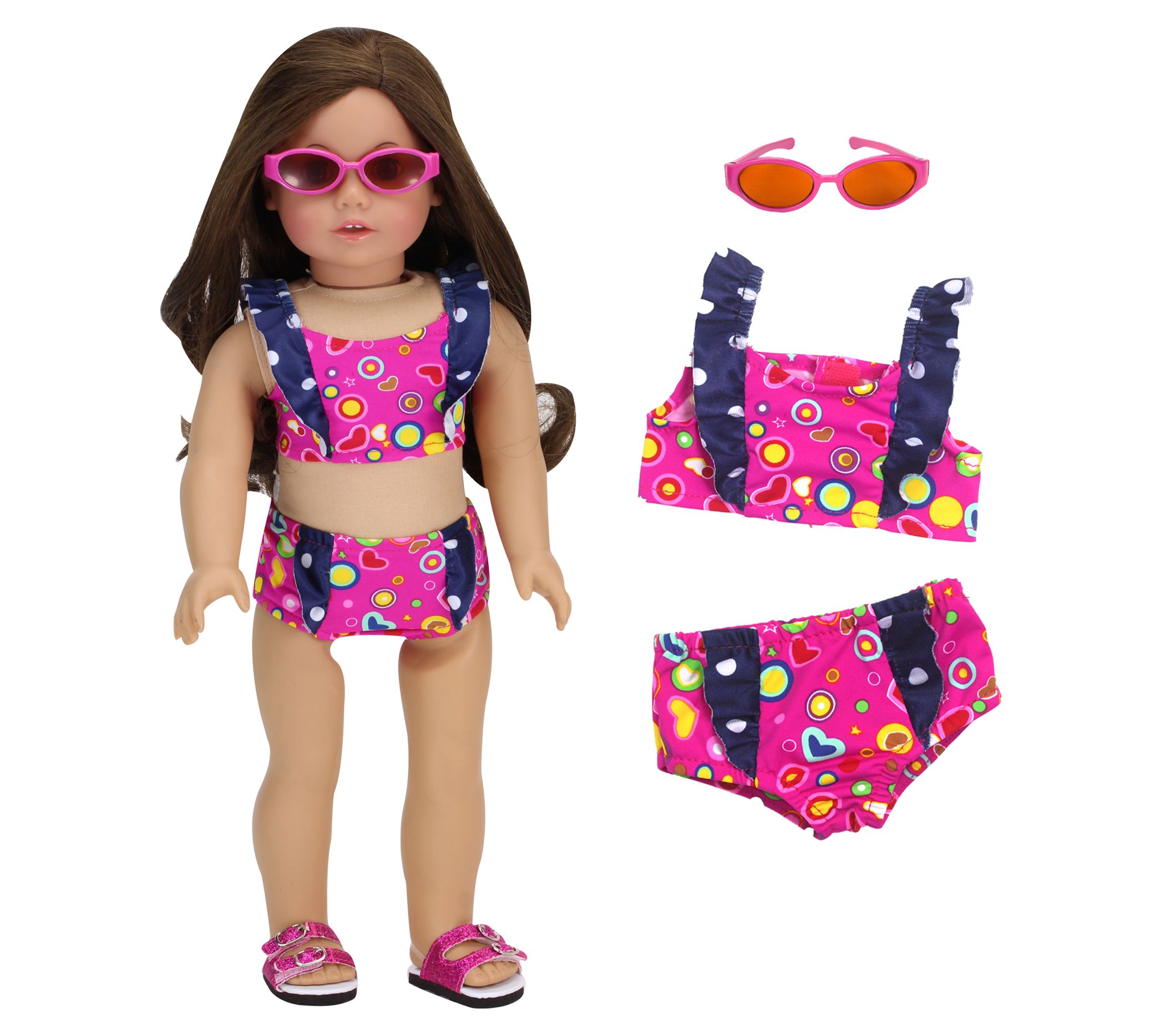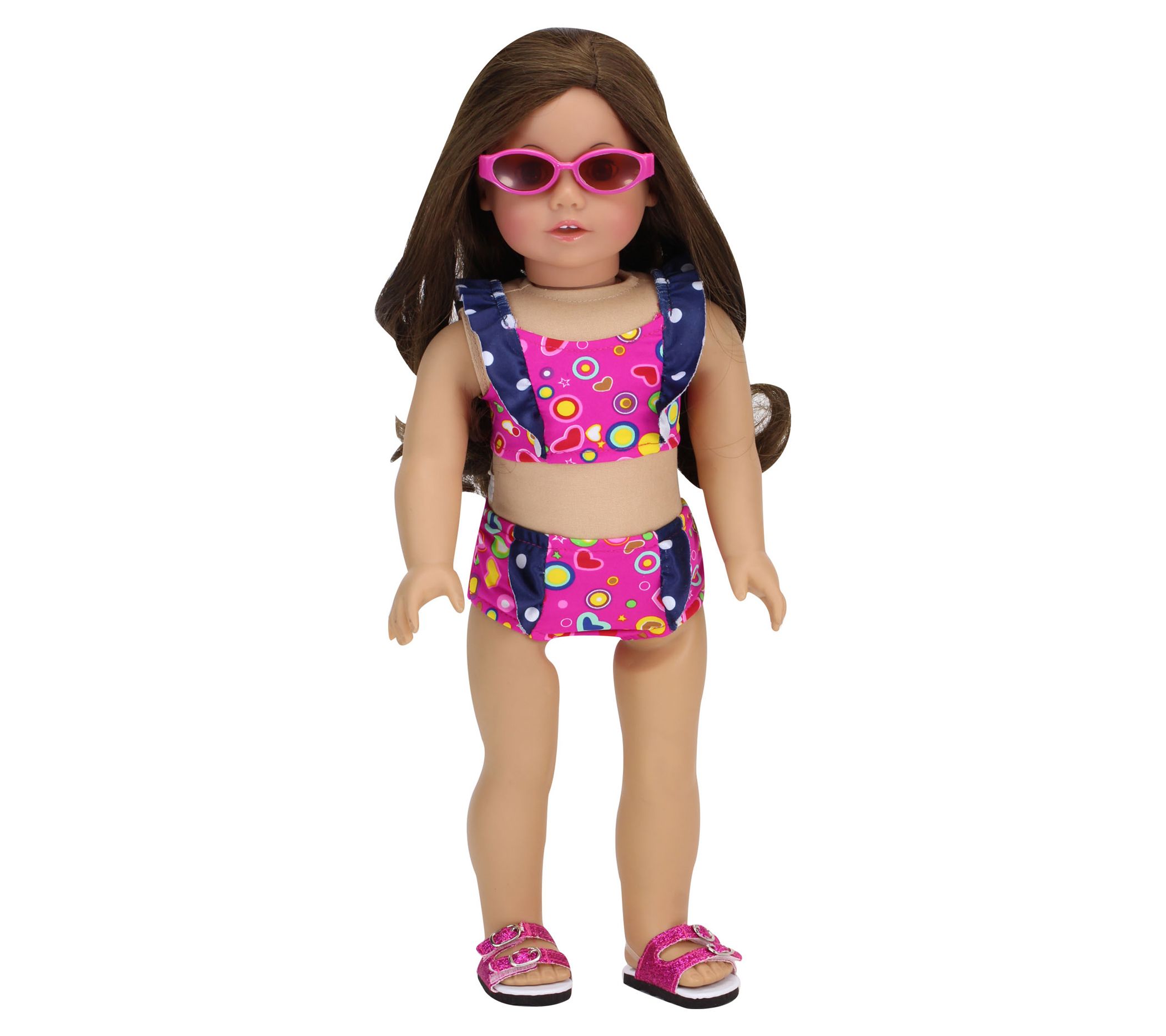Make a splash! Your little will have even more fun in the sun when they dress their 18" doll in this swimming ensemble. The set includes a colorful bathing suit top, bikini bottoms, and matching hot pink sunglasses. From Sophia's.