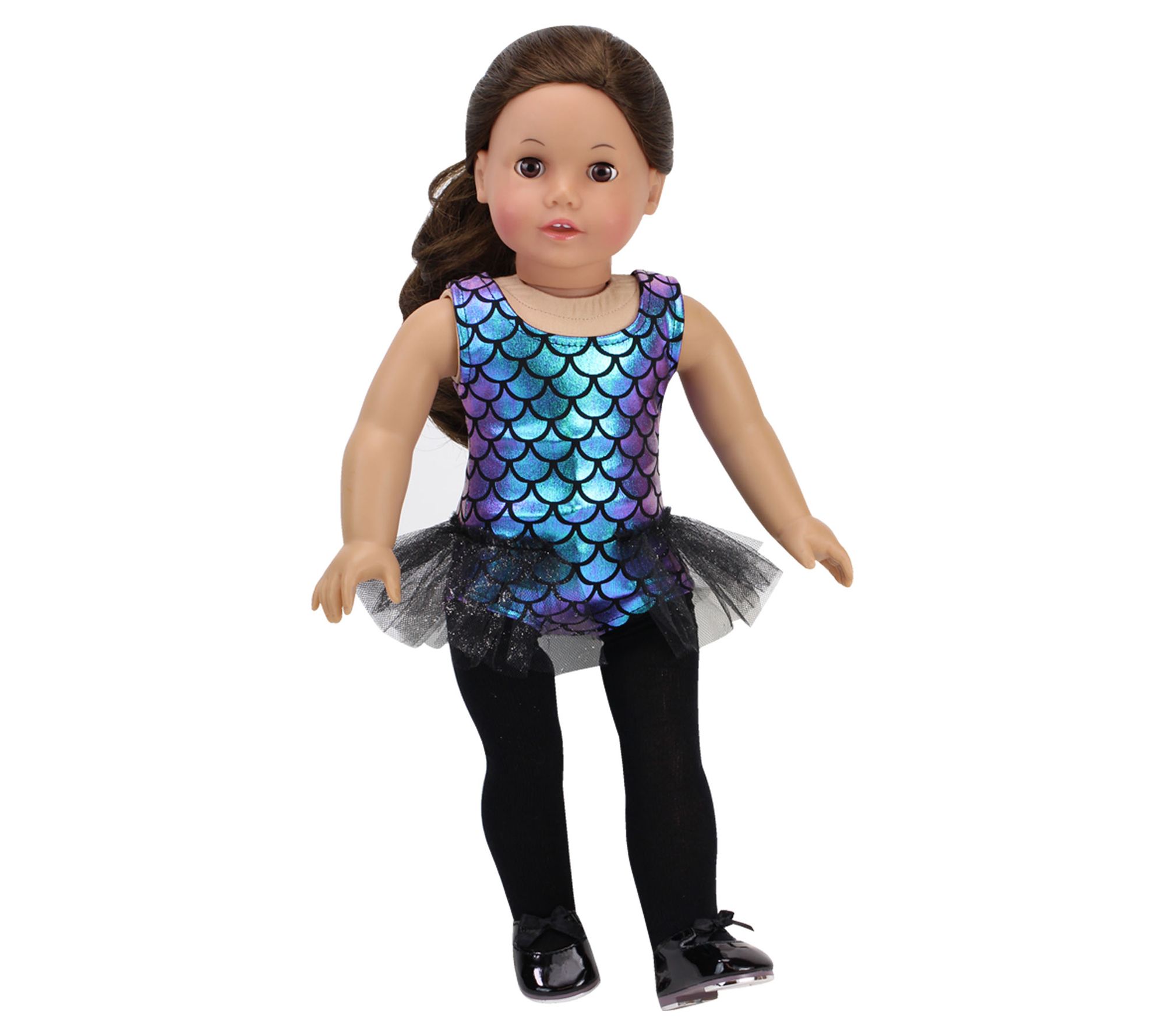 INCLUDES: This 2-piece set includes an iridescent jazz leotard plus black tap shoes. QUALITY DETAILS: Easy-to-dress leotard features an attached black organza tutu. Patent leather jazz shoes include a satin bow for a Mary Jane look, and metal looking, "tapping" soles! MADE FOR 18" DOLLS: Perfect for Sophia's dolls, American Girl dolls, My Life As dolls, Our Generation dolls, plush friends, and more. (Dolls not included.);a jazz leotard, and black tap shoes.